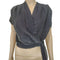 1970s metallic glittery cropped short sleeve top in a black and shiny silver metallic thread. Crossover v neck banded at the waist with a snap closure on the inside and long ribbons to tie at the side. Pleated shoulders tapper into the fitted waist.