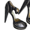 MICHAEL Michael Kors black peep toe platforms high heels. Chic punk style metal detail on suede above the foot. White seam detail around heel and base of shoe. Ankle strap with buckle. Cone heel.