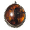 Vintage round amber silver tone metal pendant on black thick ribbon tie-on necklace. Large round thick shape amber piece is inlaid on a silver bed with a micro beaded edge. A stationary metal hoop holder affixes this pendant to the ribbon. Looks as though it was made in Mexico because its not as heavy as the silver one I have listed here as well, might be a silver tone metal covered in silver but I don't really know.