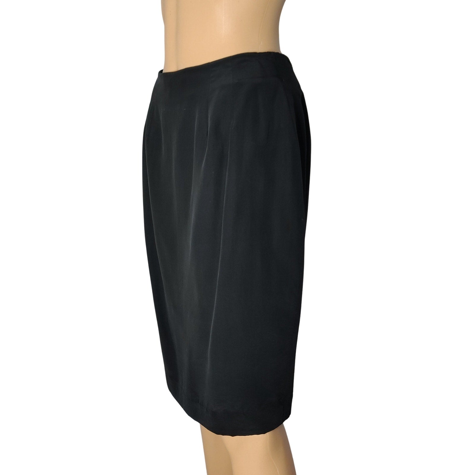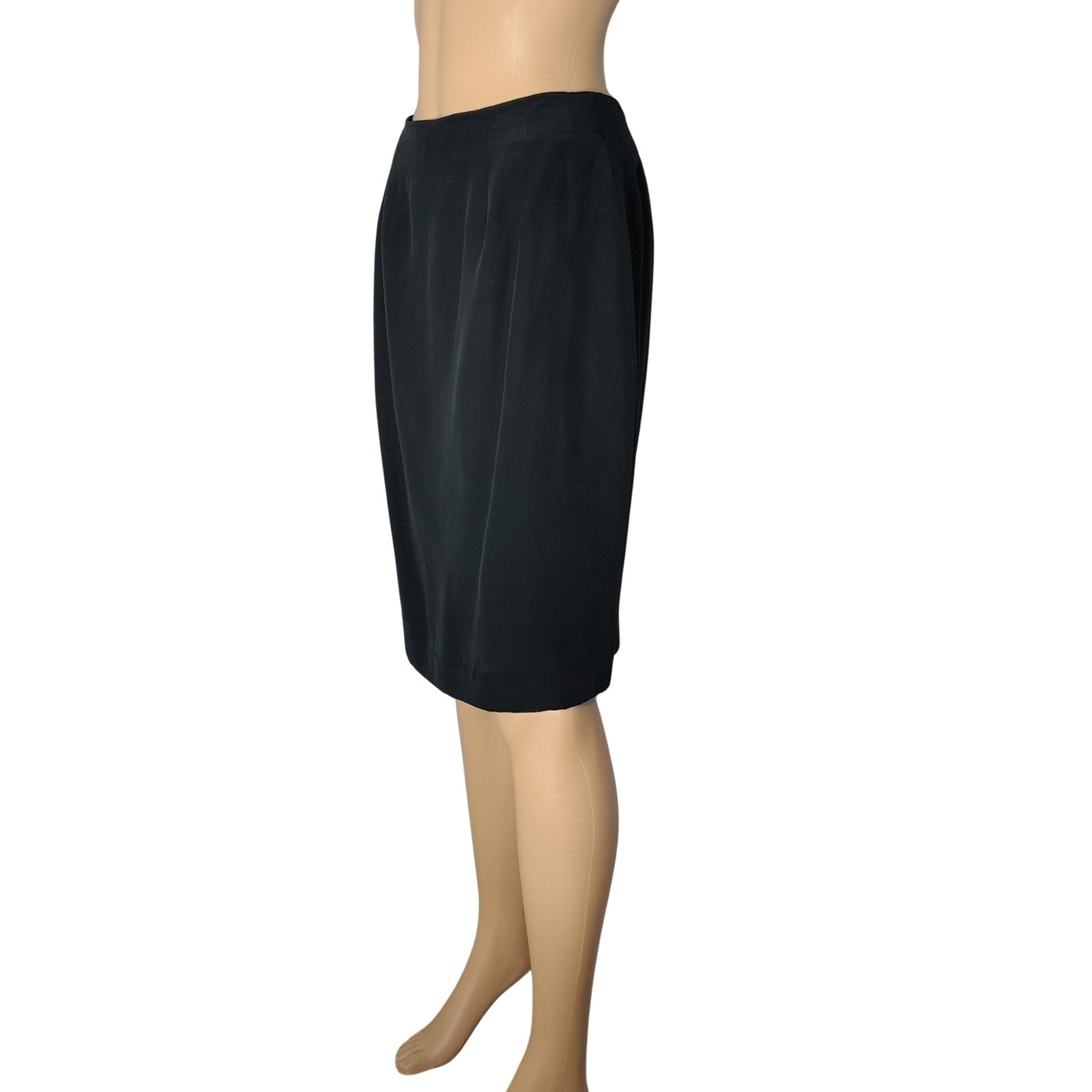 1990s 100% Silk Lined Black Pencil Skirt Back Zipper Back Slit. Two darts on the front and back of each side of the hips.