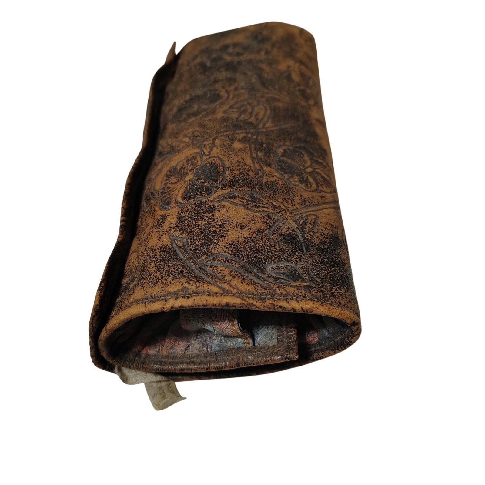 Antique 1900-1920 Tooled Floral Leather Celluloid Manicure Set Travel case. Fold over wallet with two adjustable straps Eleven beauty tools secured into their own custom place. Two snap closures on the outside panel plus one on the strap holding the nail buffer in place.