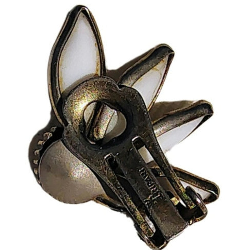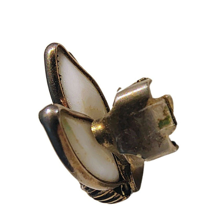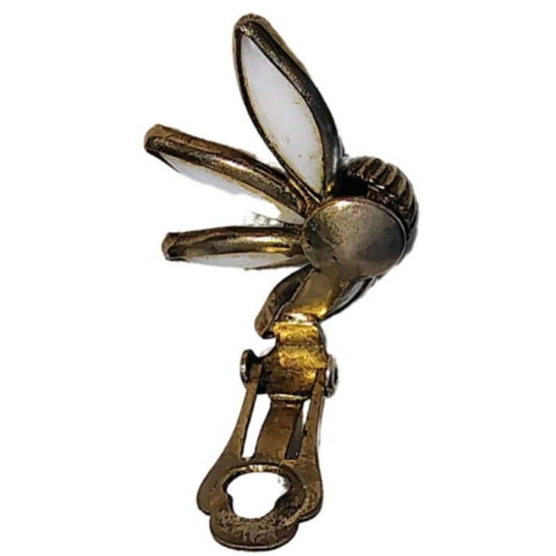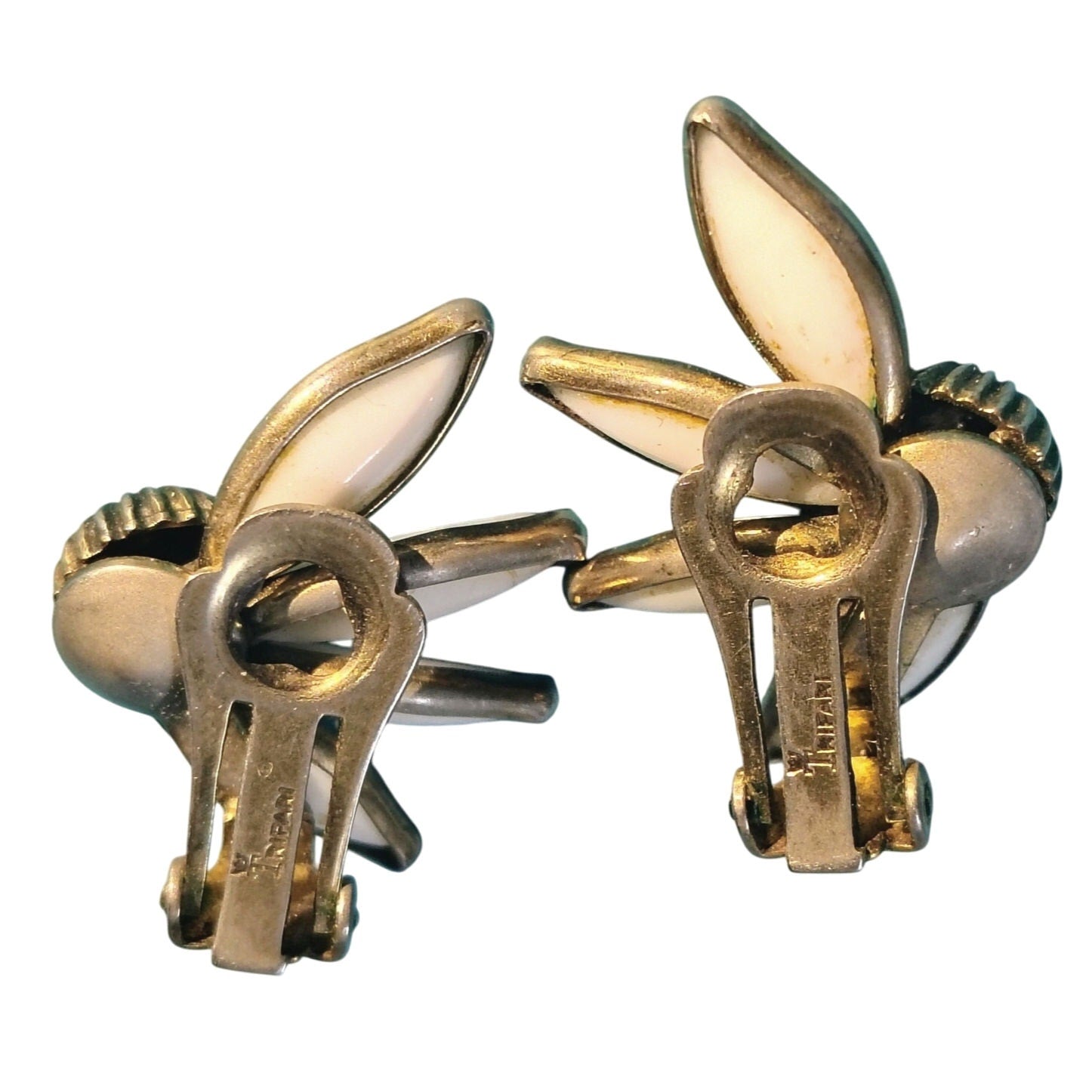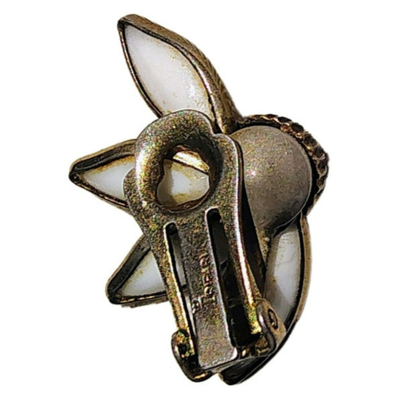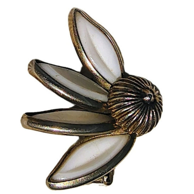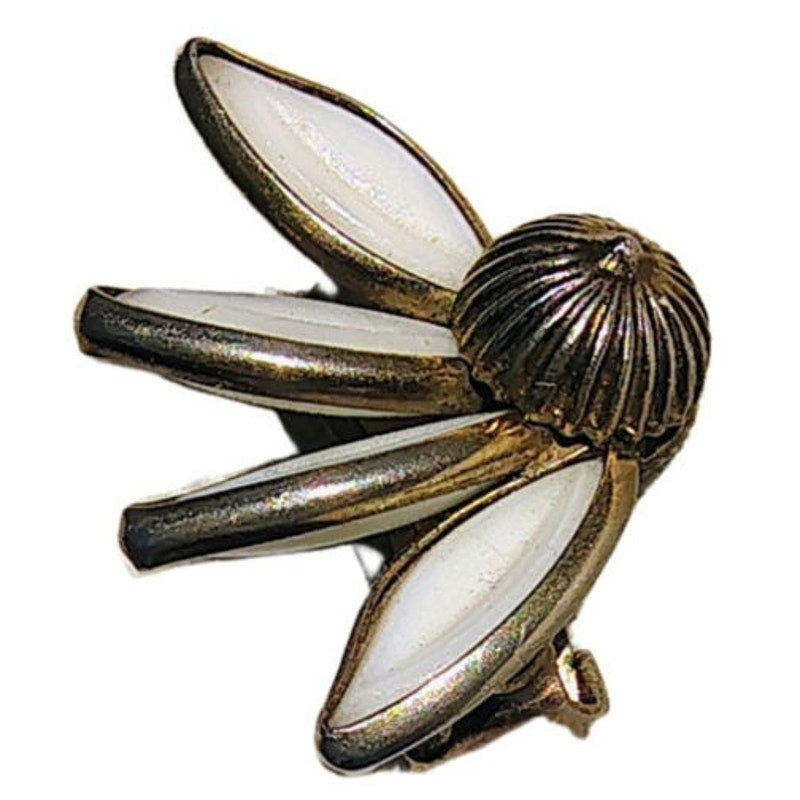 1949 Crown Trifari Gold Plated Clip-on Earrings Poured White Milk Glass Signed Pair of Daisy Petals. Crown Trifari logo on the back of each clip. Four poured milk glass petals with huge striped metal detail in the center of each earring. Part of the “Woodland Fantasies” collection.