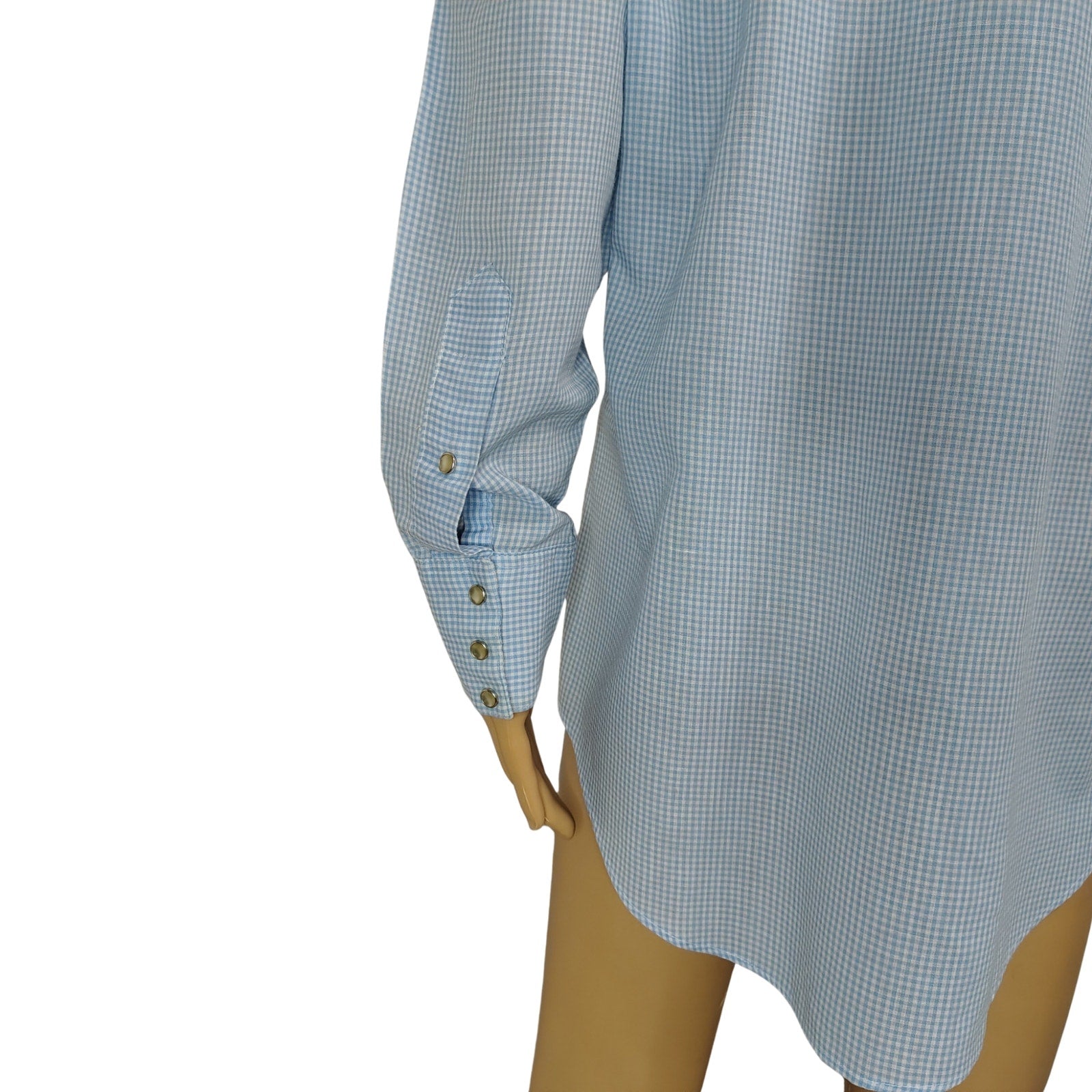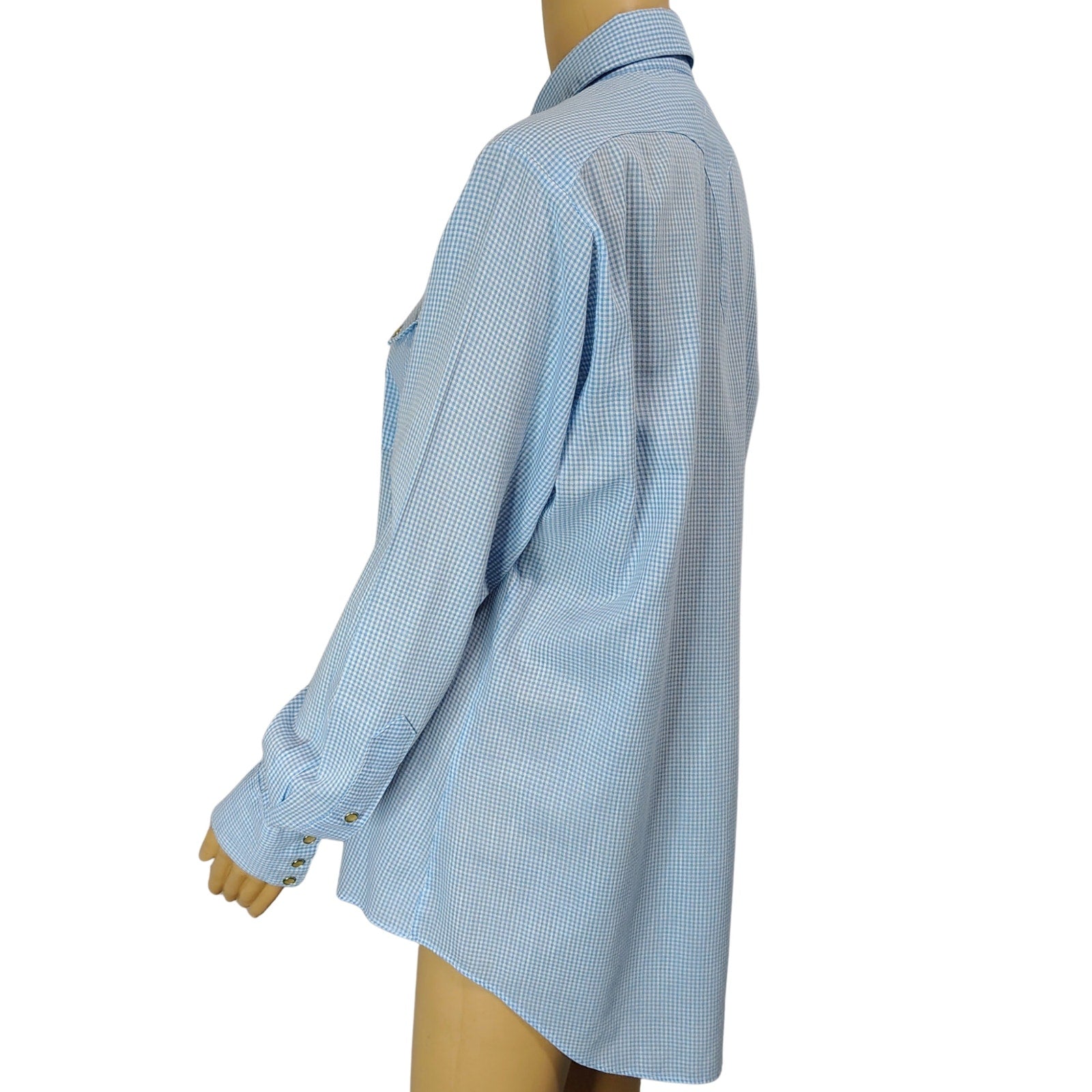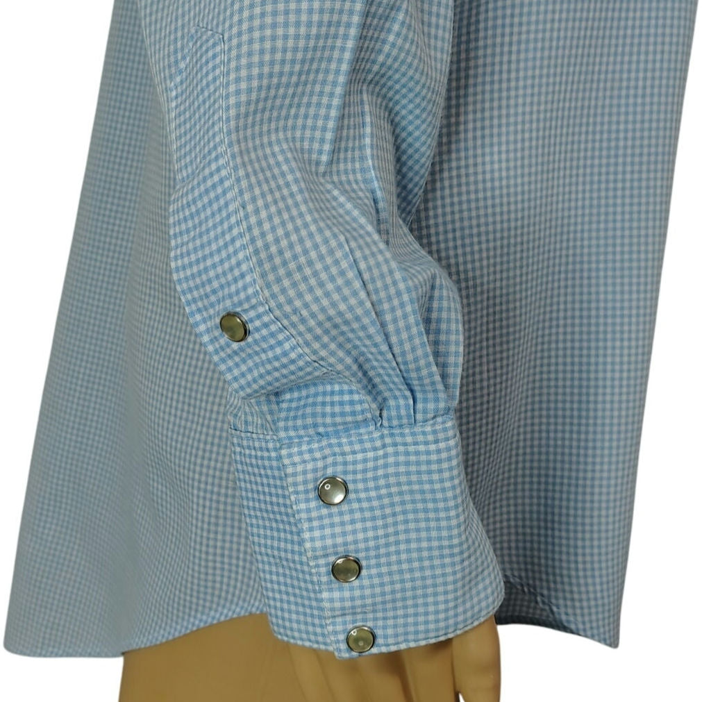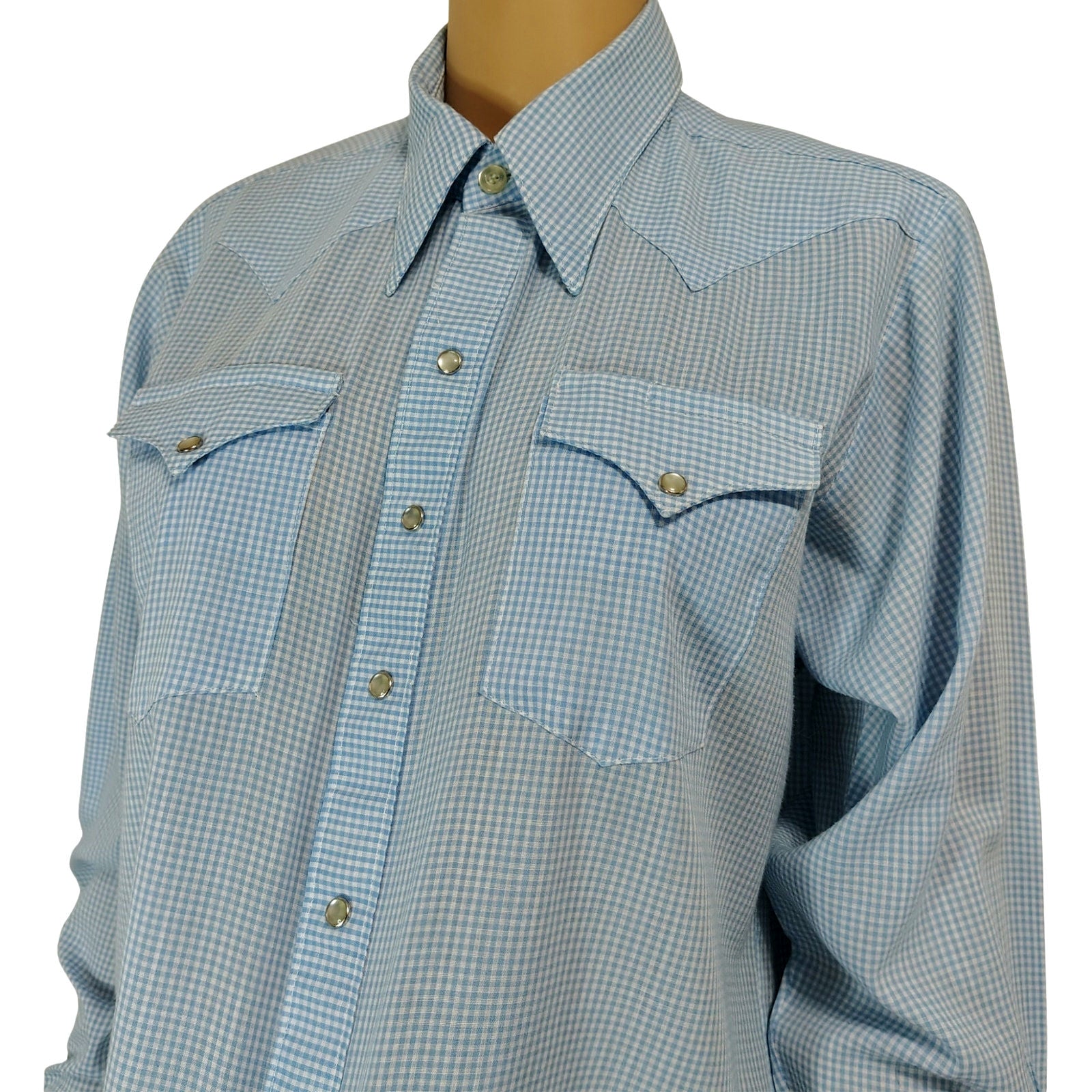 1950s Blue Micro Checkered Tru-West Rockmount Ranch Wear Custom Fitted Long Sleeve Western Shirt with Pearl Snap Buttons. Eight buttons run up the front, seven Pearl Snaps plus one plastic buttons. One pearl snap button on each chest pocket. Four Pearl snaps on each wrist. Wing tips on front yoke. Butterfly collar.