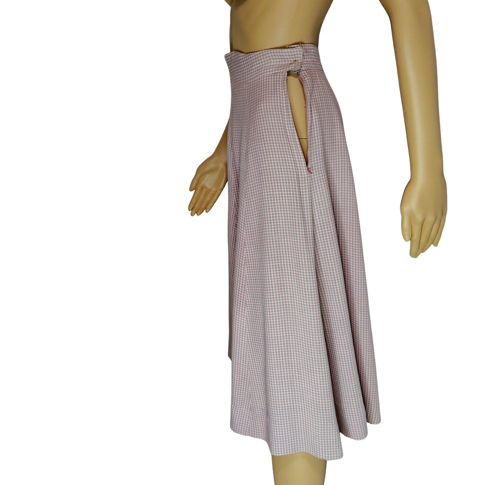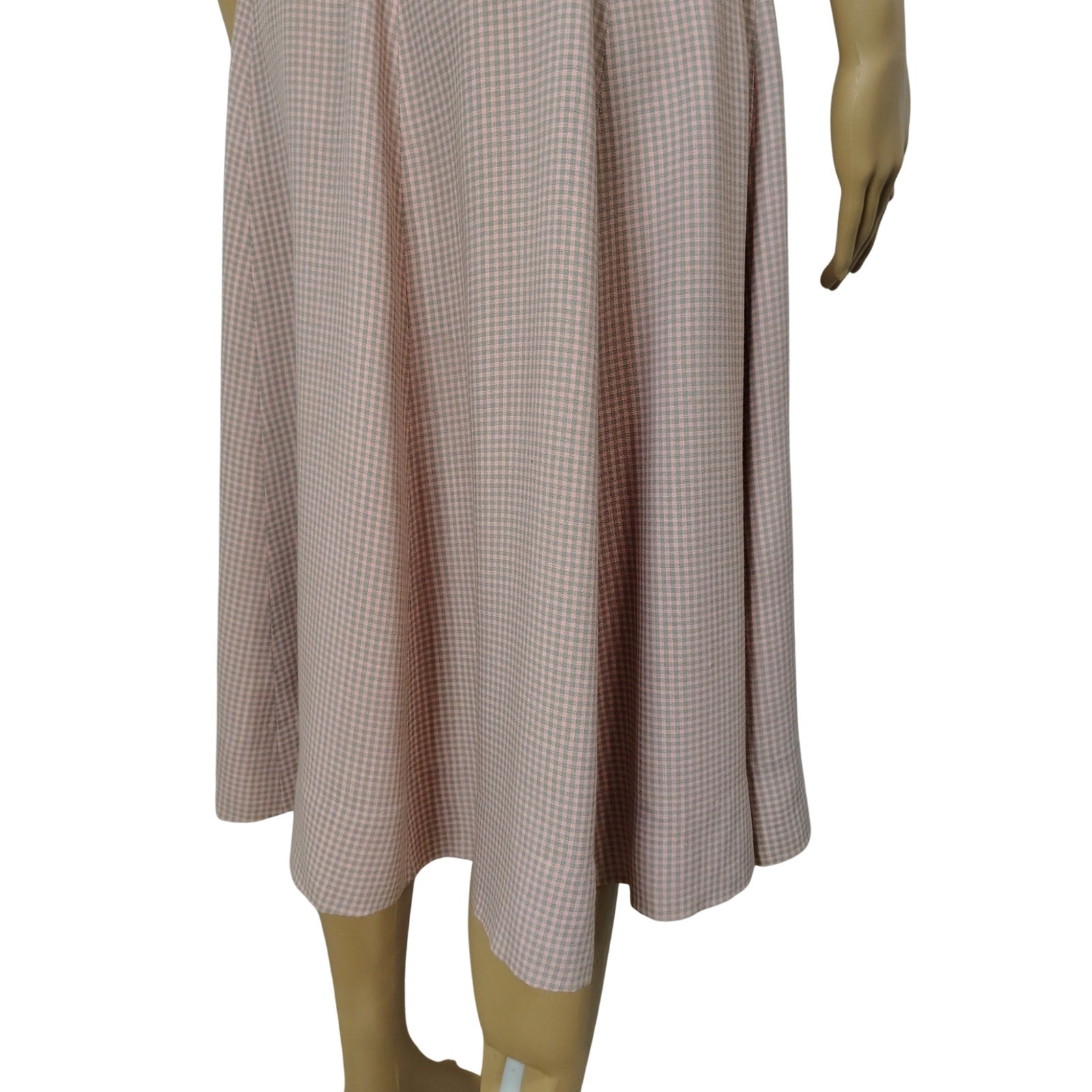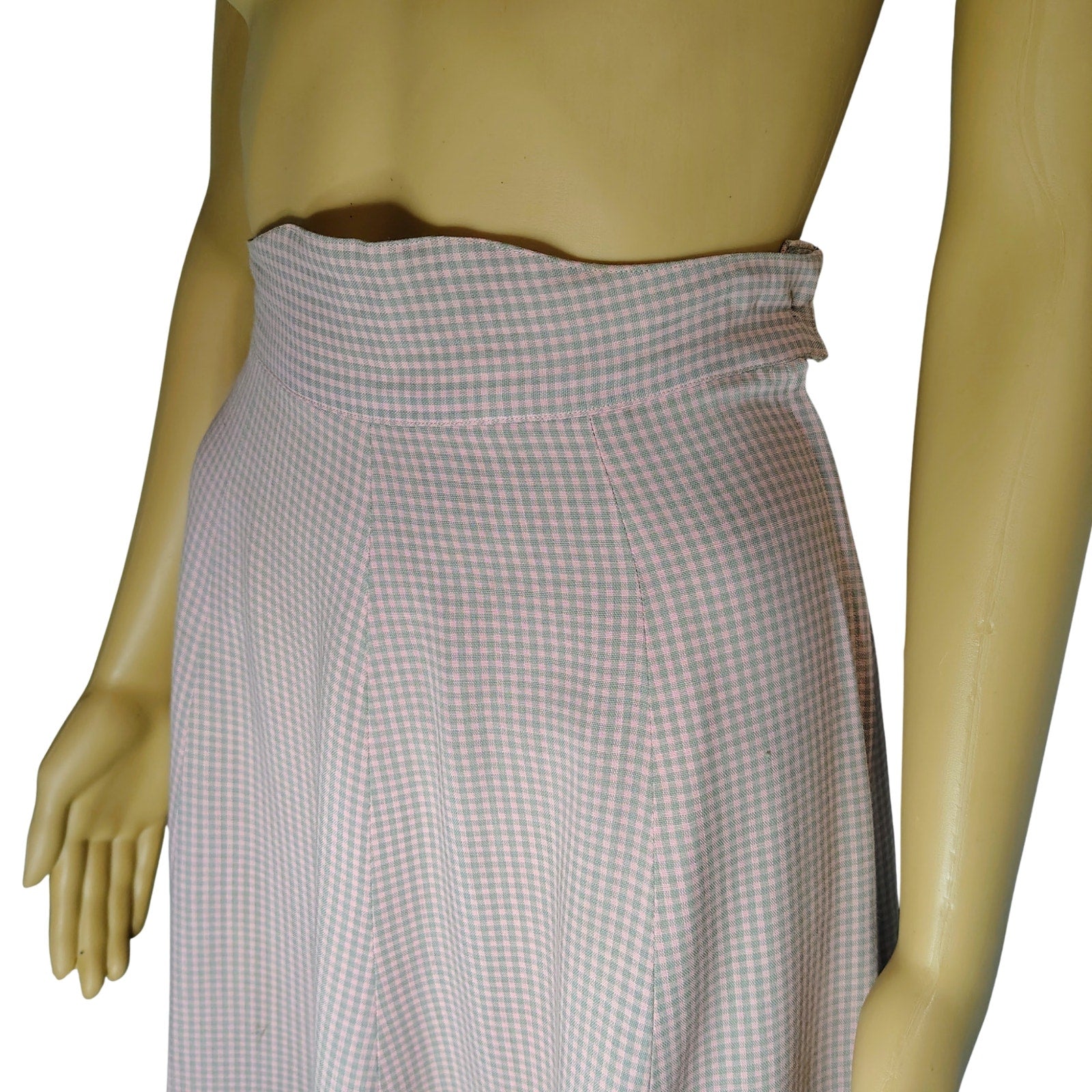 1950s Handmade Pink Gray Checkered Full Circle Midi A-Line Skirt. Metal side zipper. Darted and banded waist. Panel skirt design.