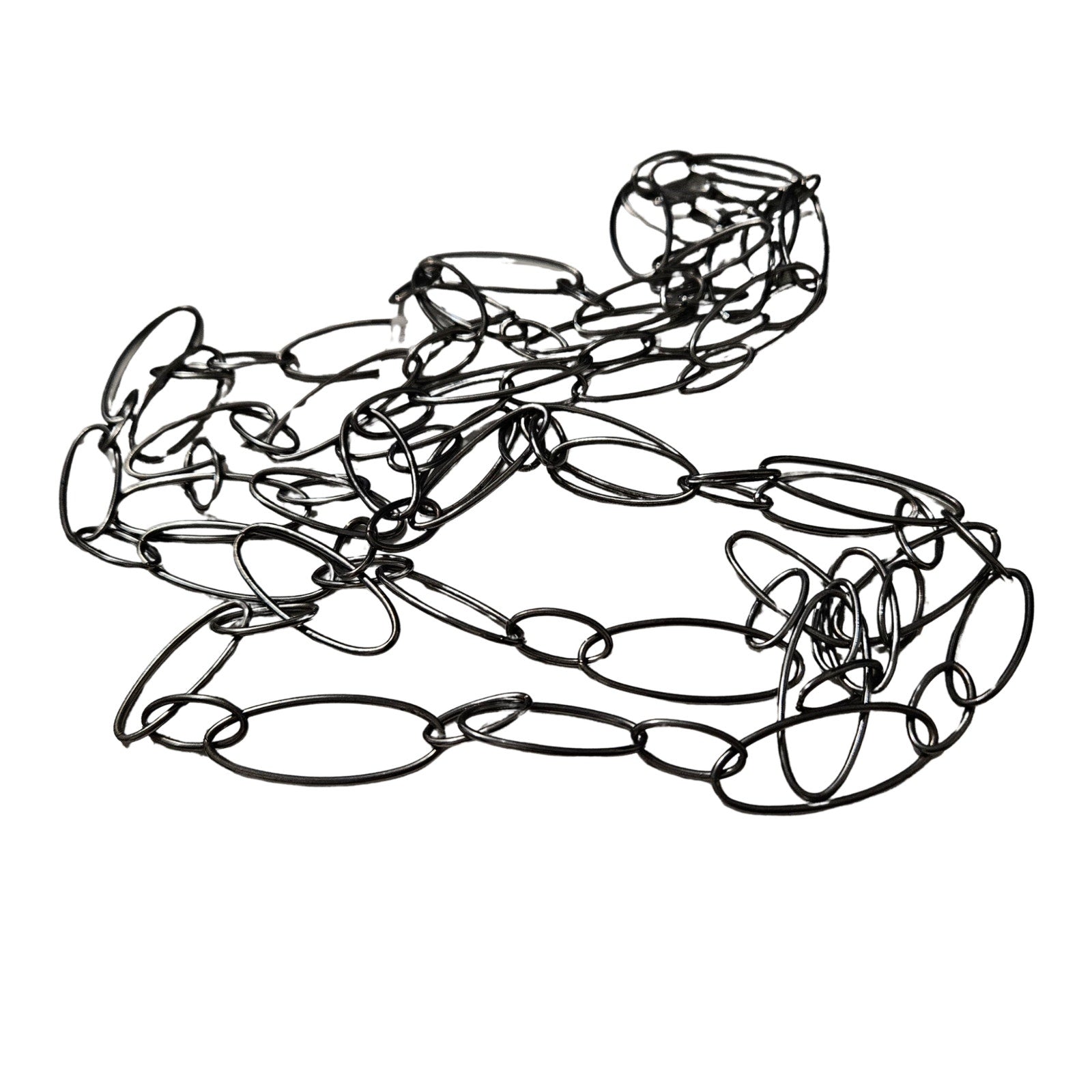 1950s Vintage MCM Mid Century Modern Gun Metal Silver Tone Thin Interlinked Oval Links. Extra long opera length chain link lightweight necklace.