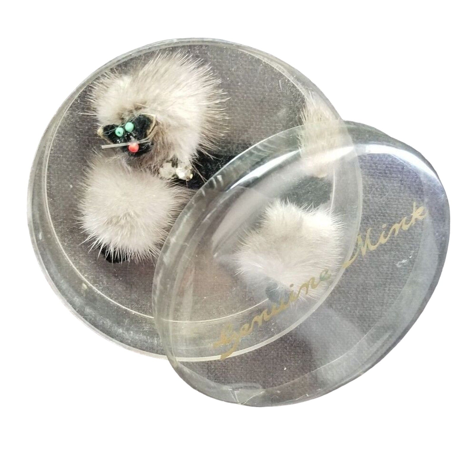 1950s Vintage MCM authentic mink fur poodle brooch pin. Bird seeds for eyes and nose. Crystal collar. Pipe cleaner used to make the body.