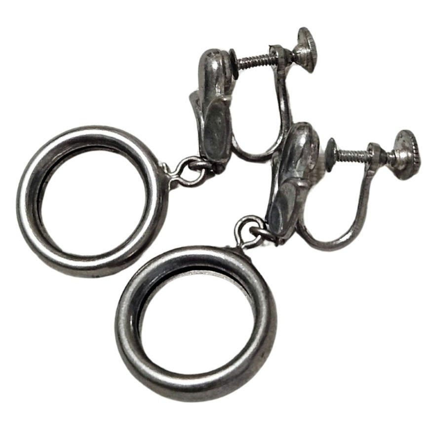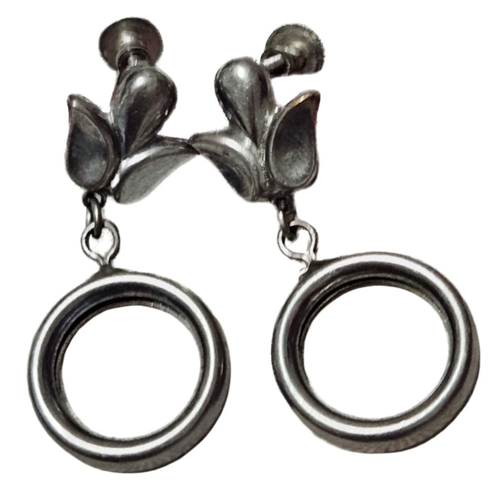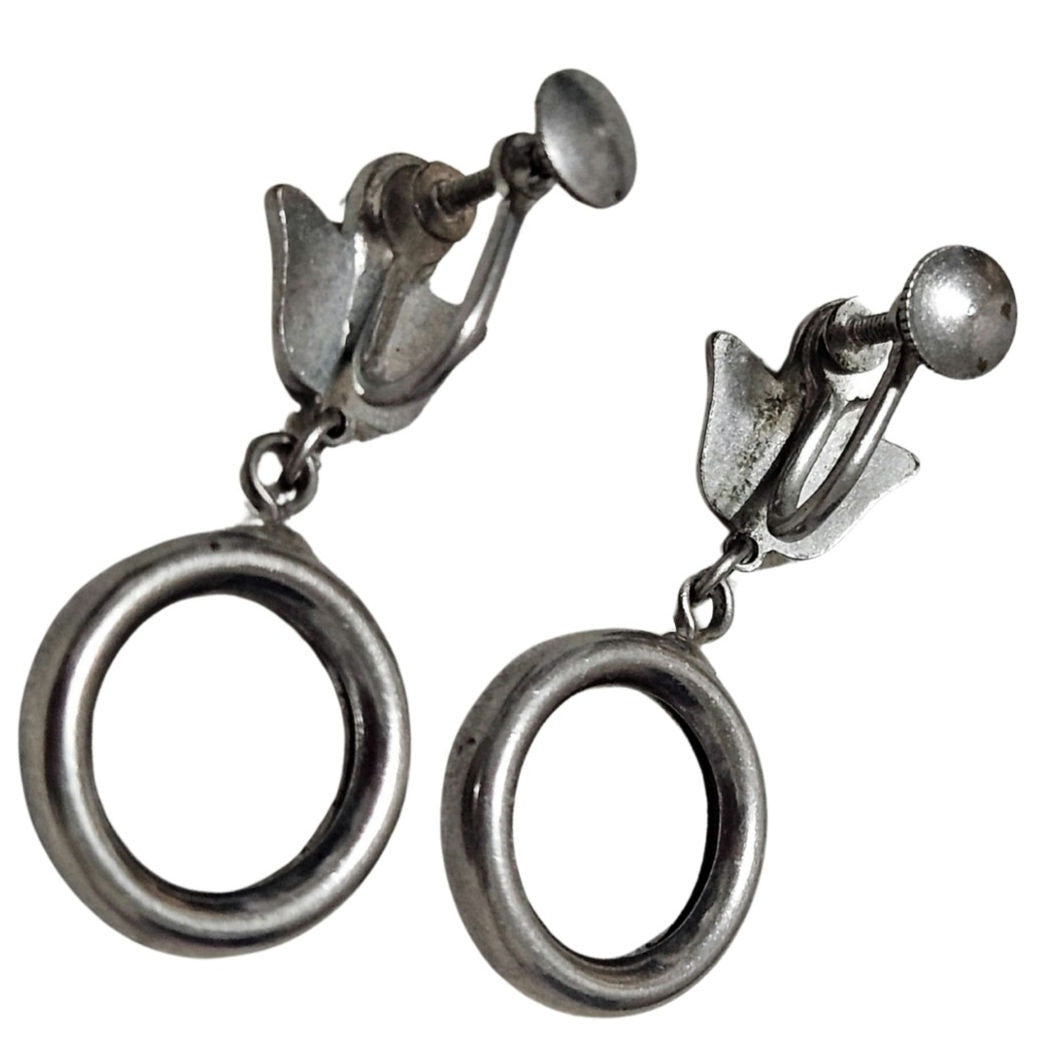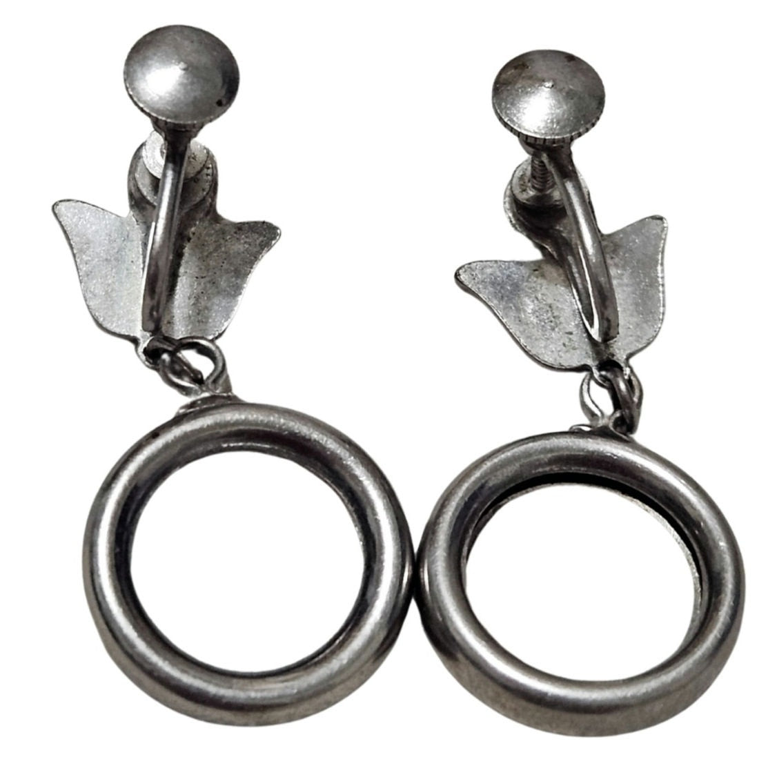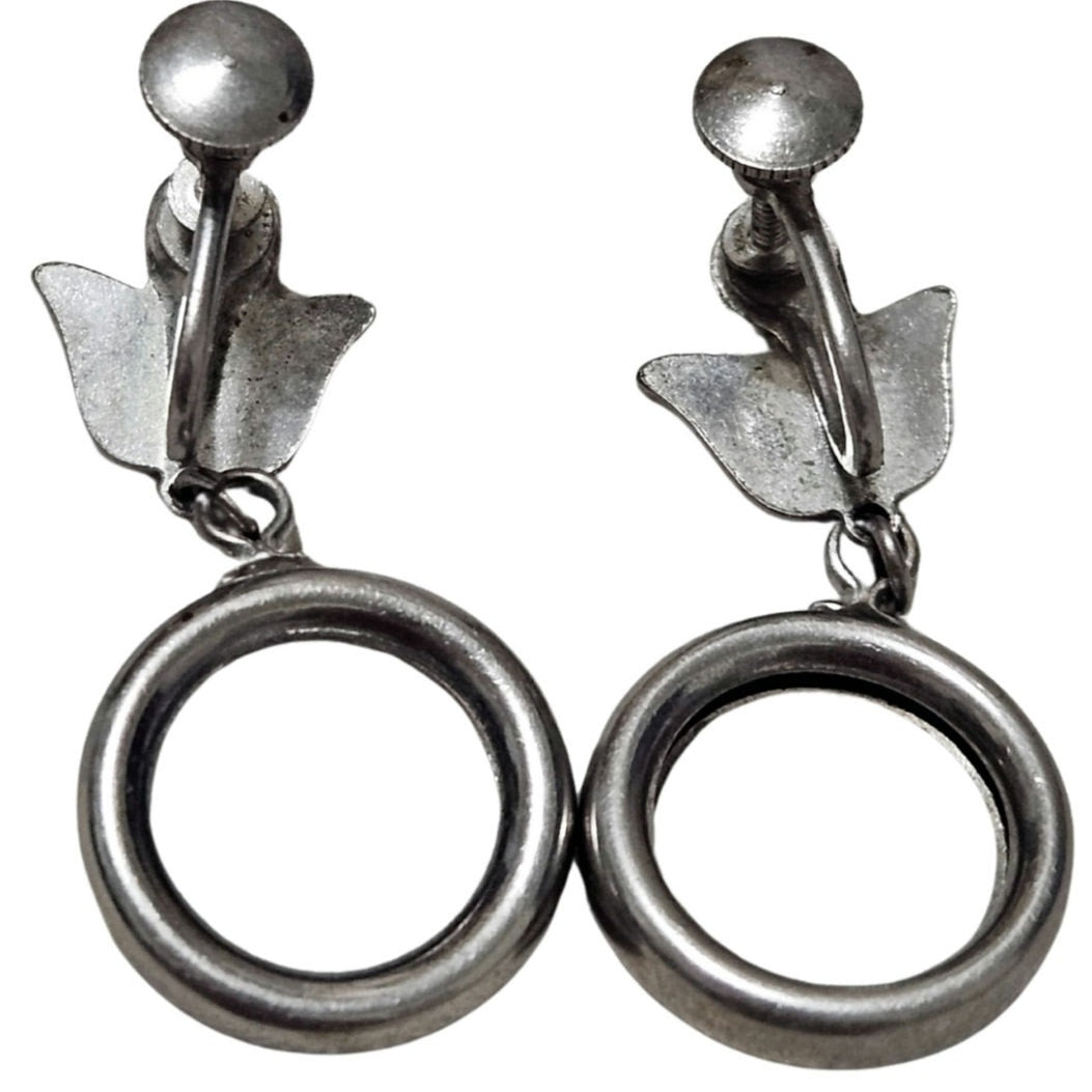 1950s Vintage Flower Dangling Loop Clip On Earrings Silver Tone Twist On Closure.