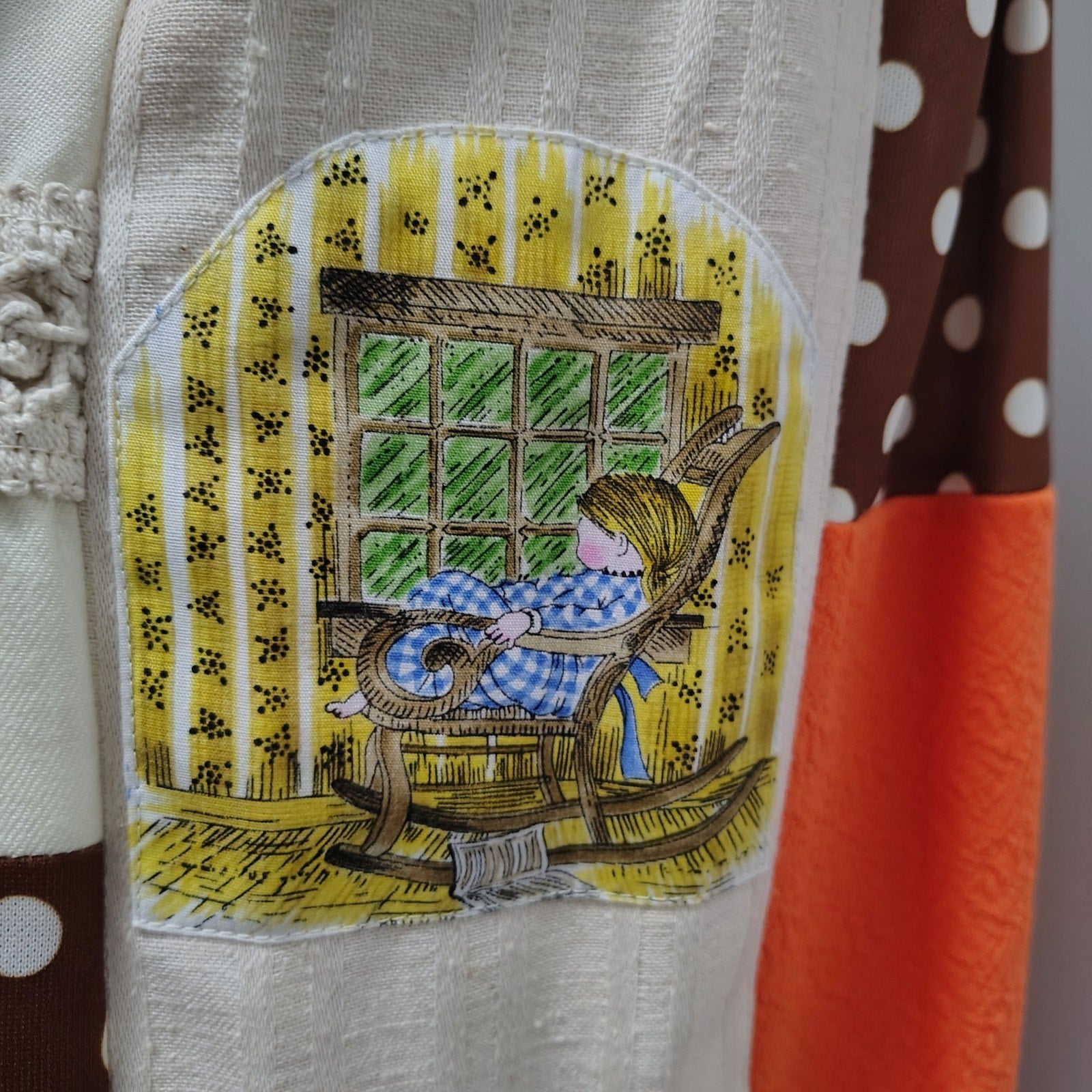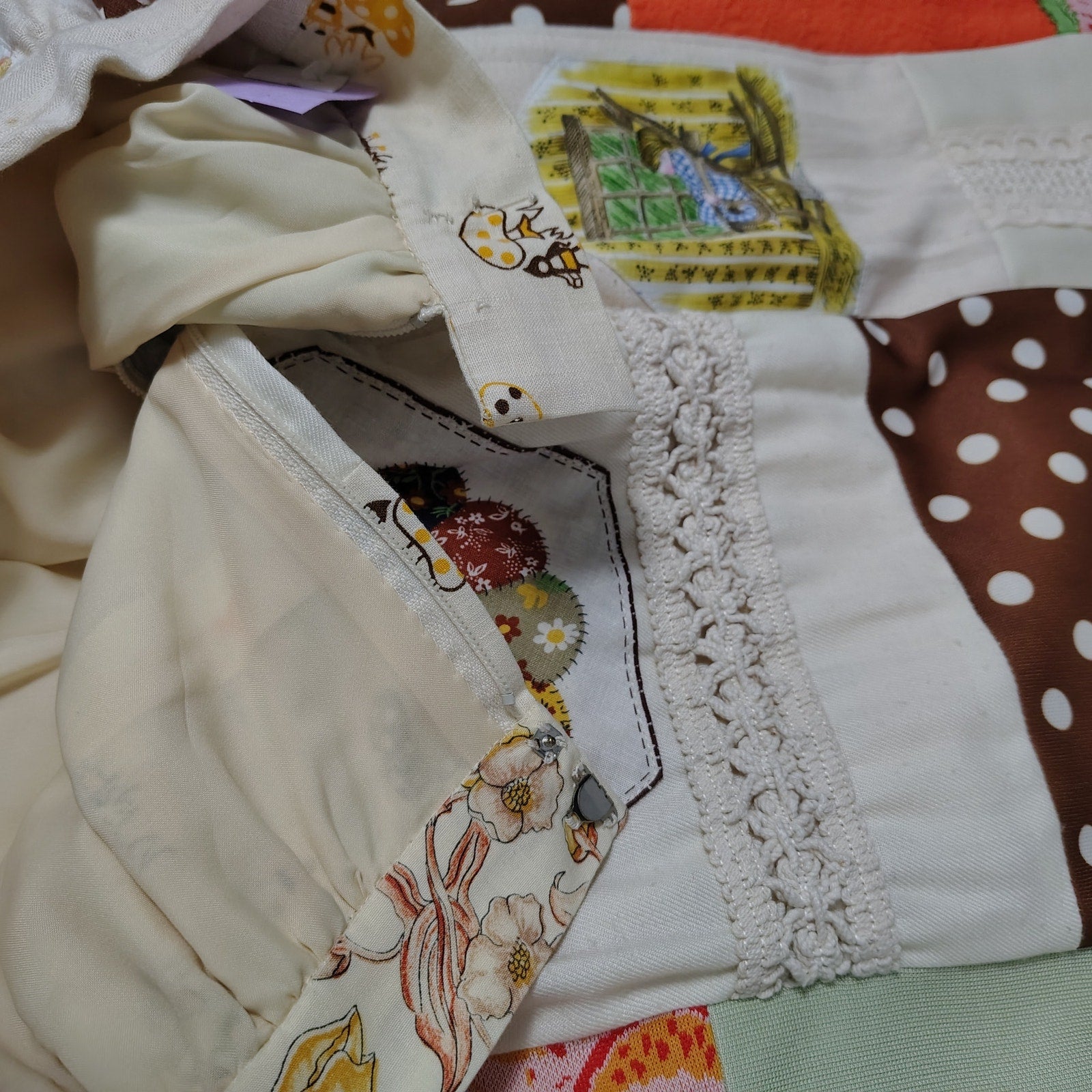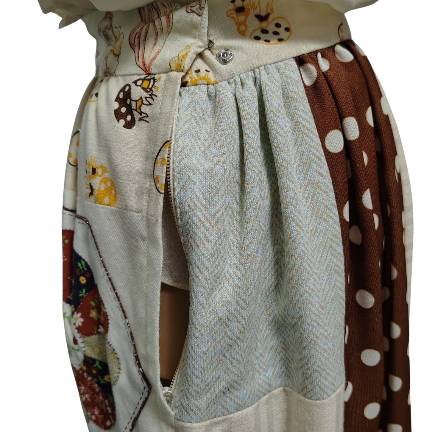 Vintage 1960s 1970s Hippie Handmade Patchwork Boho Maxi Skirt Prairie Lined 13 Inch Waist. Lace, eyelet, textured, polyester, cotton and various other fabrics complete this unique skirt. Floral motif, watermelons, mushrooms and other fairytale prints.