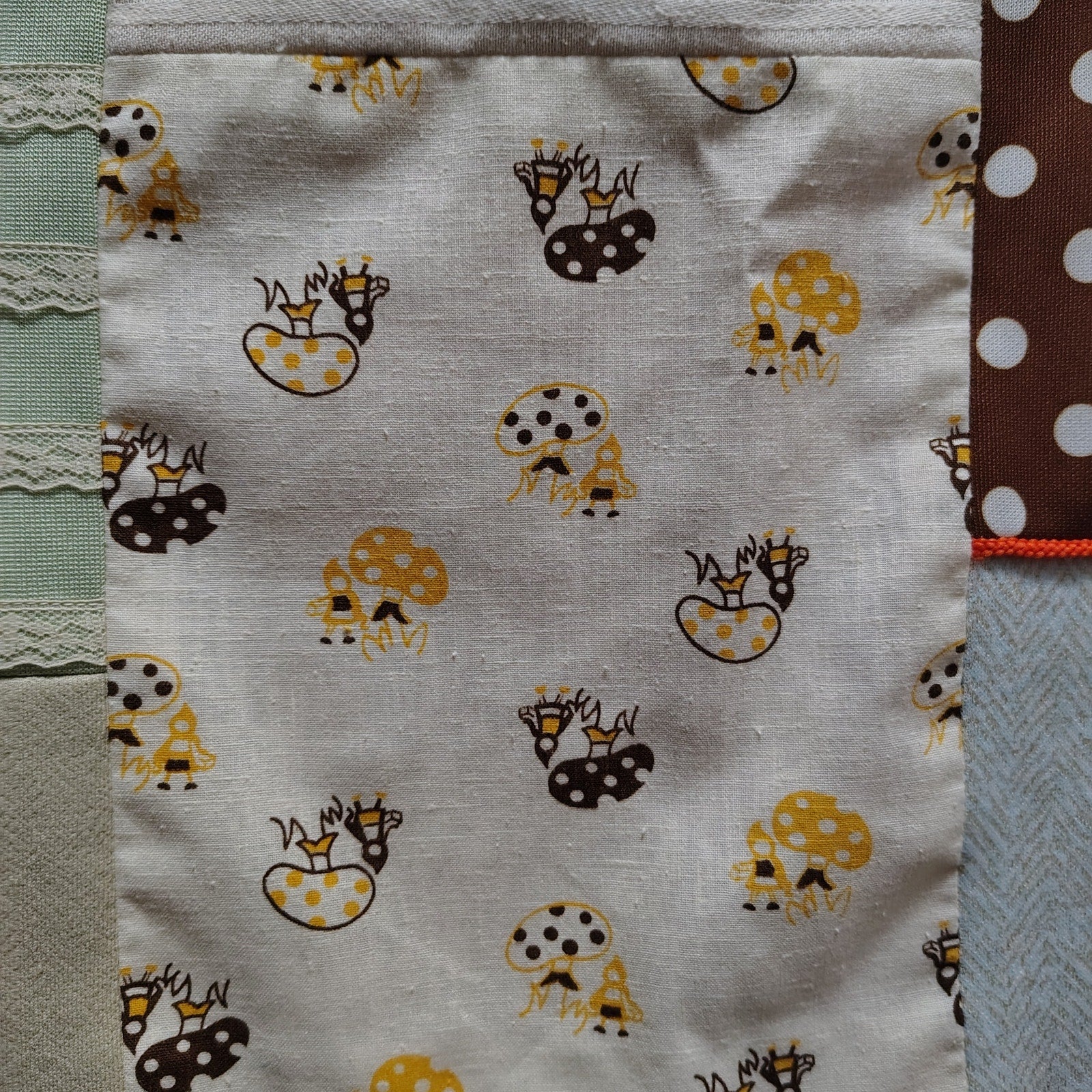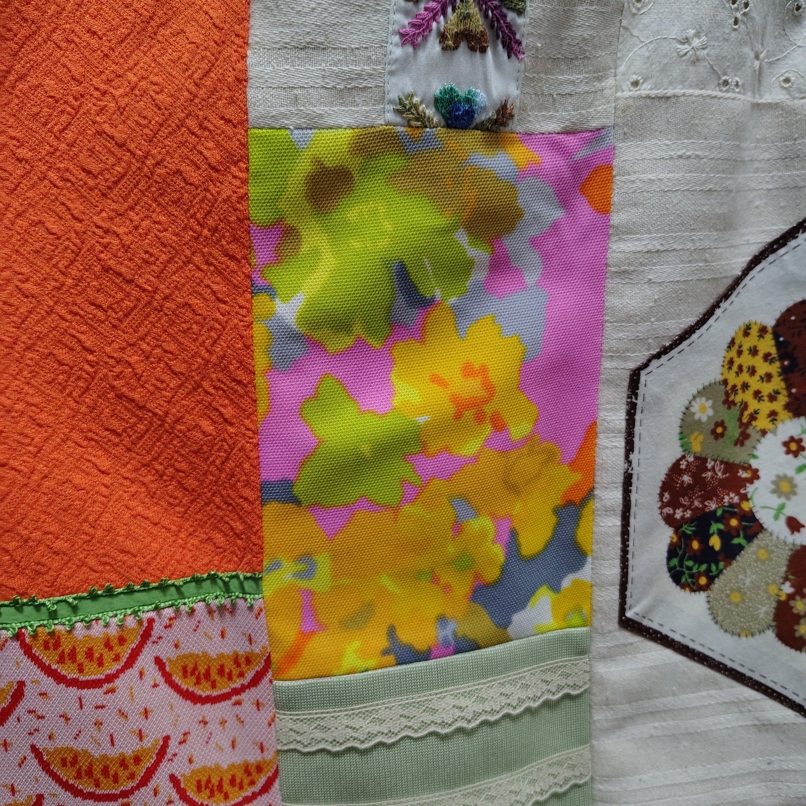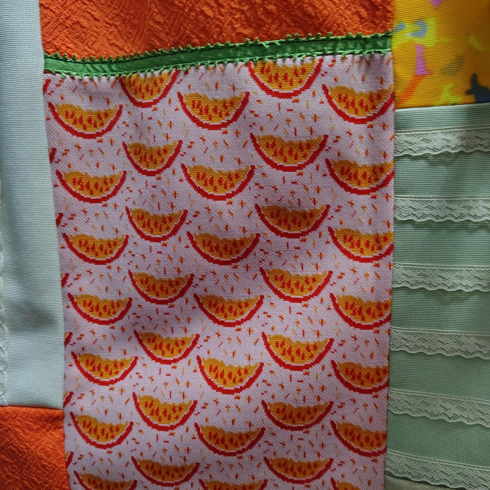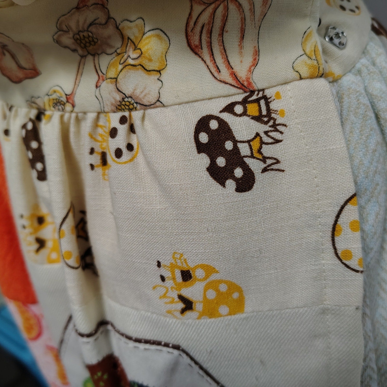 Vintage 1960s 1970s Hippie Handmade Patchwork Boho Maxi Skirt Prairie Lined 13 Inch Waist. Lace, eyelet, textured, polyester, cotton and various other fabrics complete this unique skirt. Floral motif, watermelons, mushrooms and other fairytale prints.