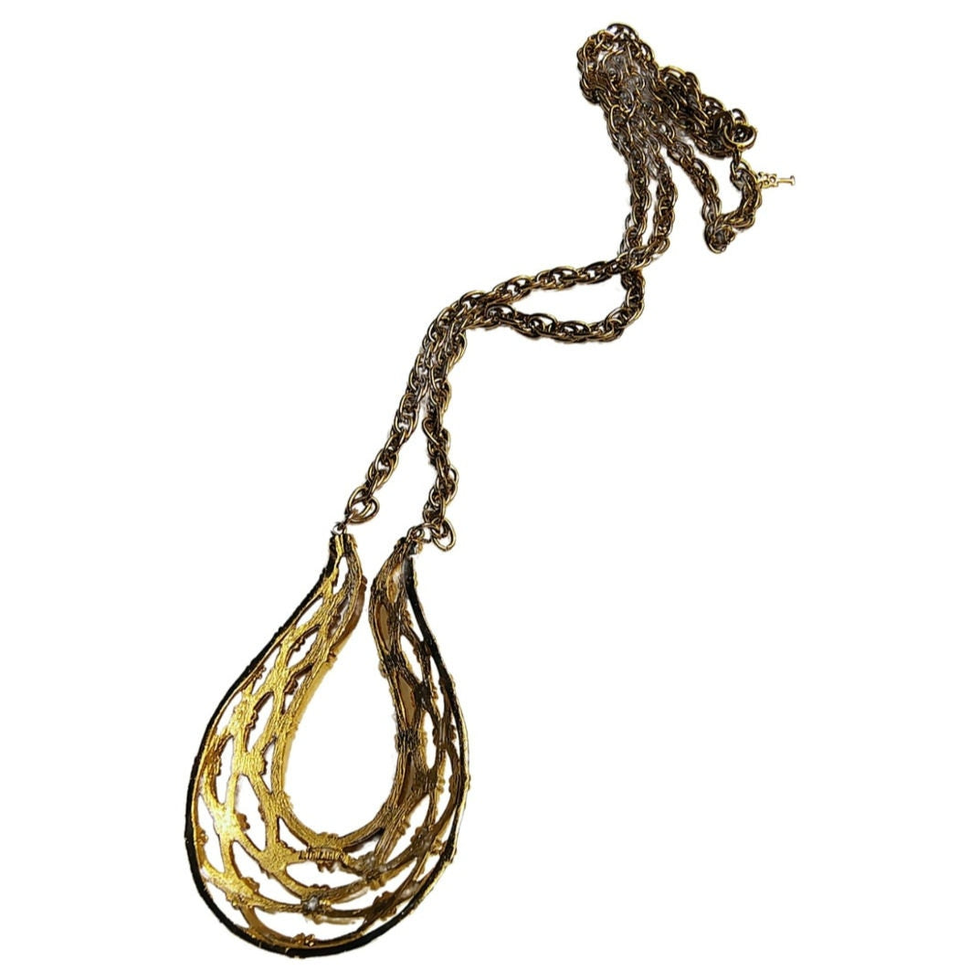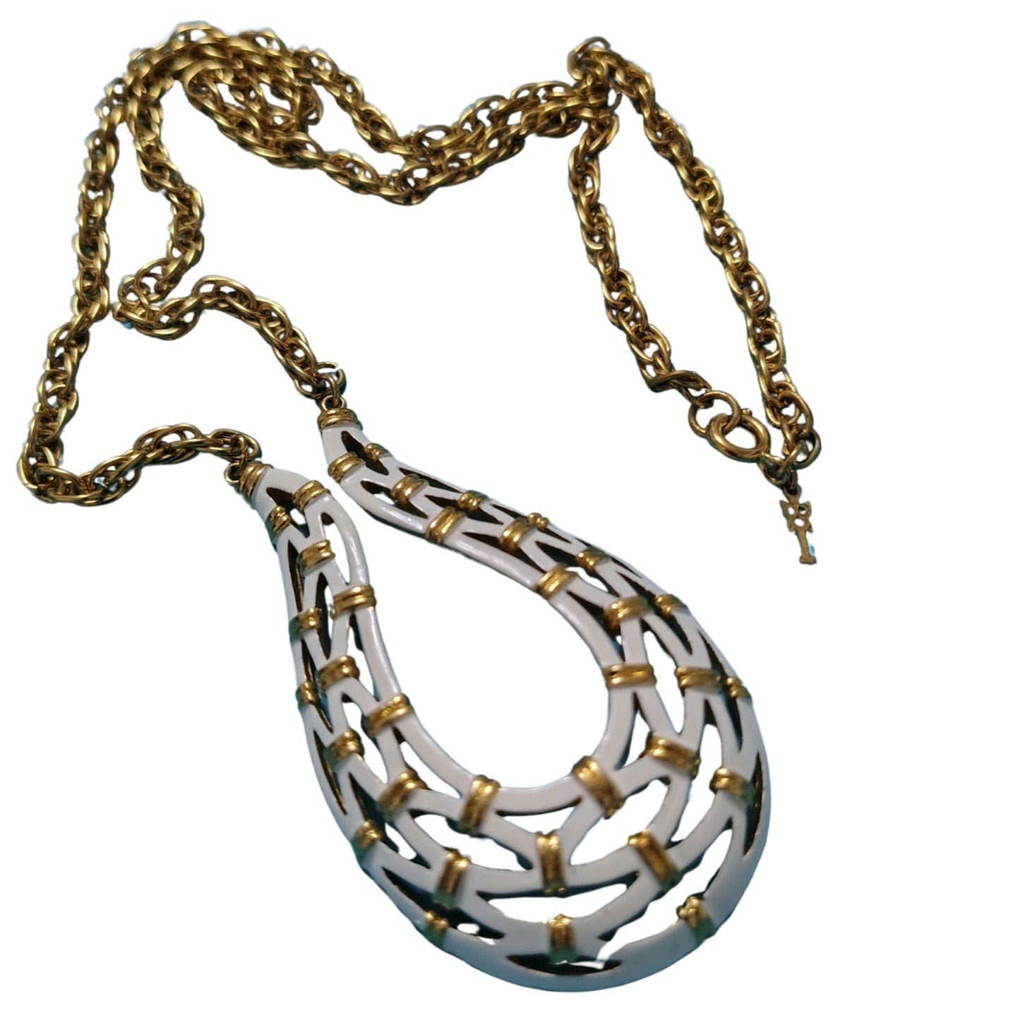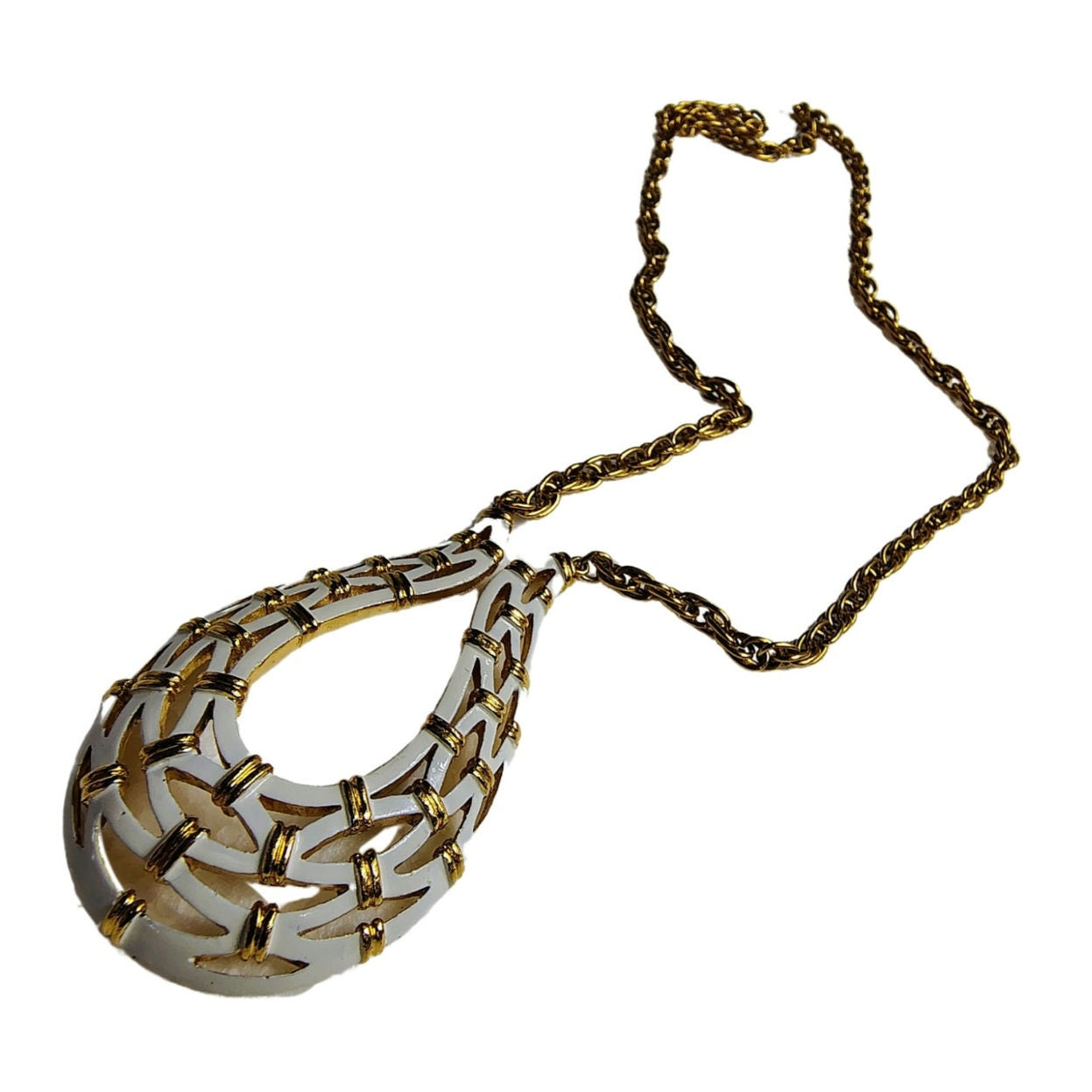 1960s Vintage Crown Trifari Gold White Enamel Woven Pendant Statement Necklace