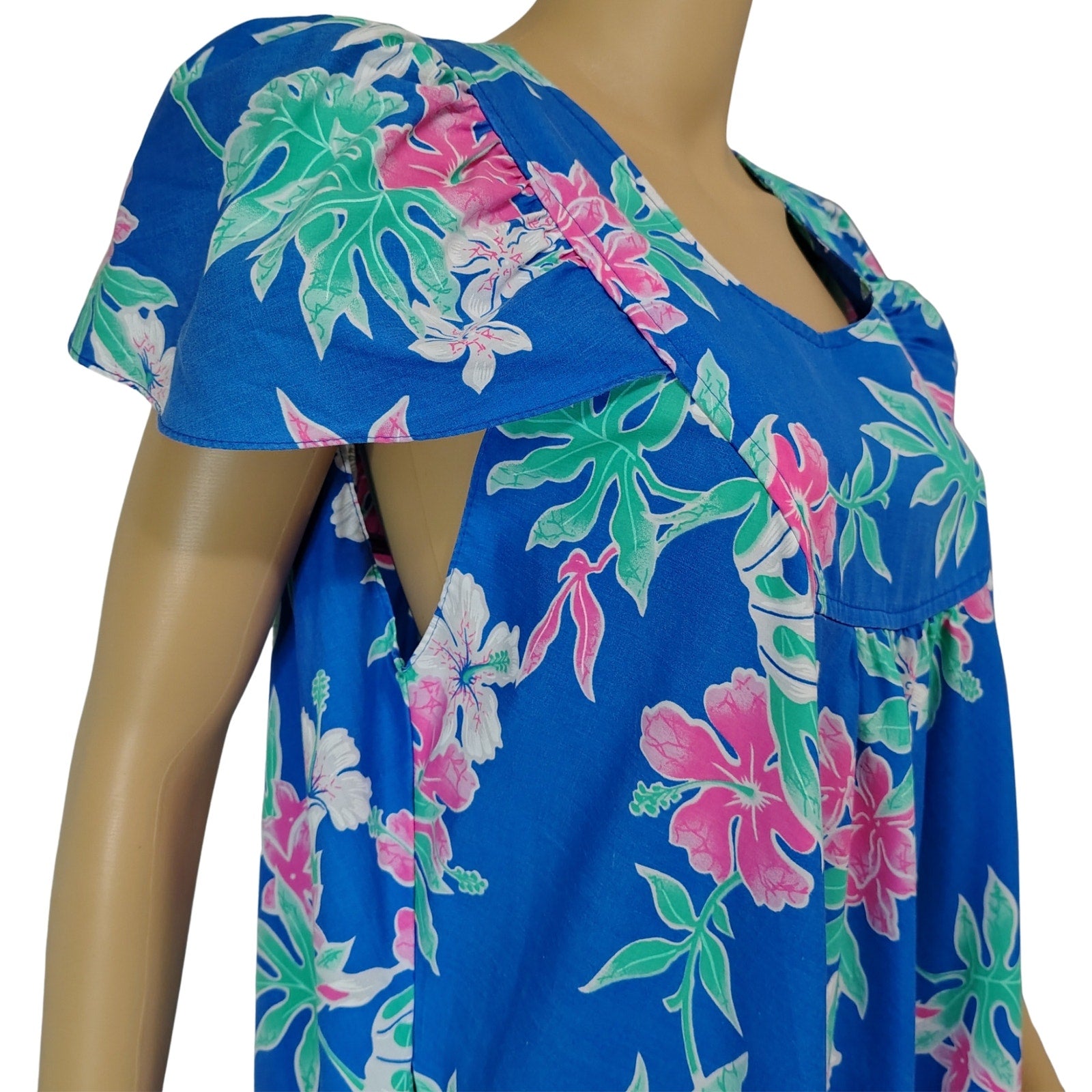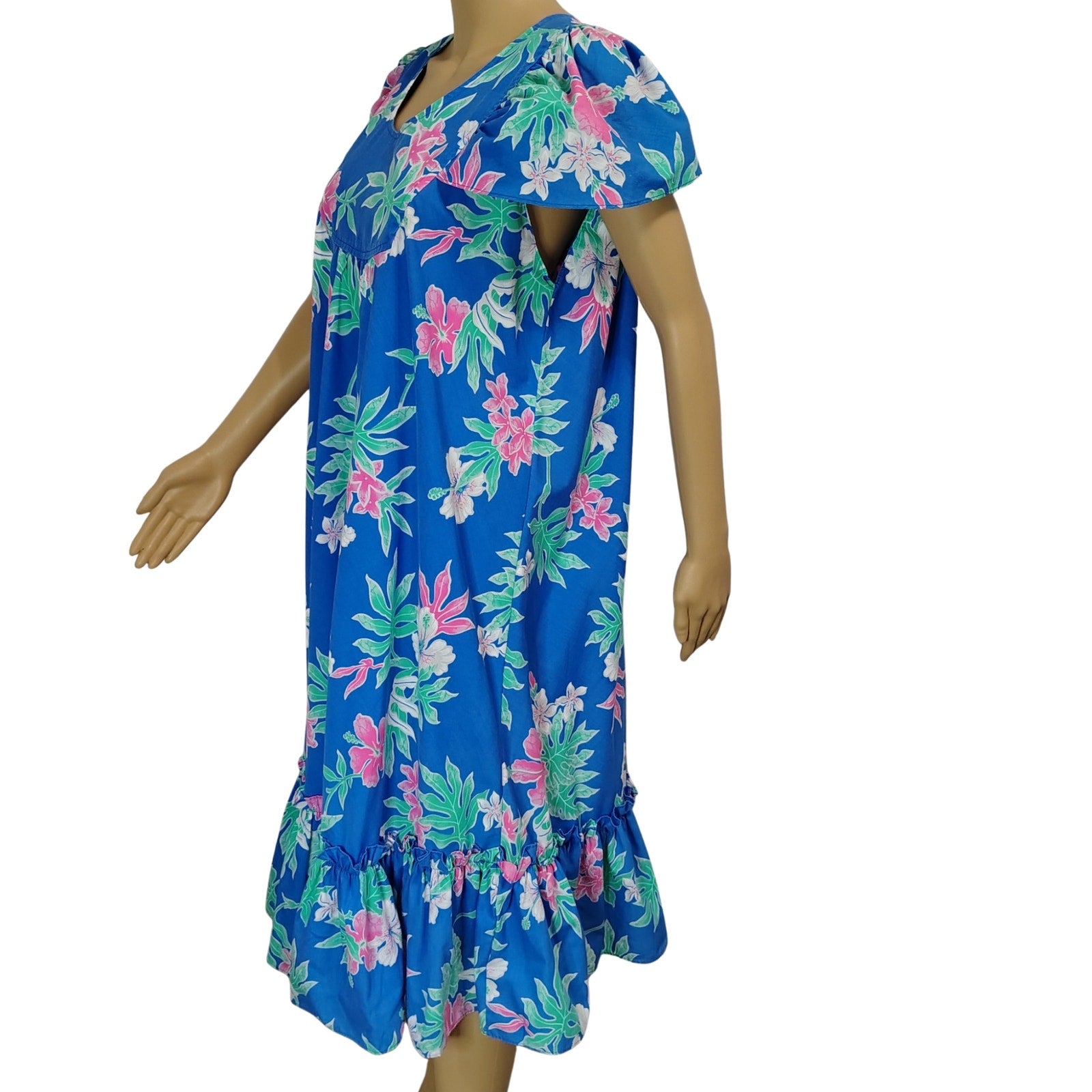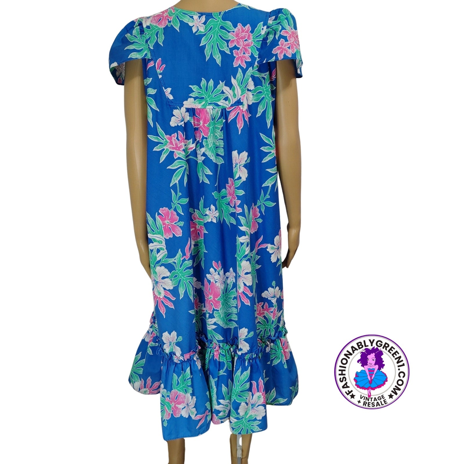 1970s Blue Hawaiian Floral Pullover Caftan House Dress with Pink Flowers. Wide ruffle hem. Gathered cap sleeves. One hidden side seam pocket. Crew neckline. Chest plate design with loose fit styling
