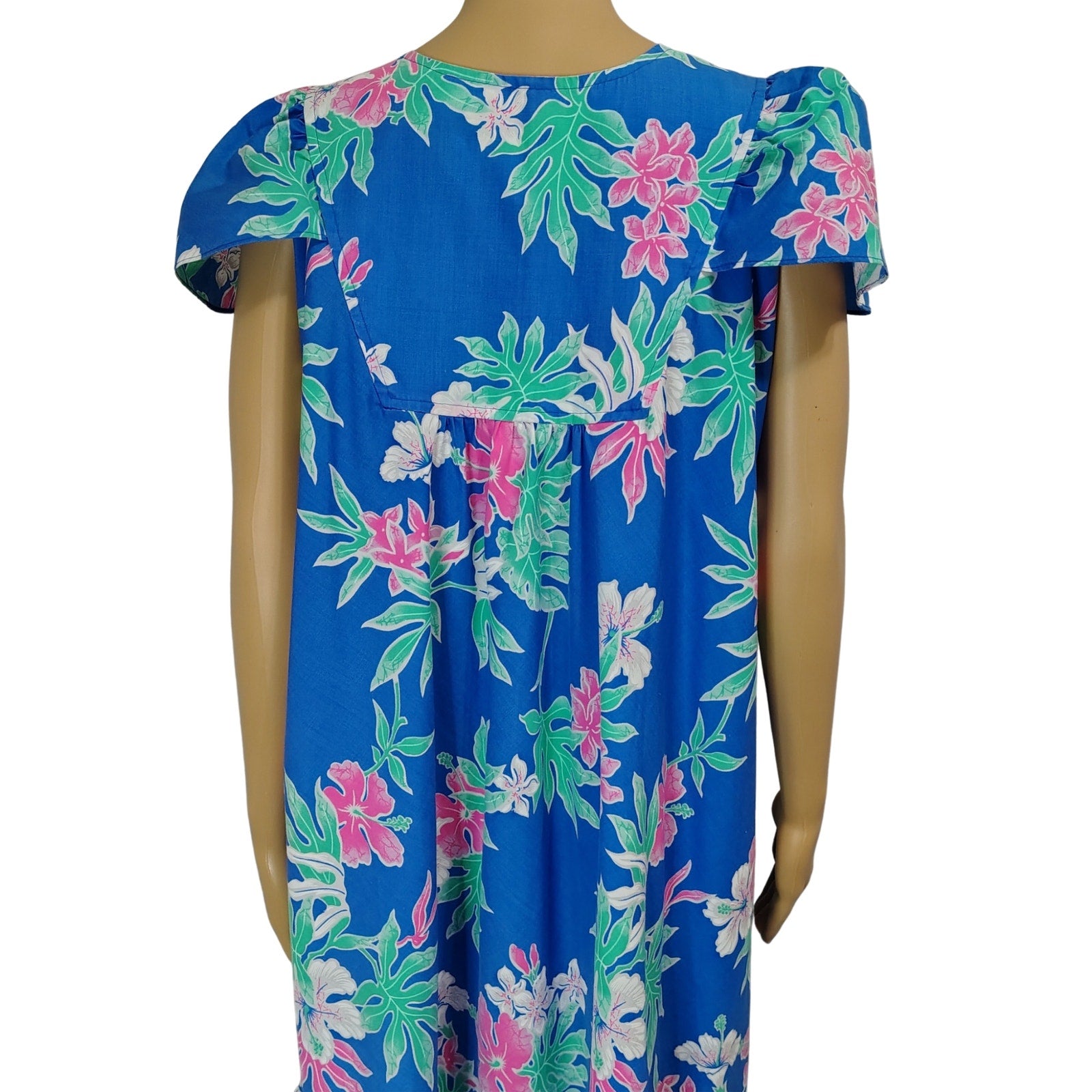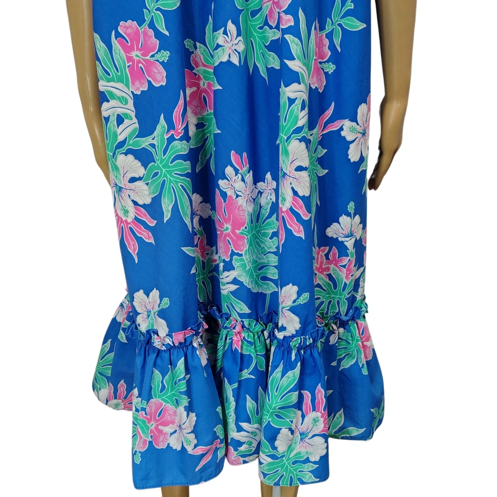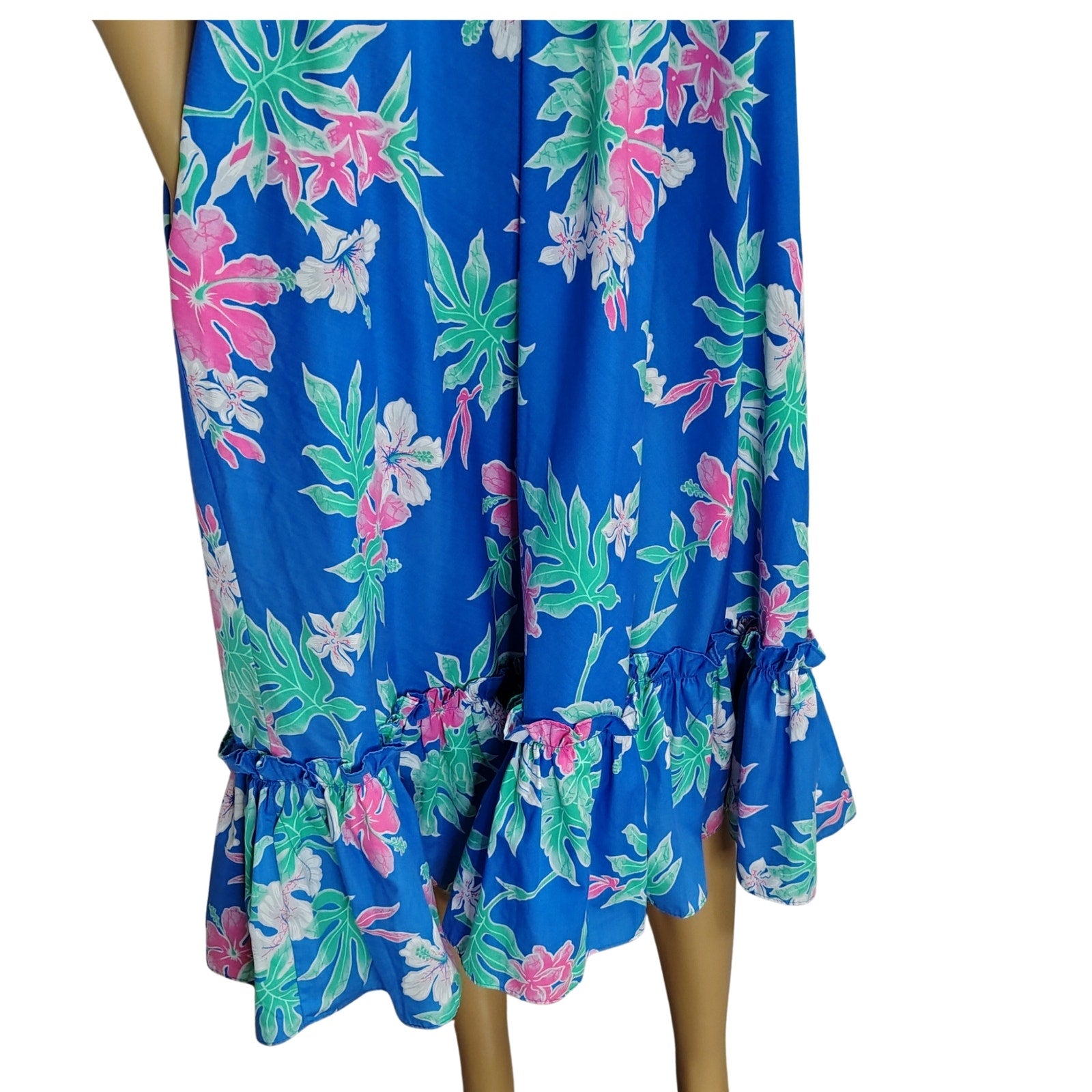 1970s Blue Hawaiian Floral Pullover Caftan House Dress with Pink Flowers. Wide ruffle hem. Gathered cap sleeves. One hidden side seam pocket. Crew neckline. Chest plate design with loose fit styling