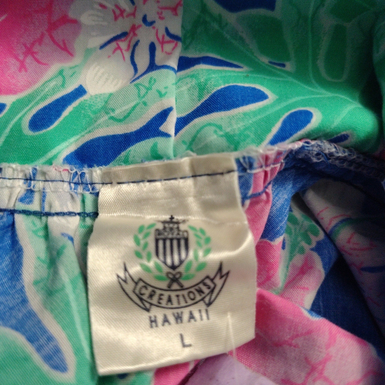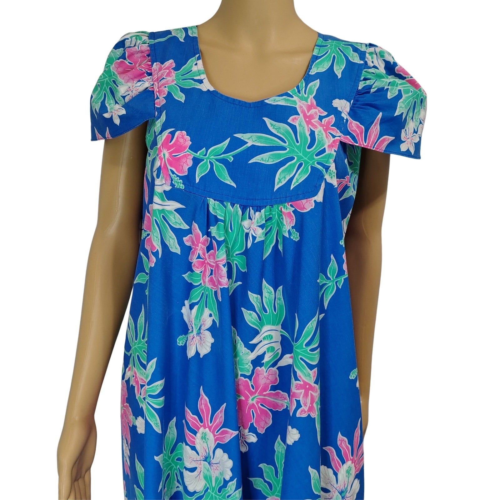 1970s Blue Hawaiian Pink Floral Pullover Caftan House Dress Cap Sleeves Wide Loose Fit [Vintage]