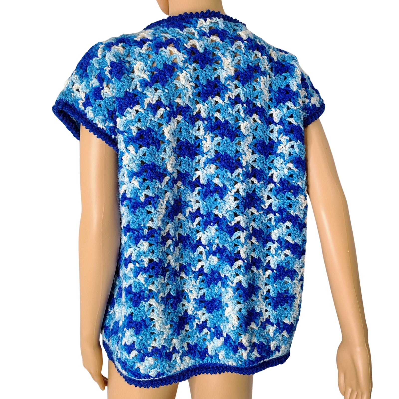 1970s Blue White Marbled Crochet Knit Cap Sleeves Tie Up Cardigan Sweater. Dark blue lined edges. Three braided tie closures run down the front. Box cut vintage style.
