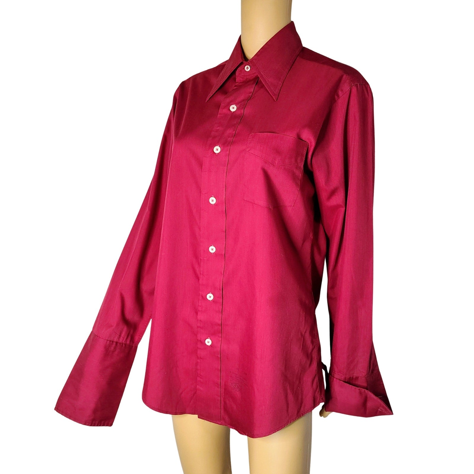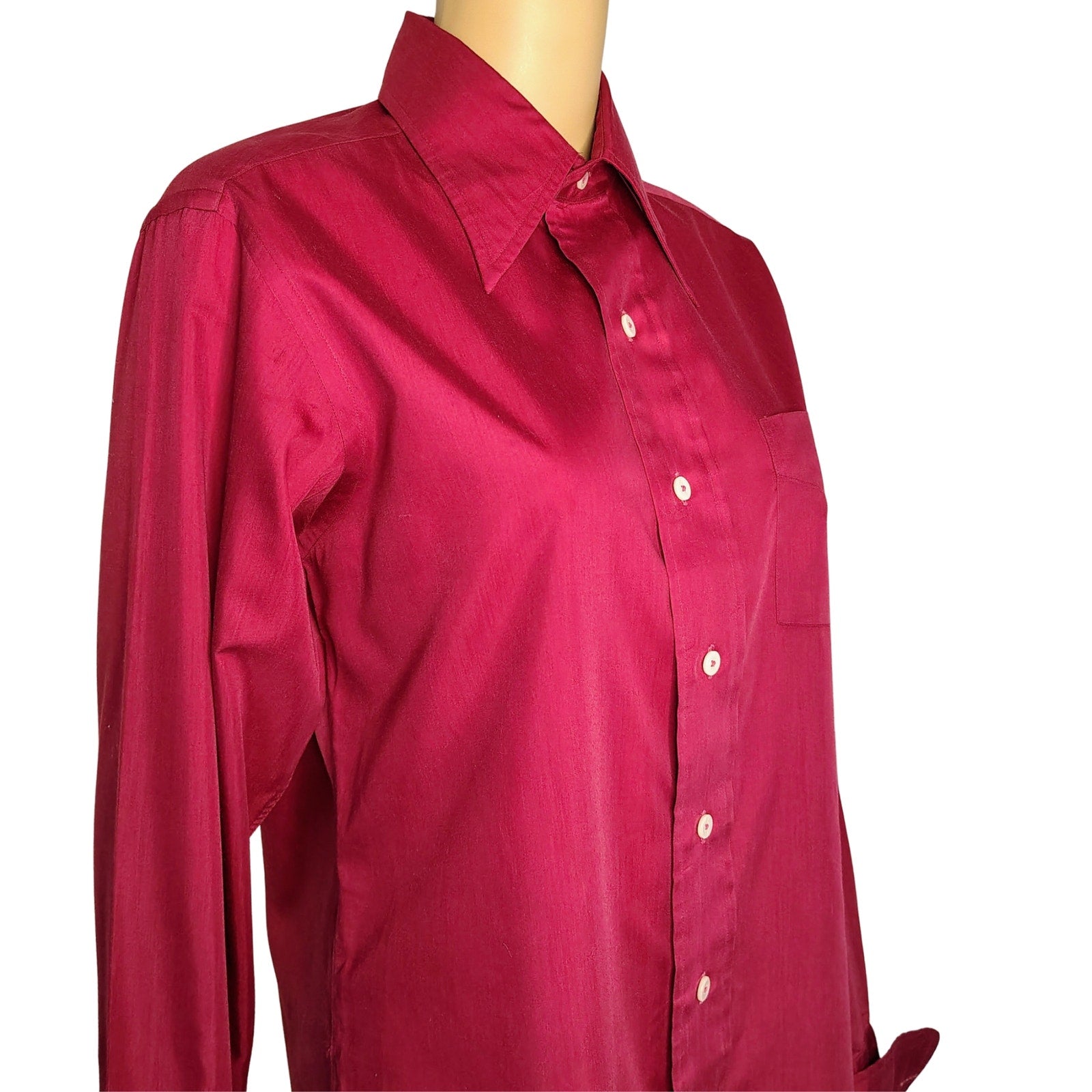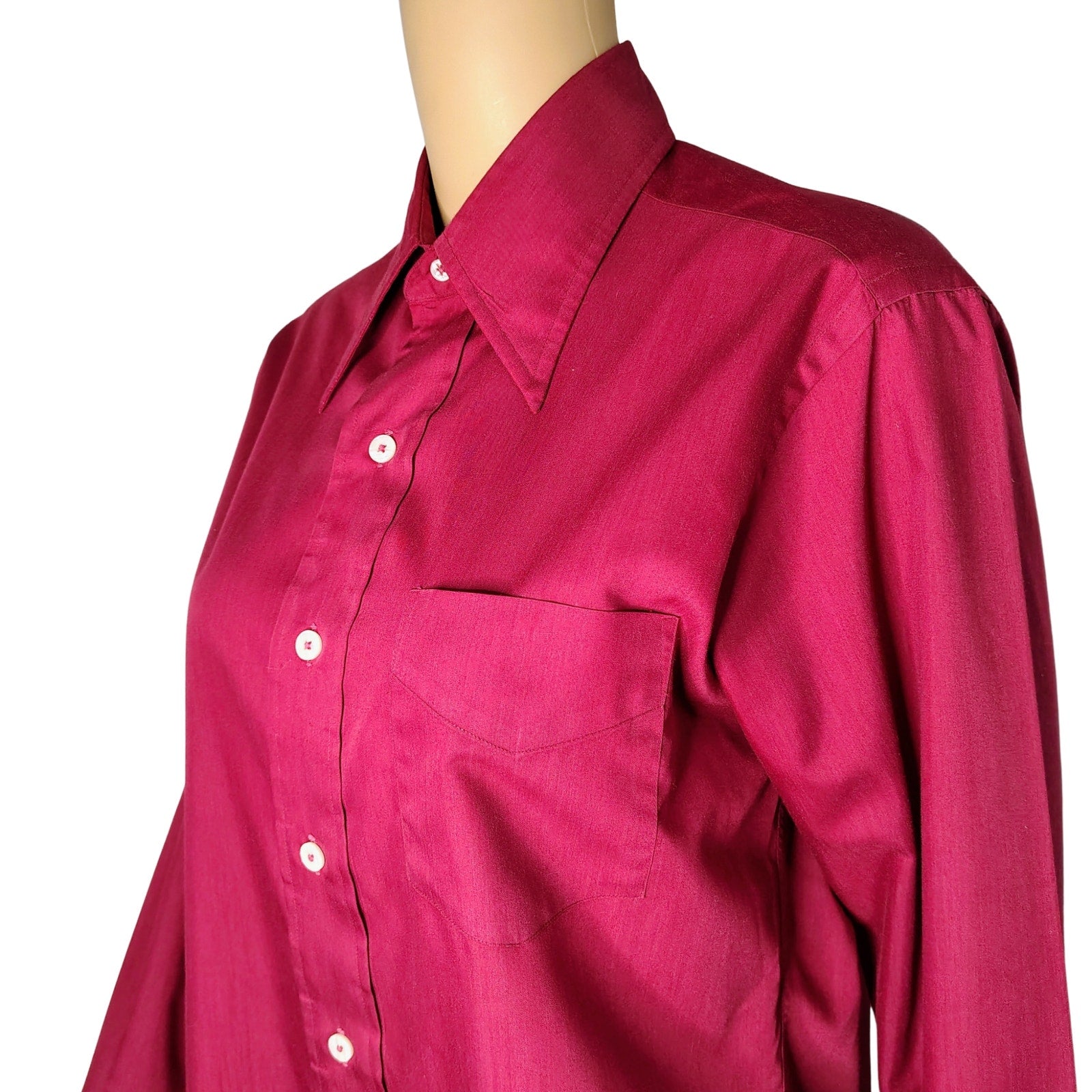 1970s Burgundy Wine Button Up Long Sleeve Folded Wrist Cuffs Permanent Press Dress Shirt. Folded long wing tip collar. Seven Pearl buttons run down the front. Rounded hemline.