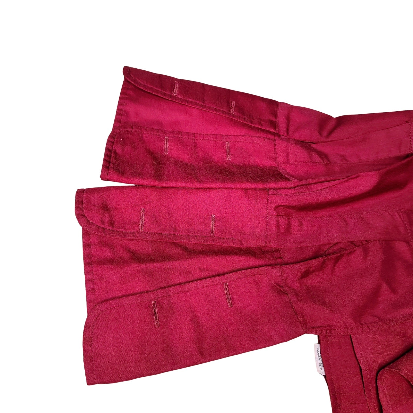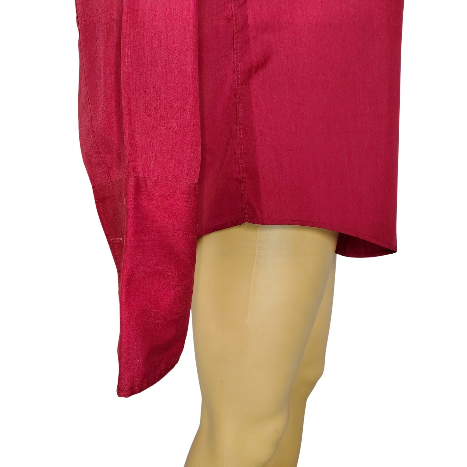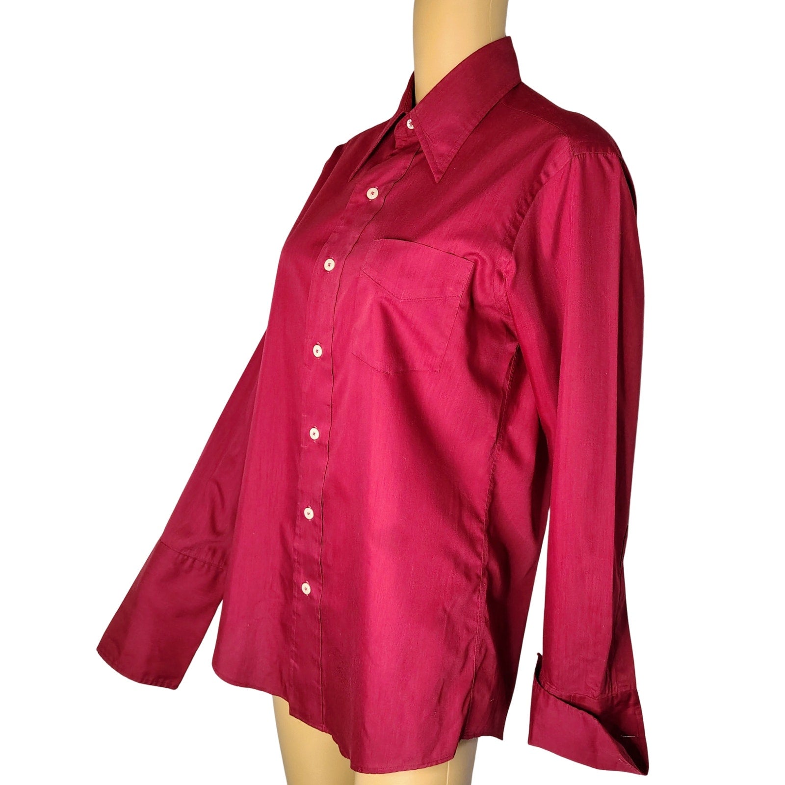 1970s Burgundy Wine Button Up Long Sleeve Folded Wrist Cuffs Permanent Press Dress Shirt. Folded long wing tip collar. Seven Pearl buttons run down the front. Rounded hemline.