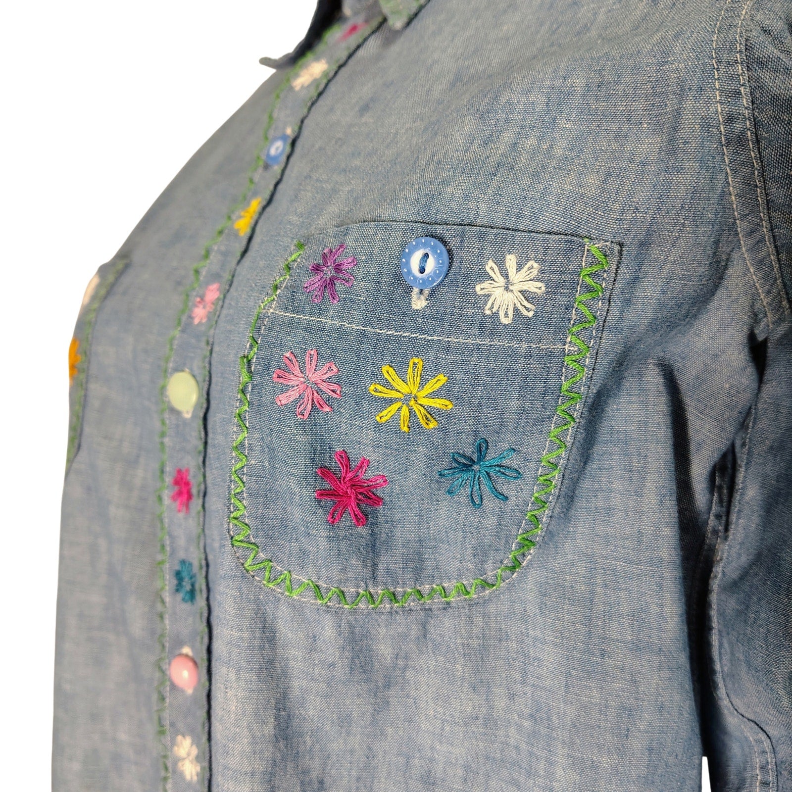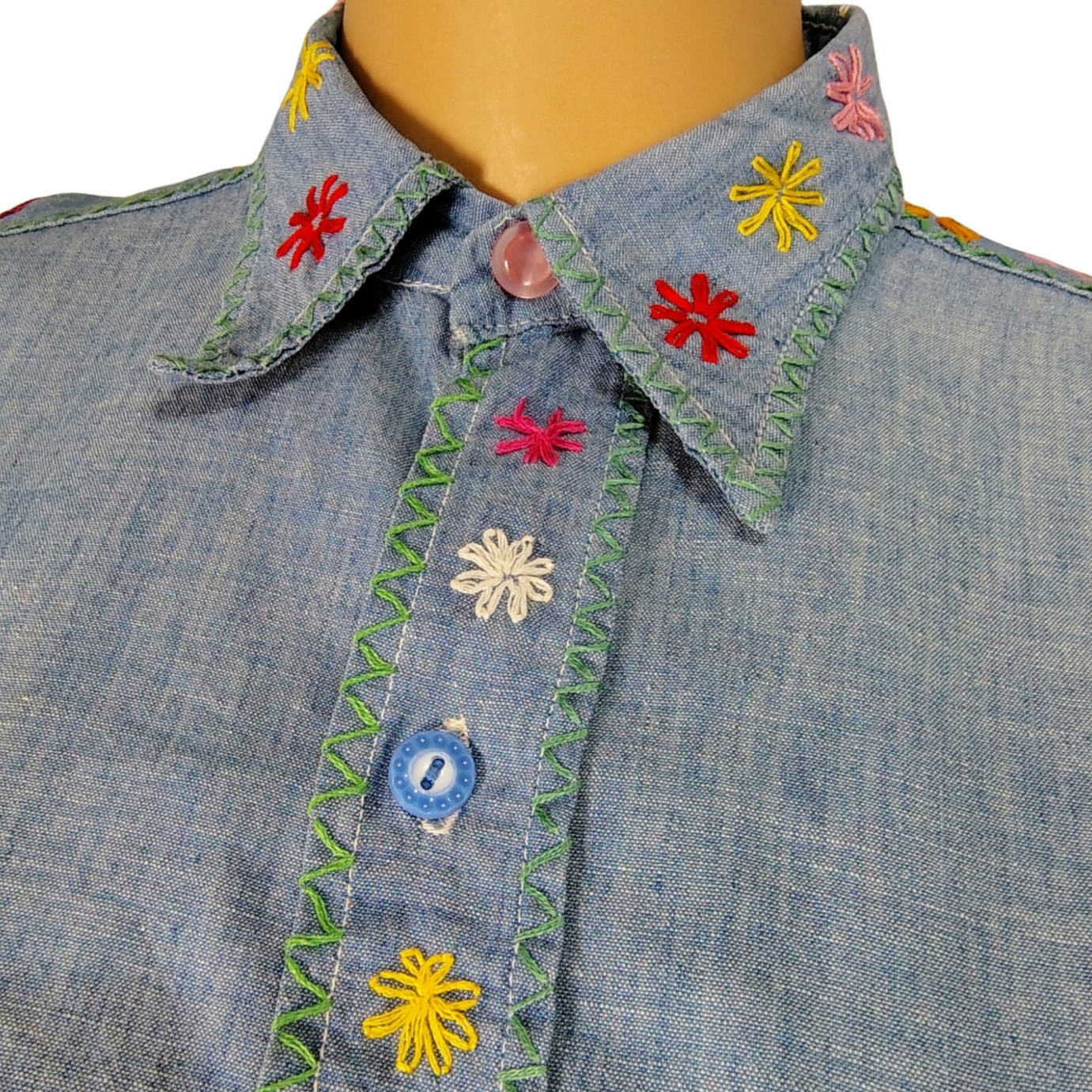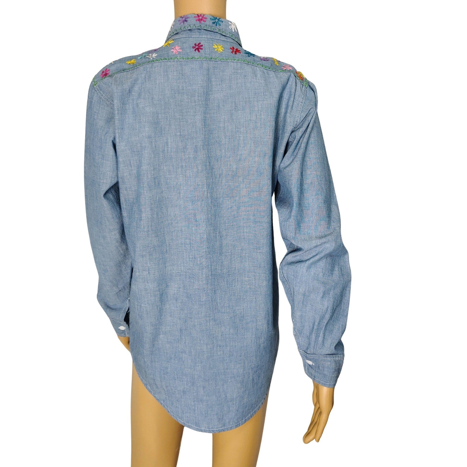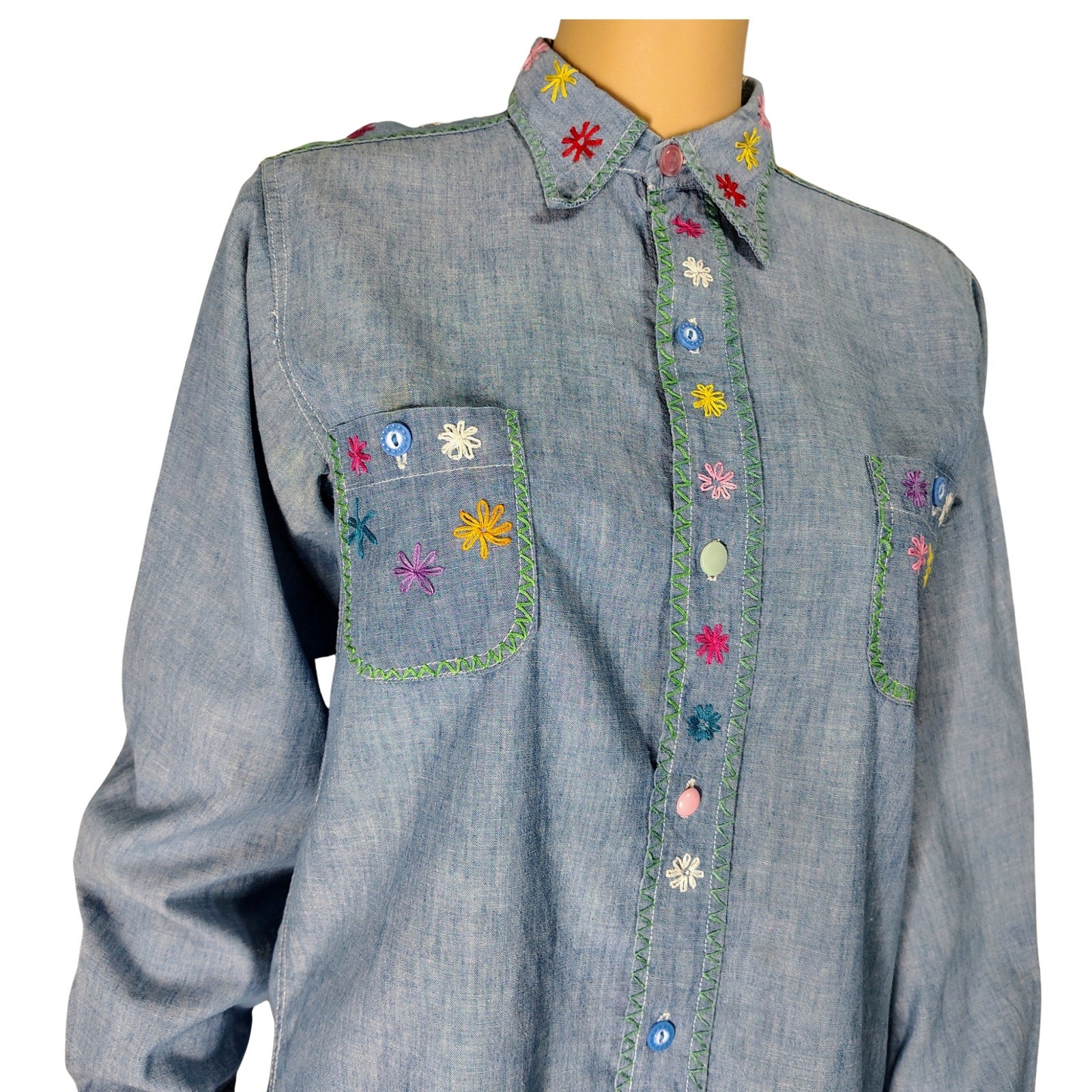 1970s Embroidered Daisies Chambray Blue Long Sleeve Button Up Shirt. Embroidered Daisies along collar, yoke, placket and pockets. Six colorful unmatched buttons run down the front. Two matching blue buttons secure each chest pocket. One white button on each wrist cuff. Embroidered plus white seam detail. Rounded hem.