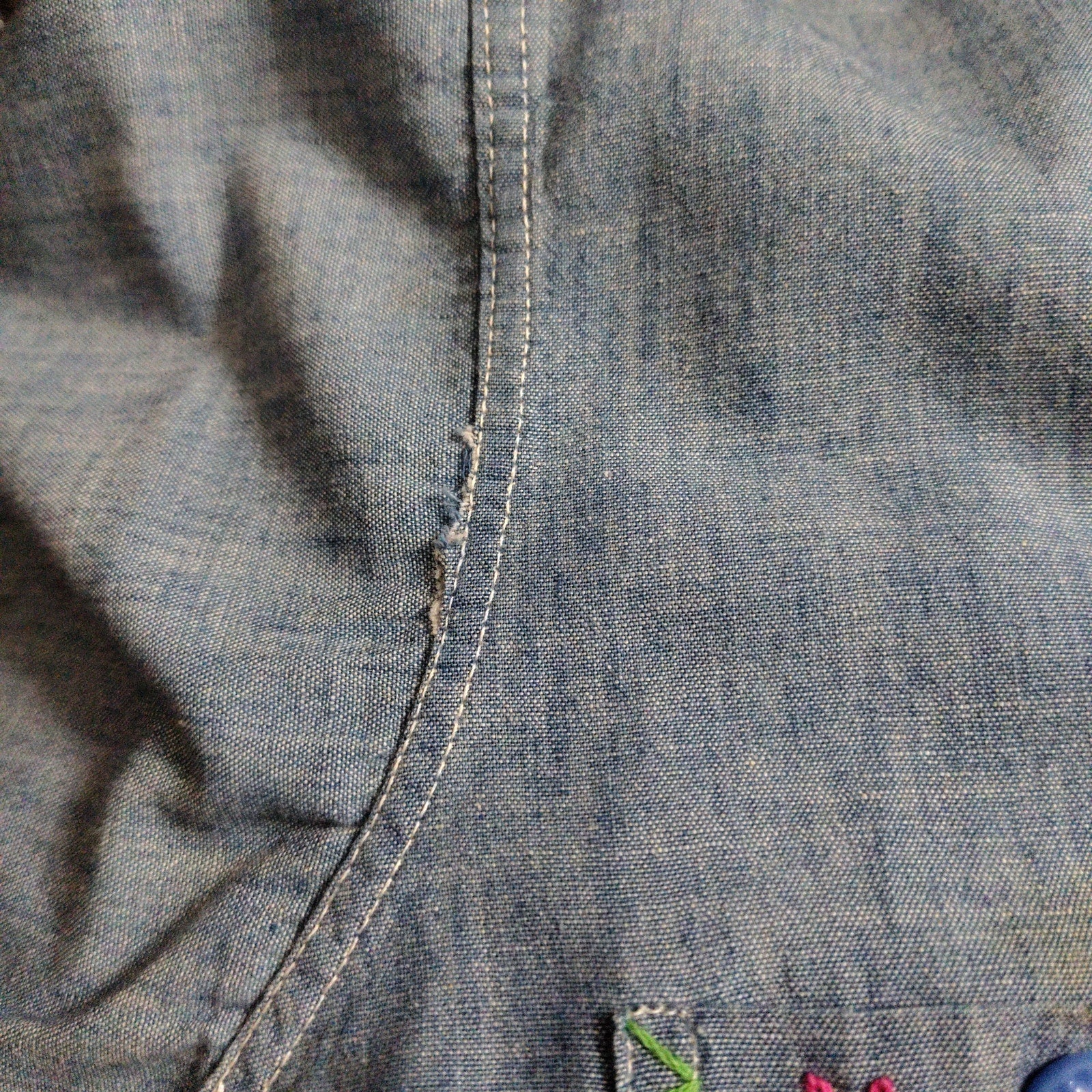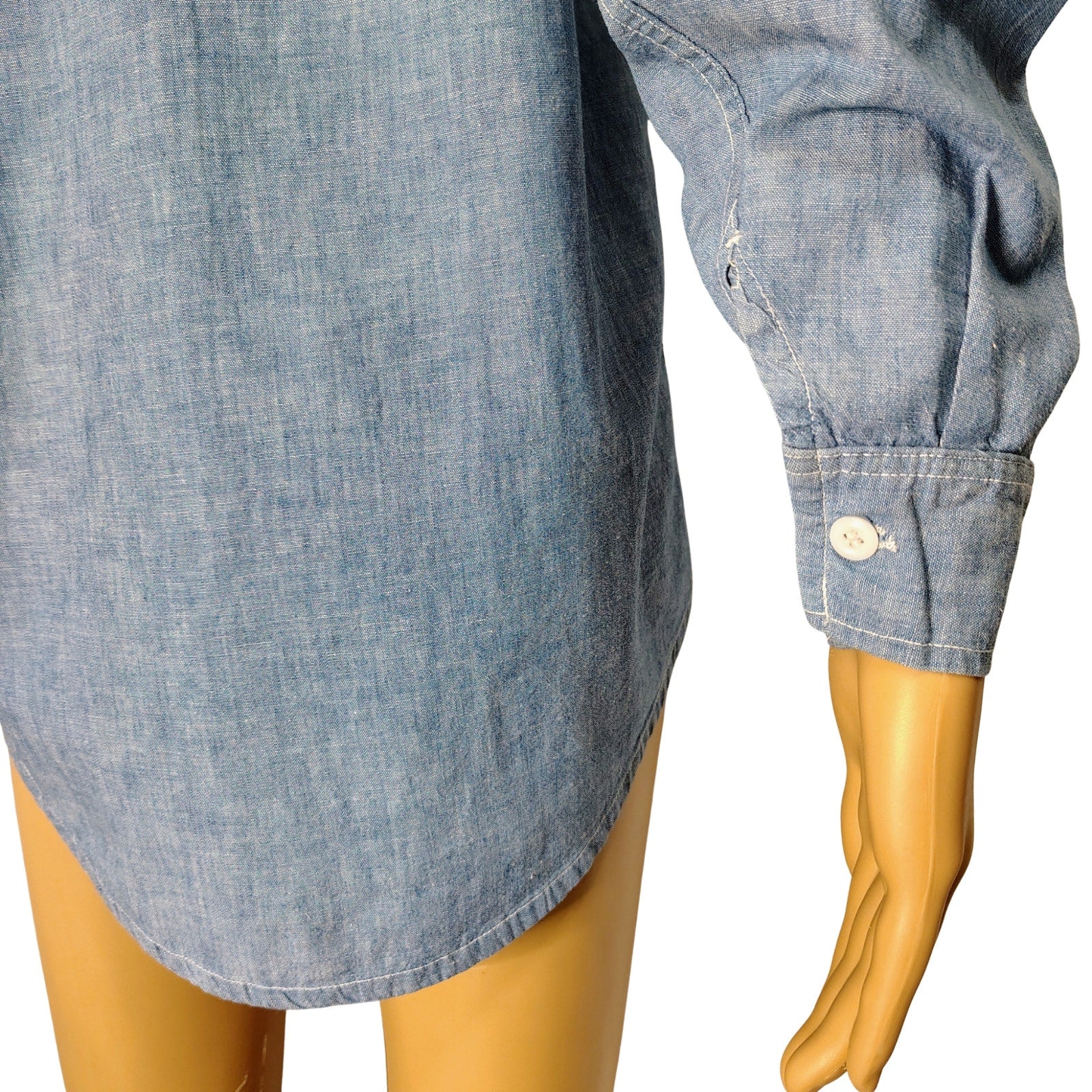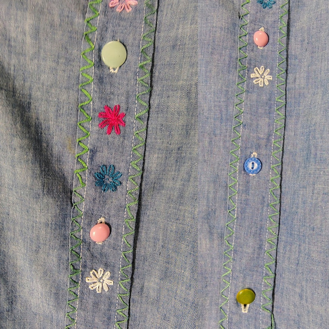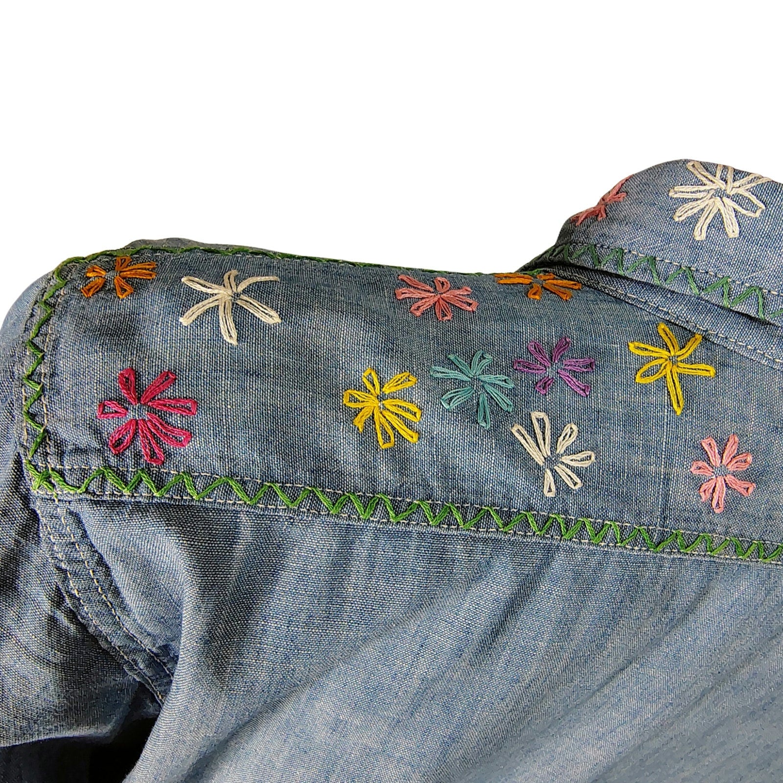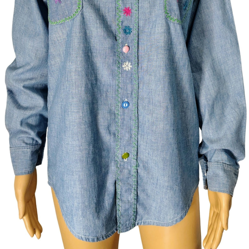 1970s Embroidered Daisies Chambray Blue Long Sleeve Button Up Shirt. Embroidered Daisies along collar, yoke, placket and pockets. Six colorful unmatched buttons run down the front. Two matching blue buttons secure each chest pocket. One white button on each wrist cuff. Embroidered plus white seam detail. Rounded hem.