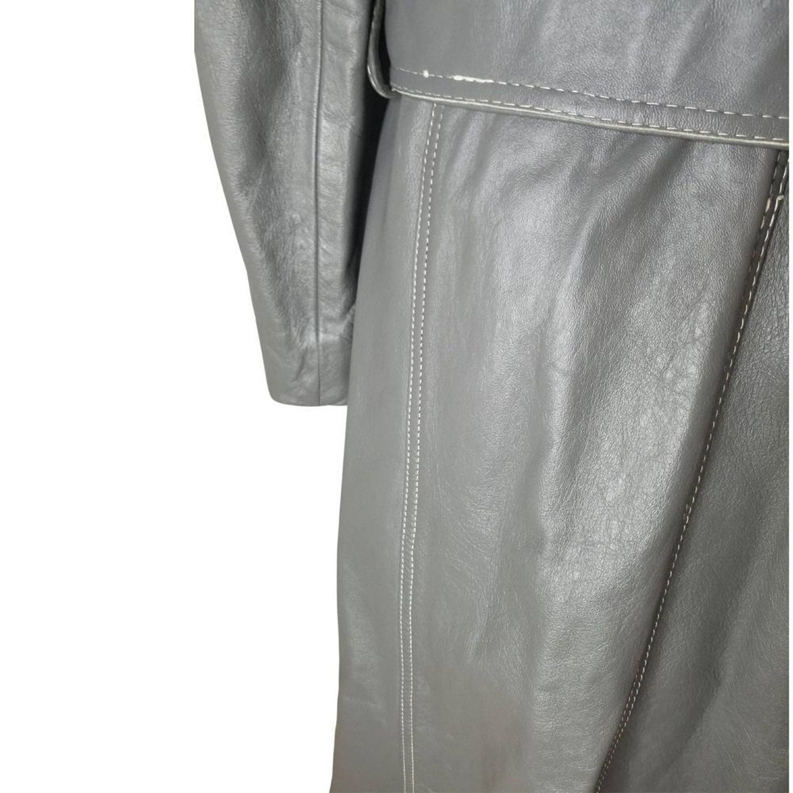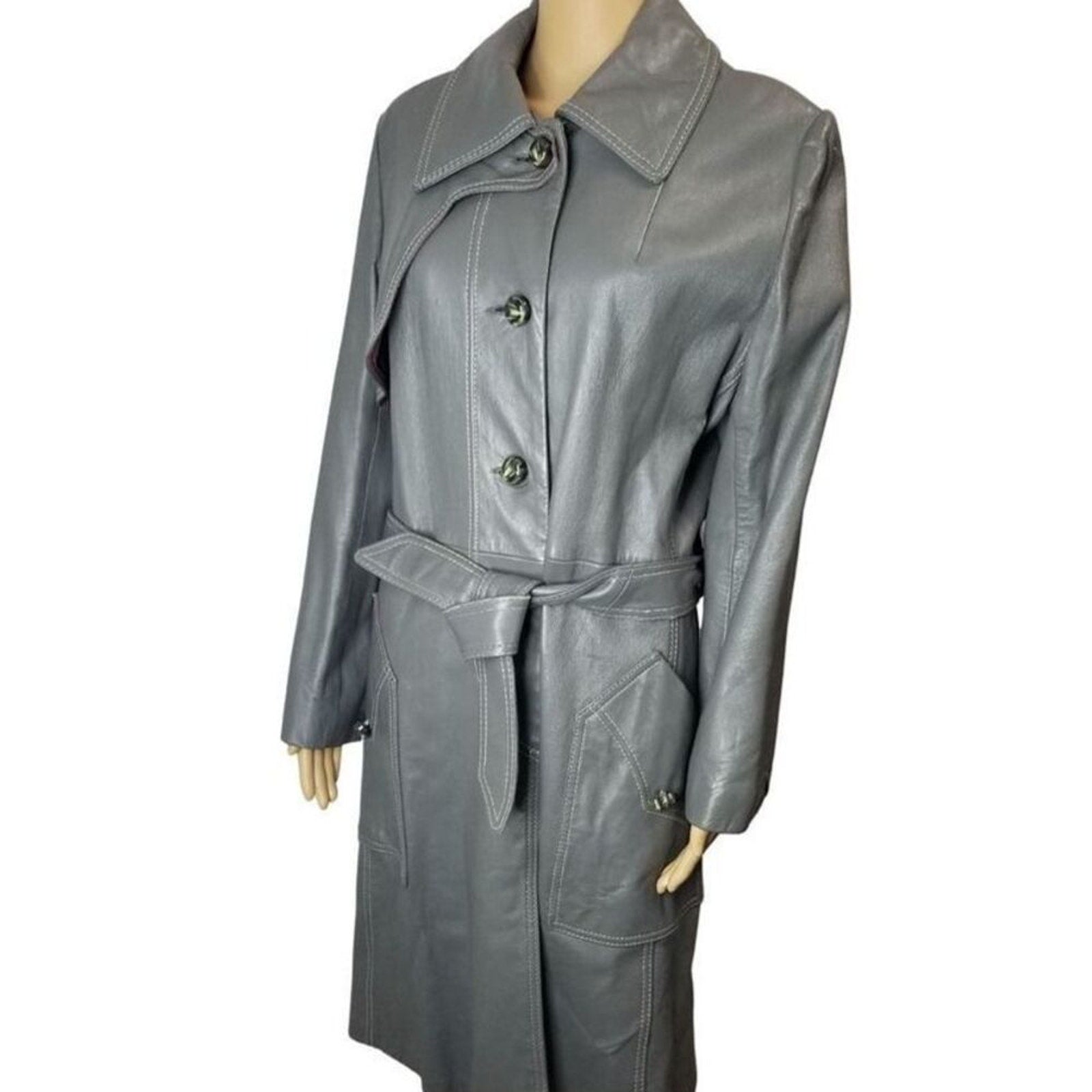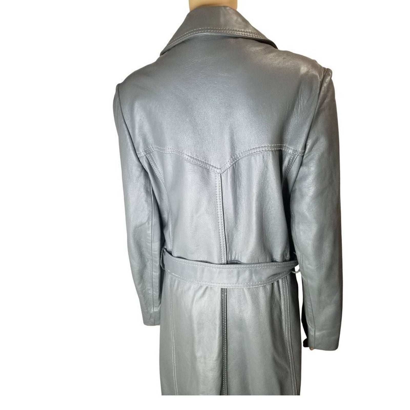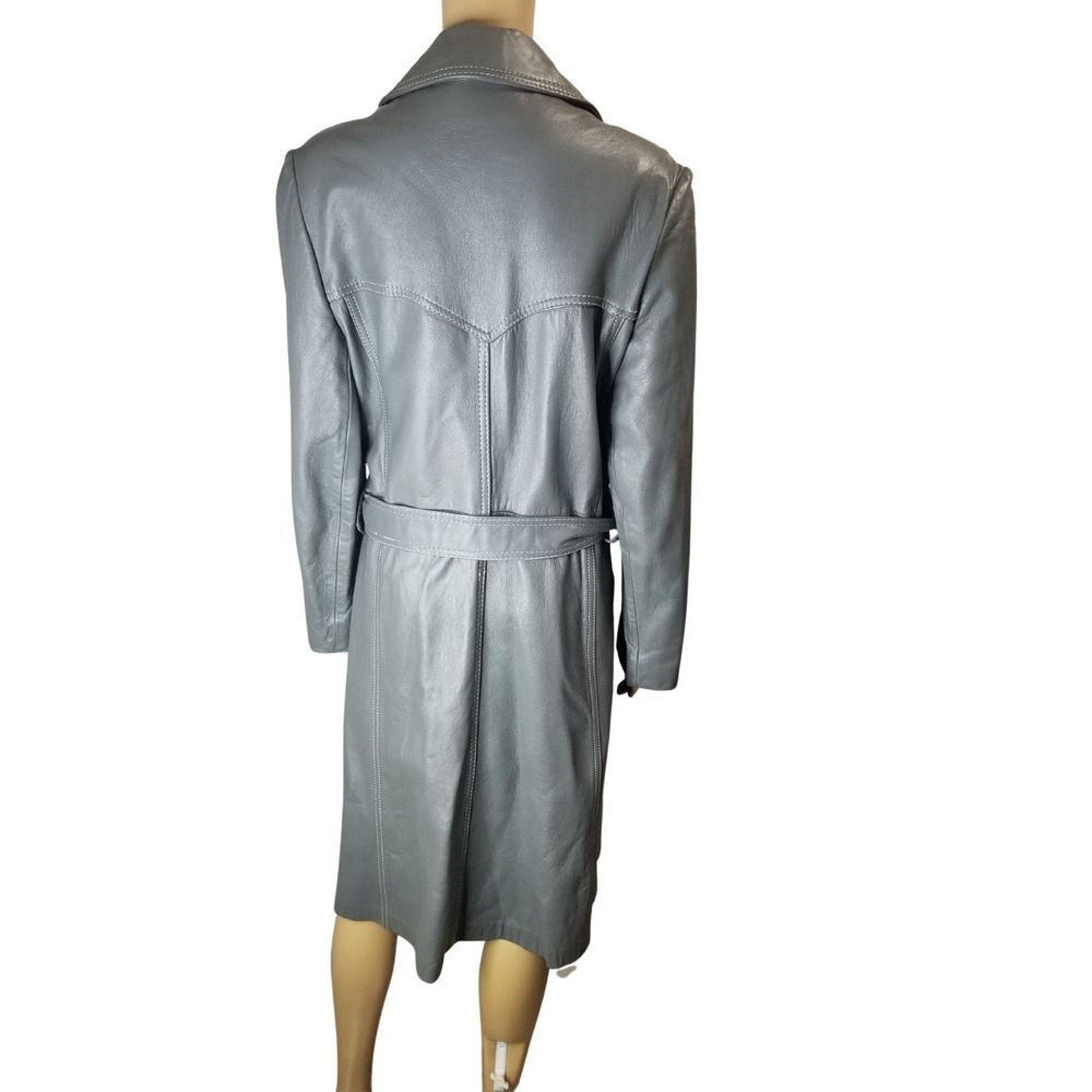 1970s Gray Belted Long Leather Trench Coat Collar Big Pockets Size Med Vintage
