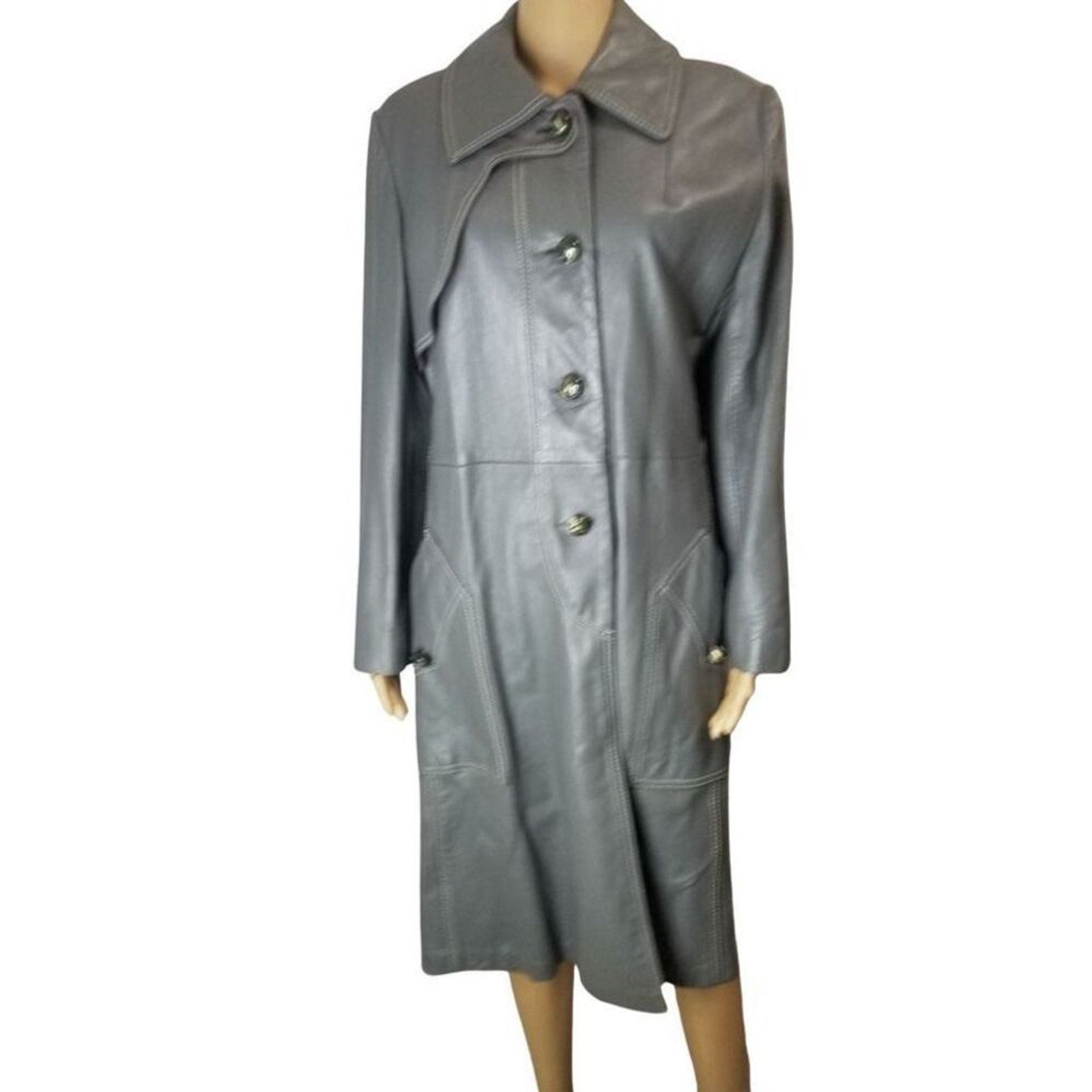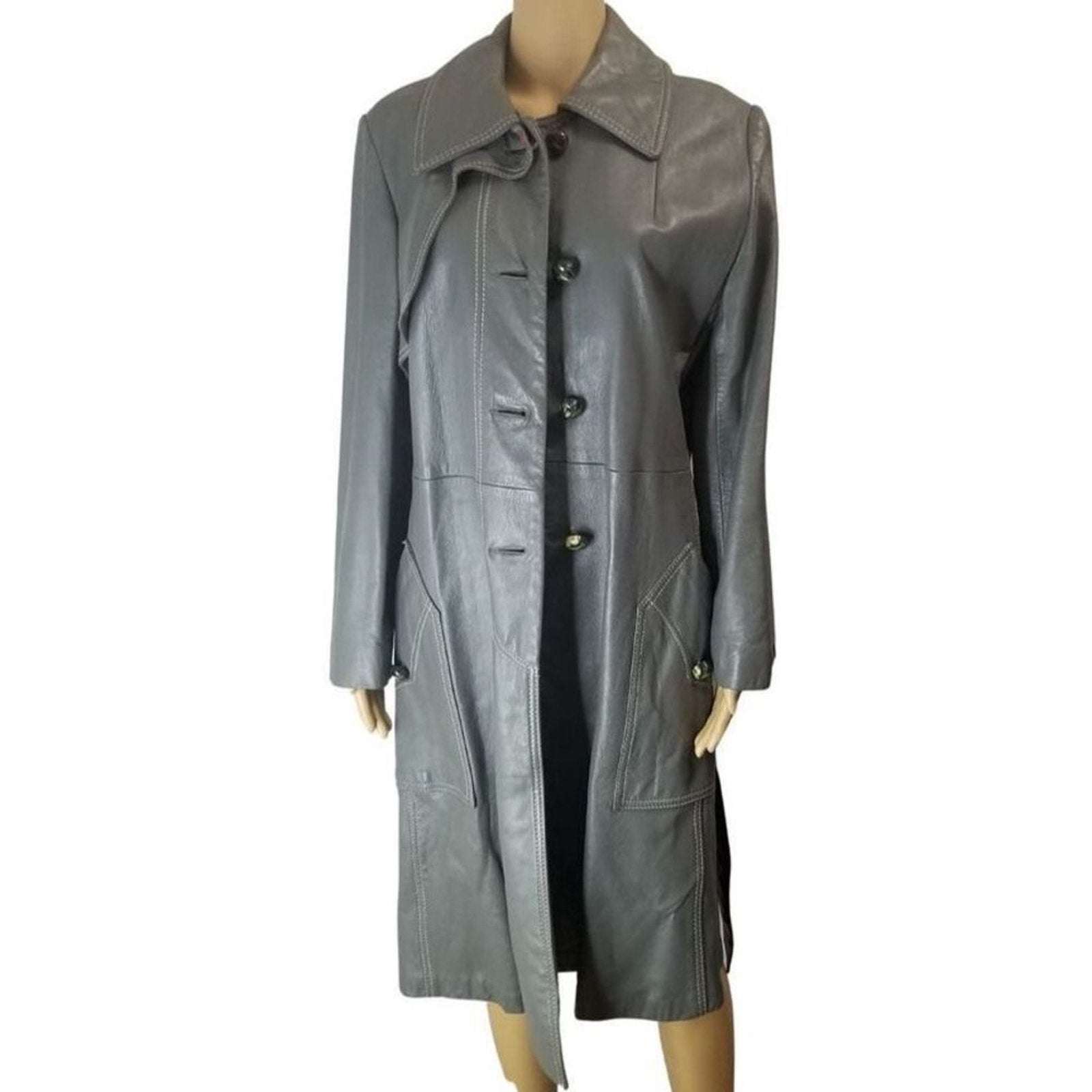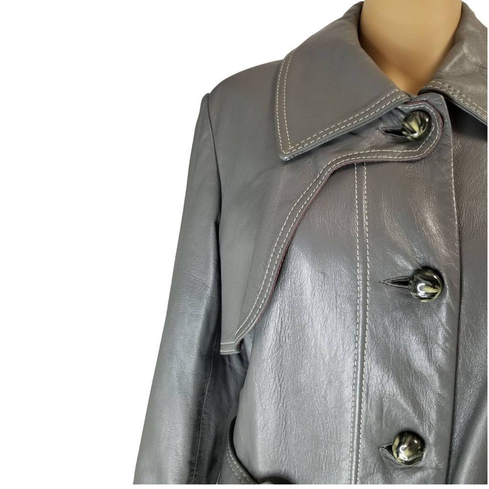 Vintage Lazarus Original by Peter Caruso gray leather belted butterfly collar coat. Calf length with huge open pockets. Each pocket is adorned with the same big round top faux marble buttons that run down the front. Four buttons close the half top of the coat leaving the bottom open. White double seam detail throughout. Lined. Right chest overlay.