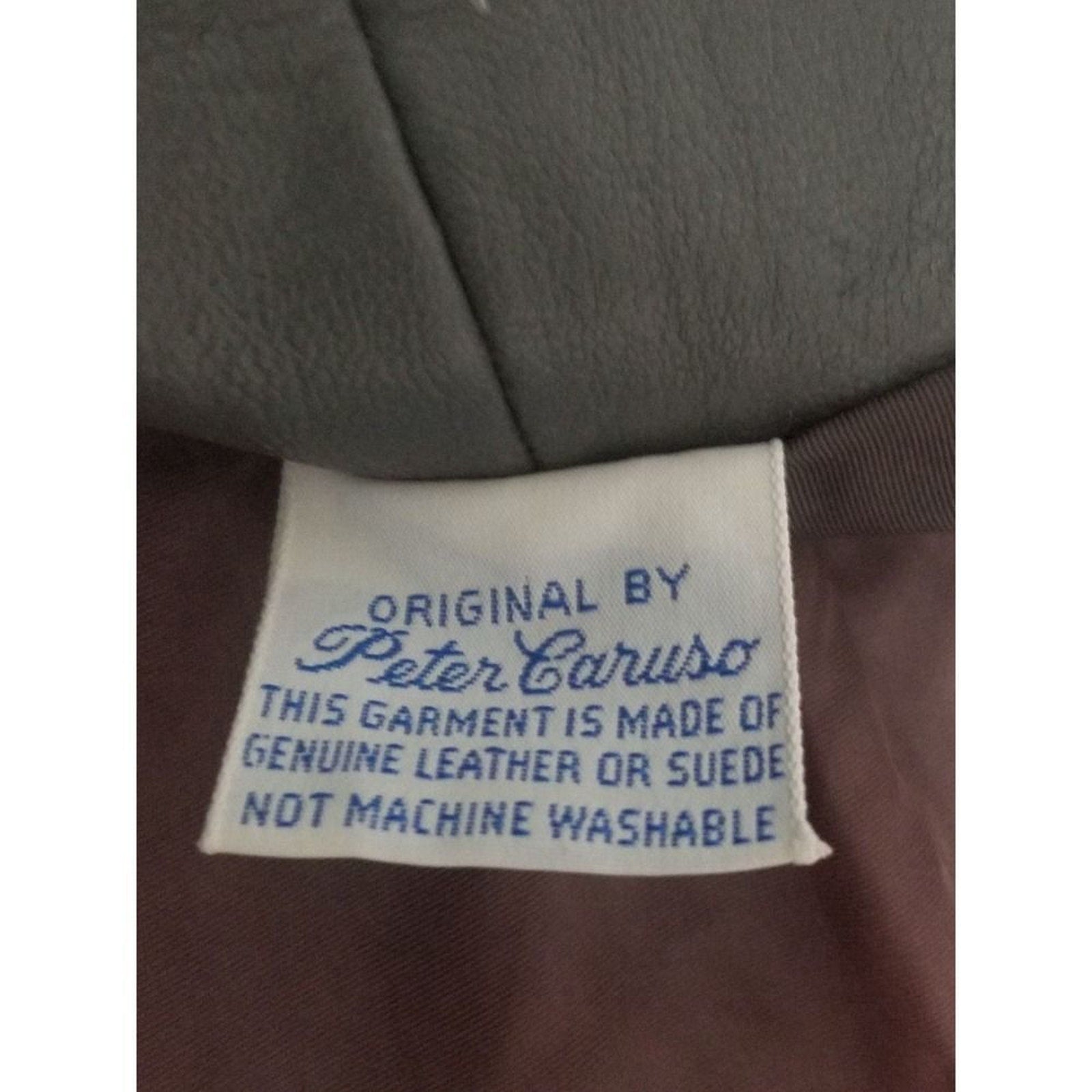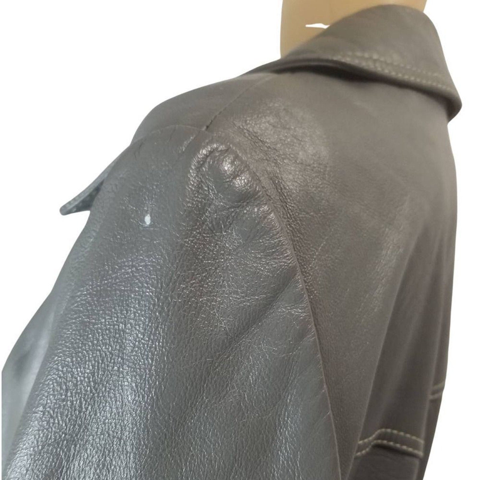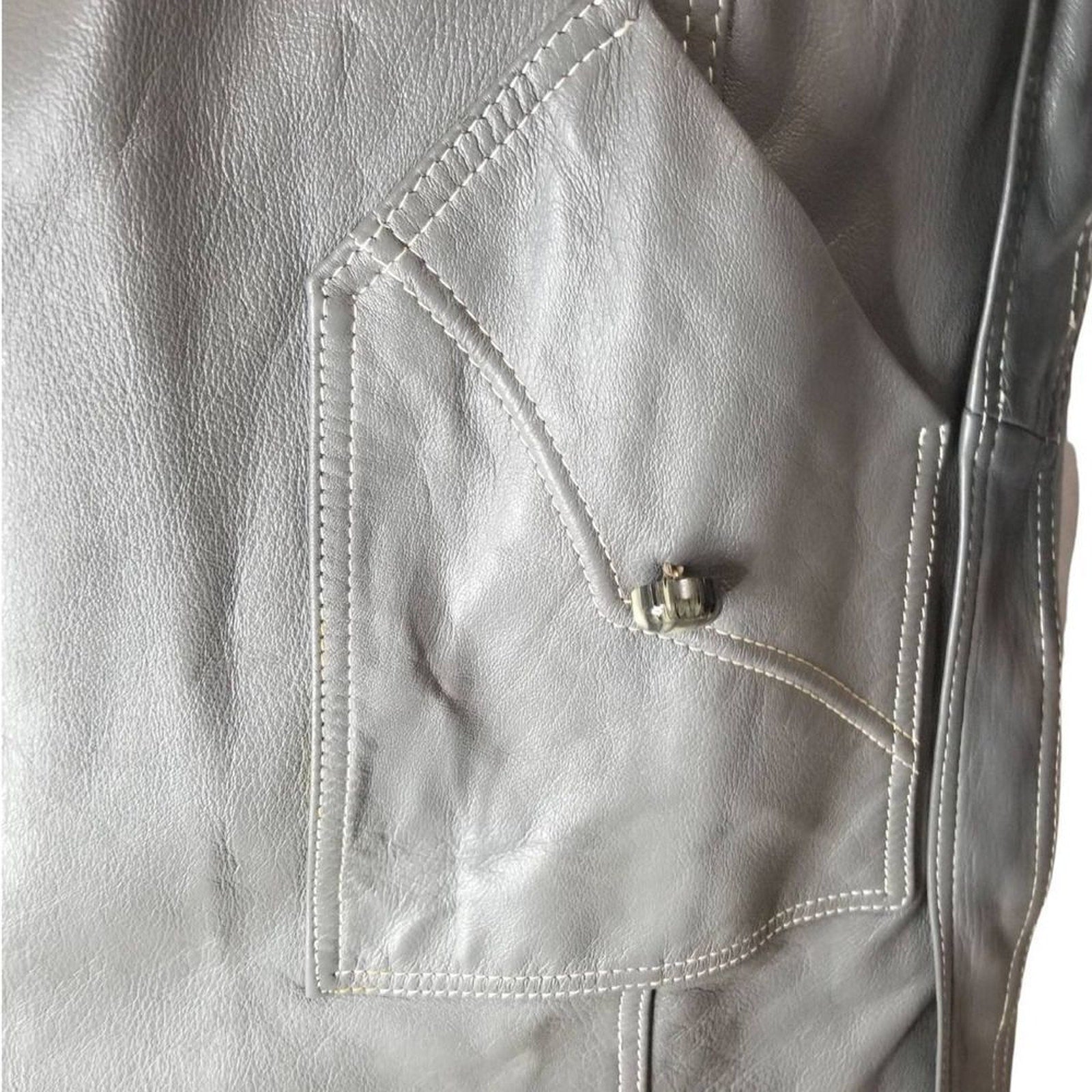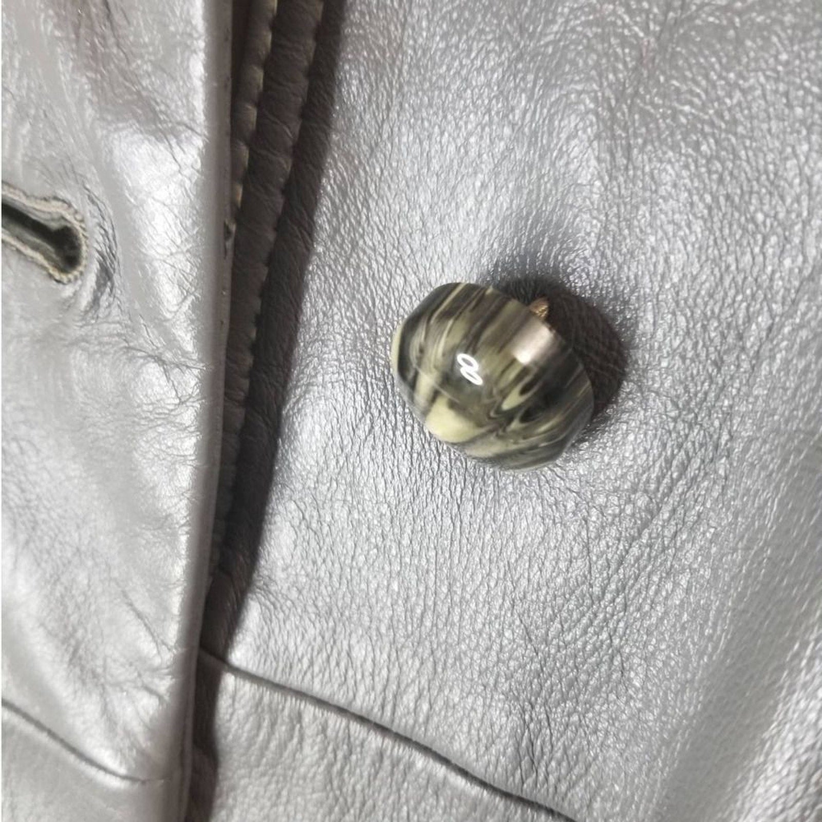 Vintage Lazarus Original by Peter Caruso gray leather belted butterfly collar coat. Calf length with huge open pockets. Each pocket is adorned with the same big round top faux marble buttons that run down the front. Four buttons close the half top of the coat leaving the bottom open. White double seam detail throughout. Lined. Right chest overlay.