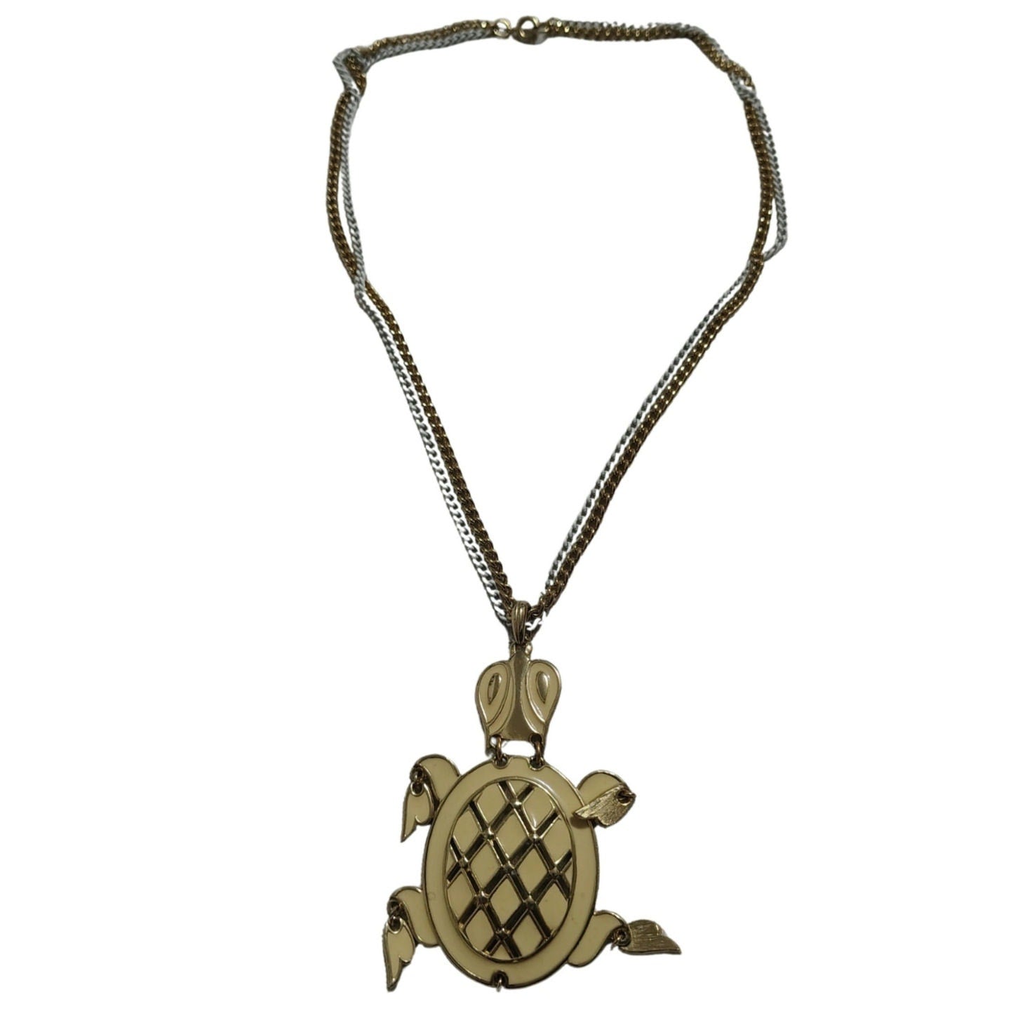 1970s Mod Asian Articulated Tortoise Moveable Pendant Turtle on White and Gold 23" Chain Link Necklace