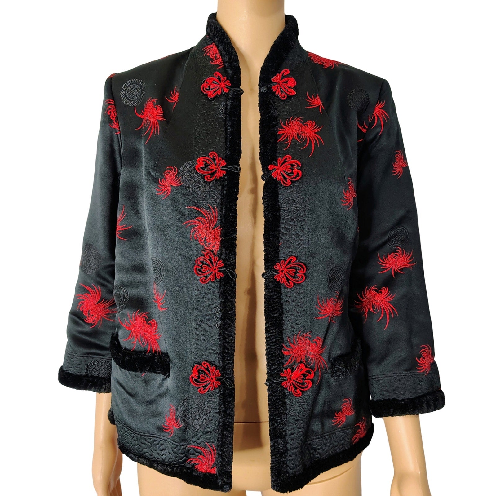 1970s Red Black Reversible Chinese Hand Embroidered Fur Evening Jacket Size Small Vintage