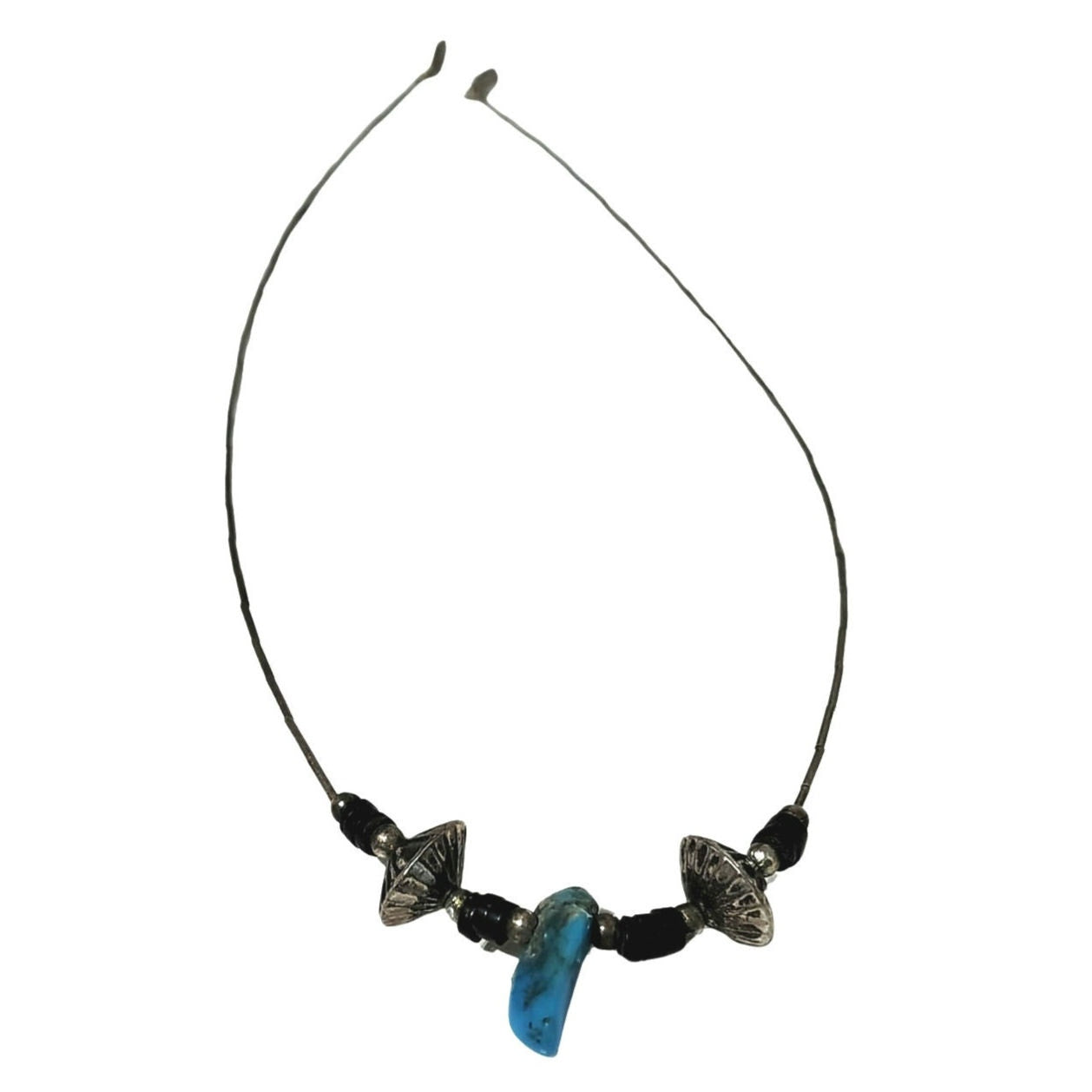 1970s Sterling Silver Liquid Beads Uncut Turquoise Stone Statement Boho Necklace