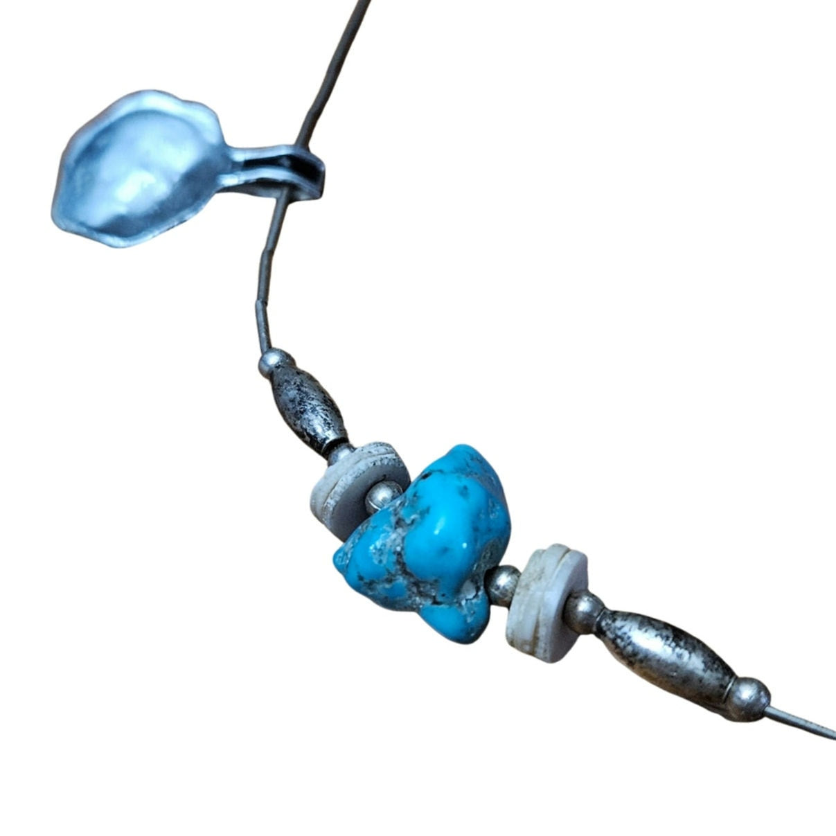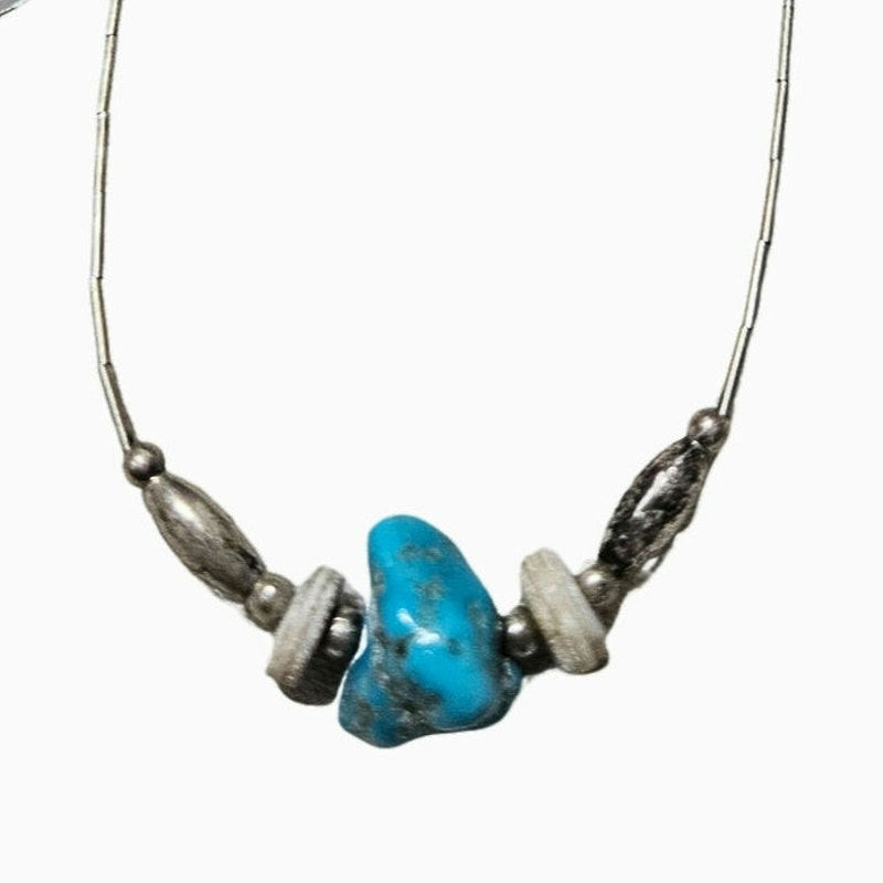 1970s Sterling Silver Liquid + Shell Beads + Uncut Turquoise Stone Necklace