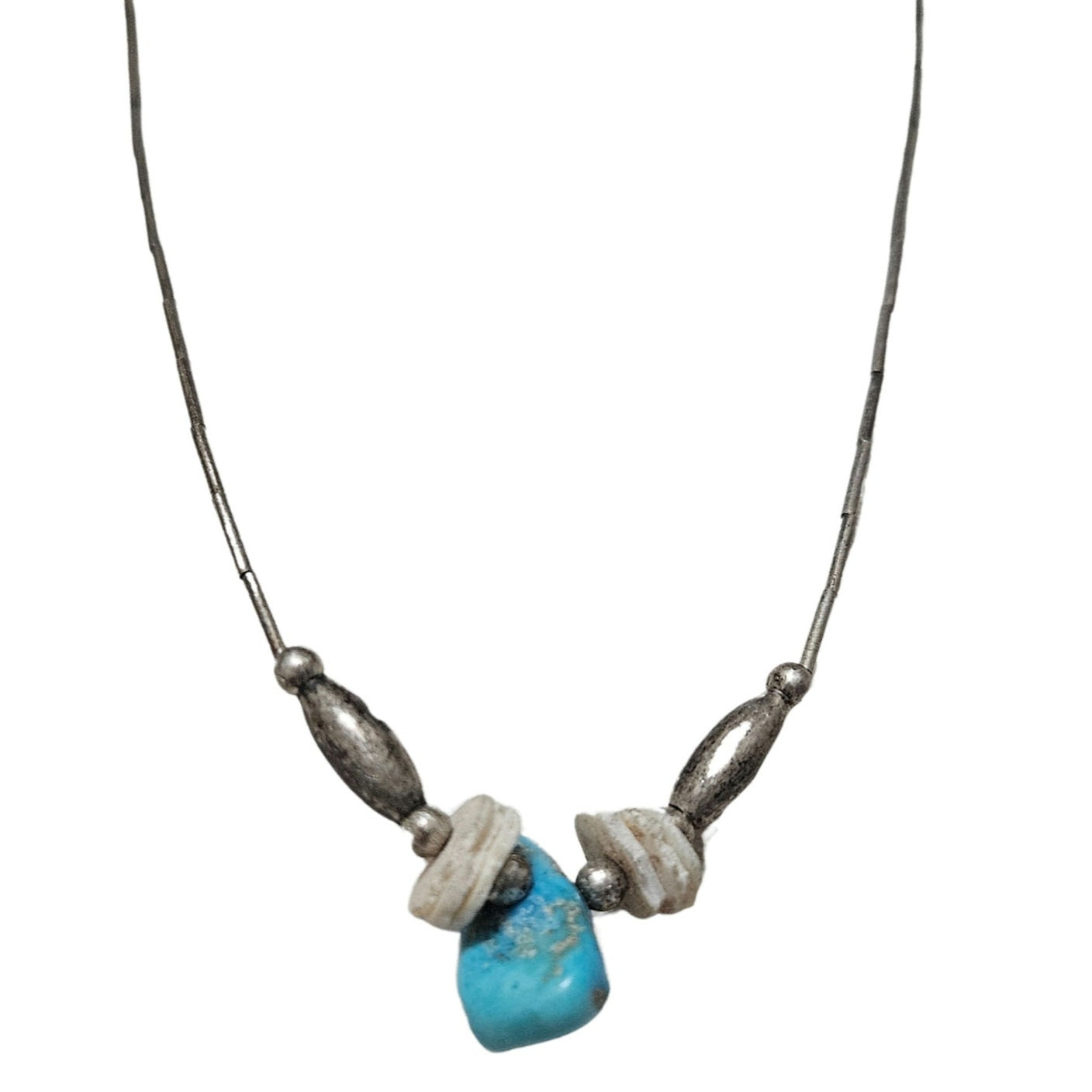 1970s Sterling Silver Liquid + Shell Beads + Uncut Turquoise Stone Necklace