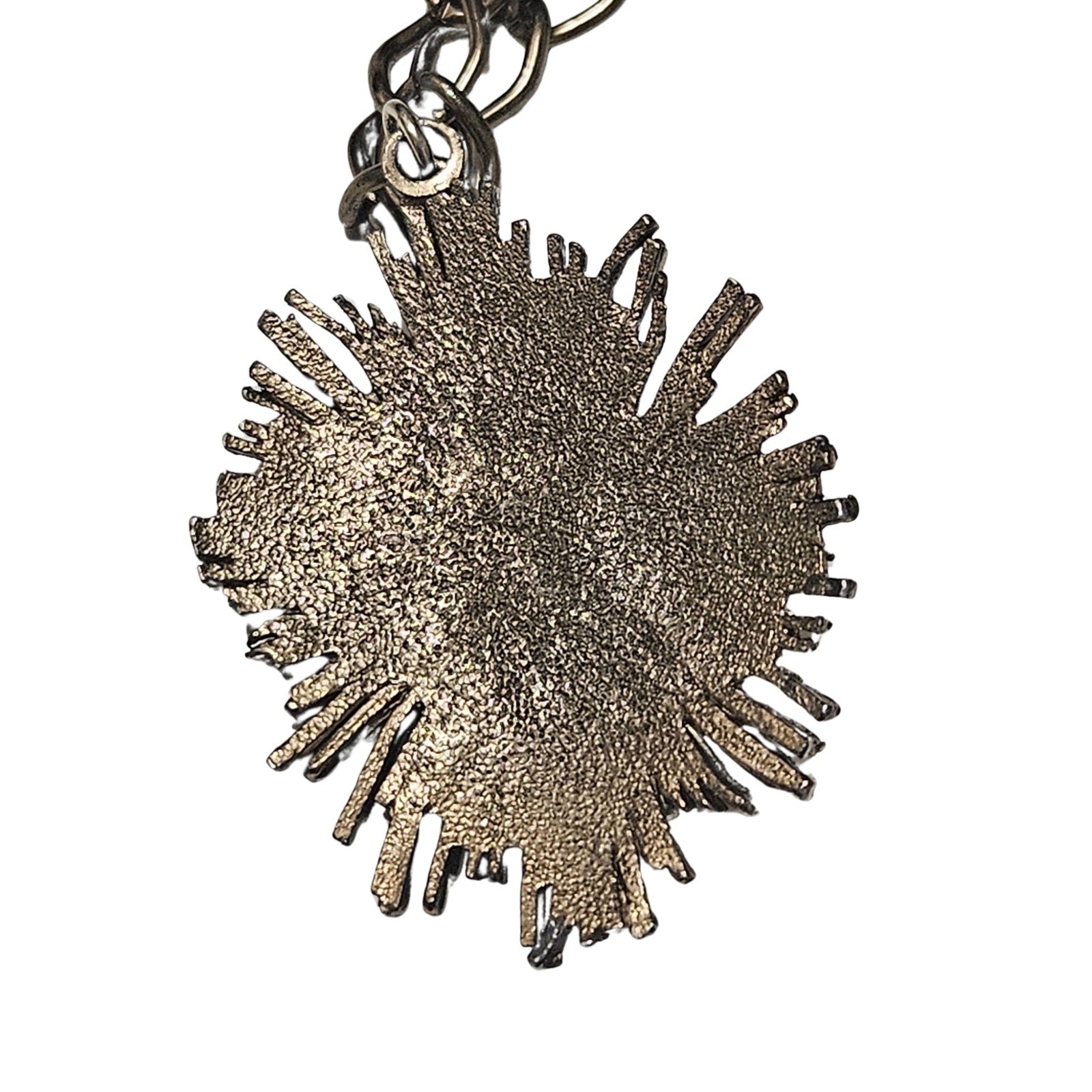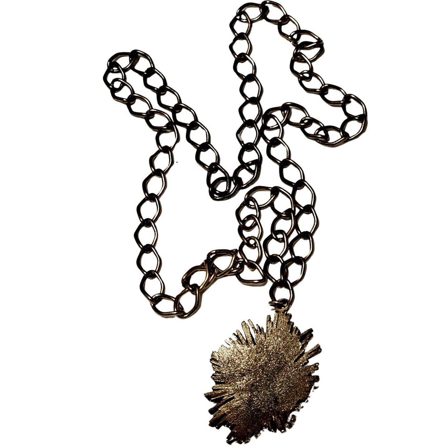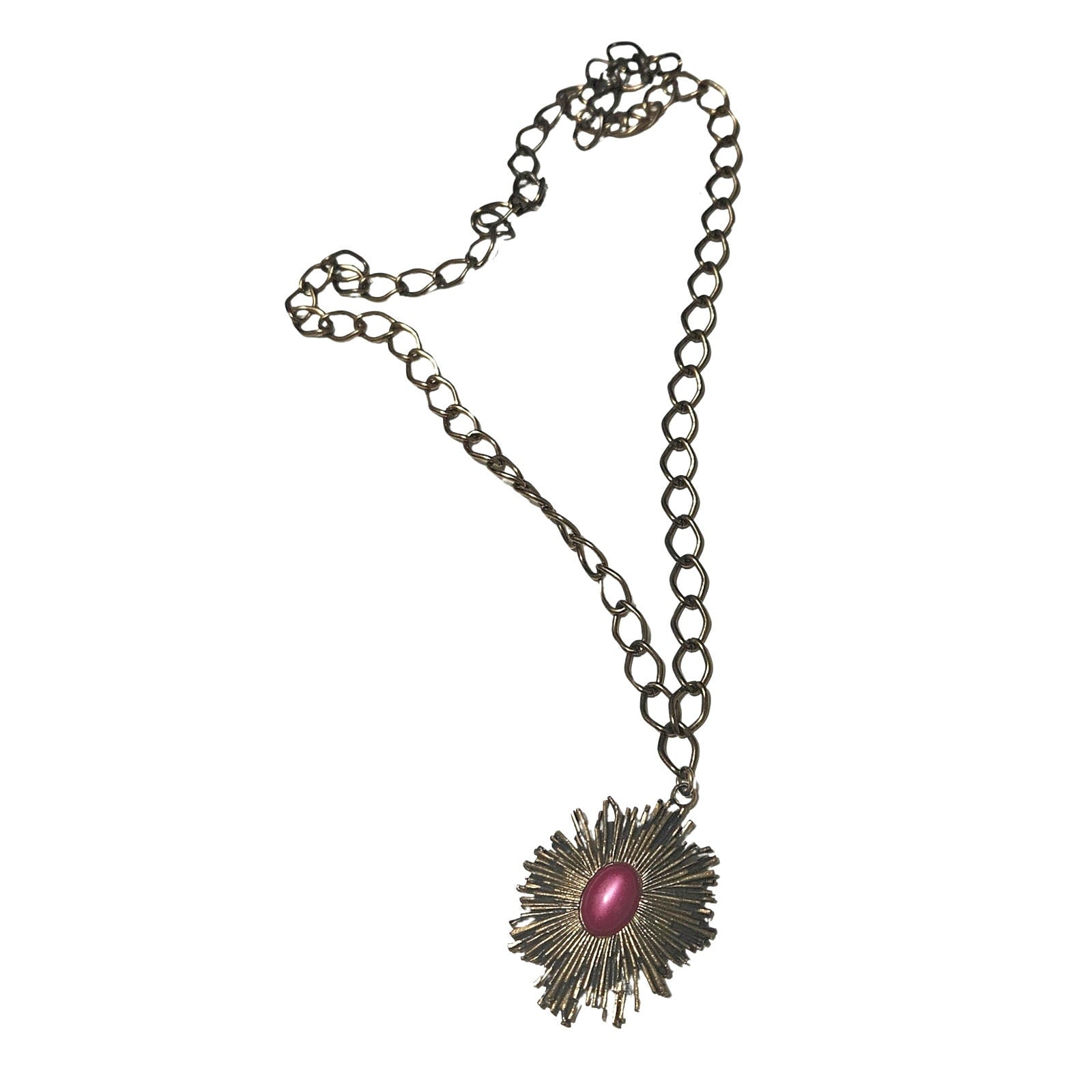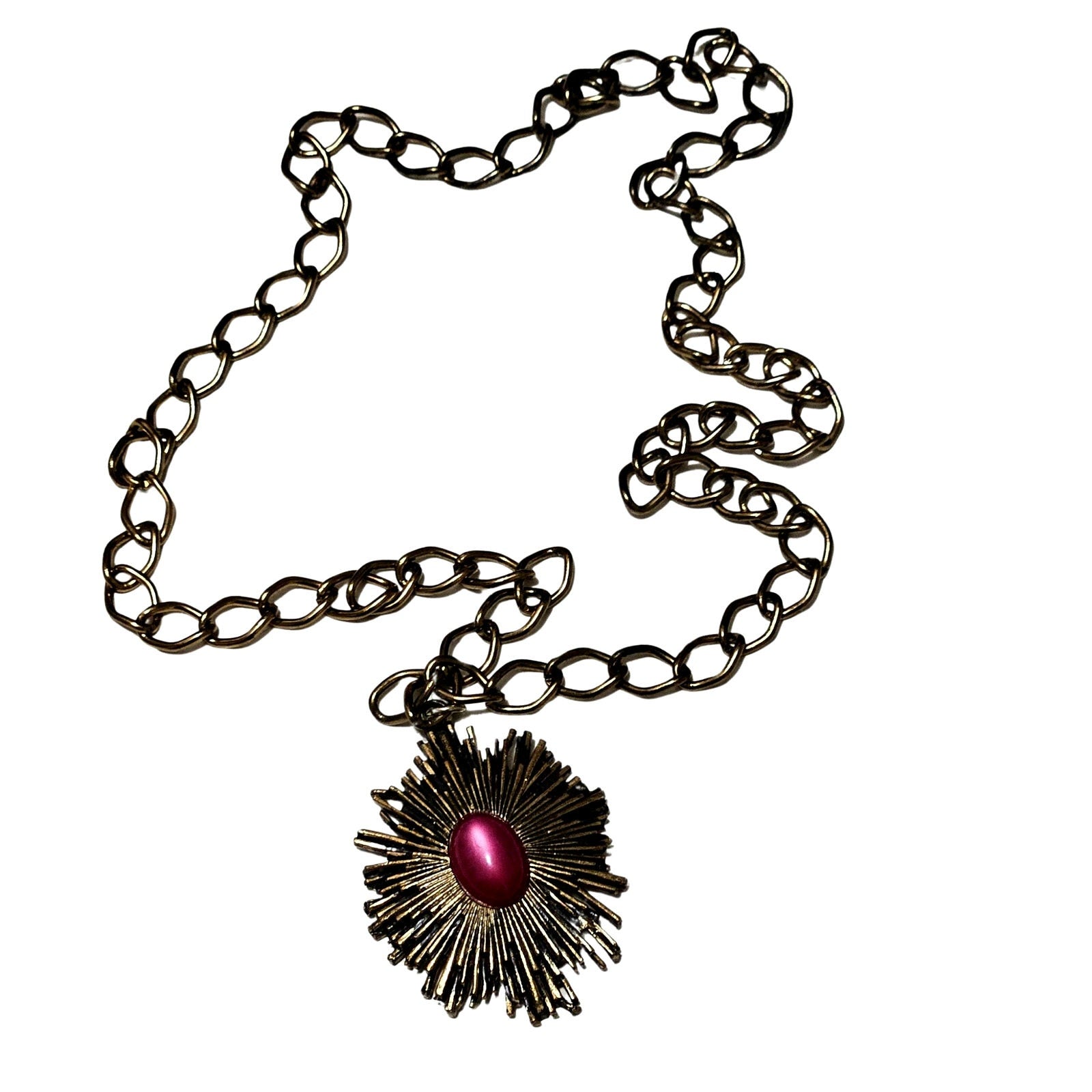 1970s Sunburst Pendant Pink Cabachon Center Bead Large Linked Chain Pullover Necklace. One continual loop without a closure or opening. Mid century modern vintage.
