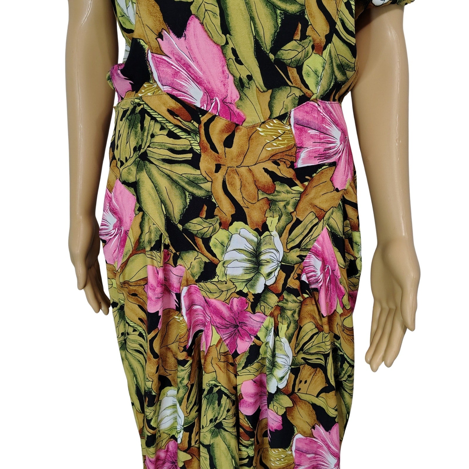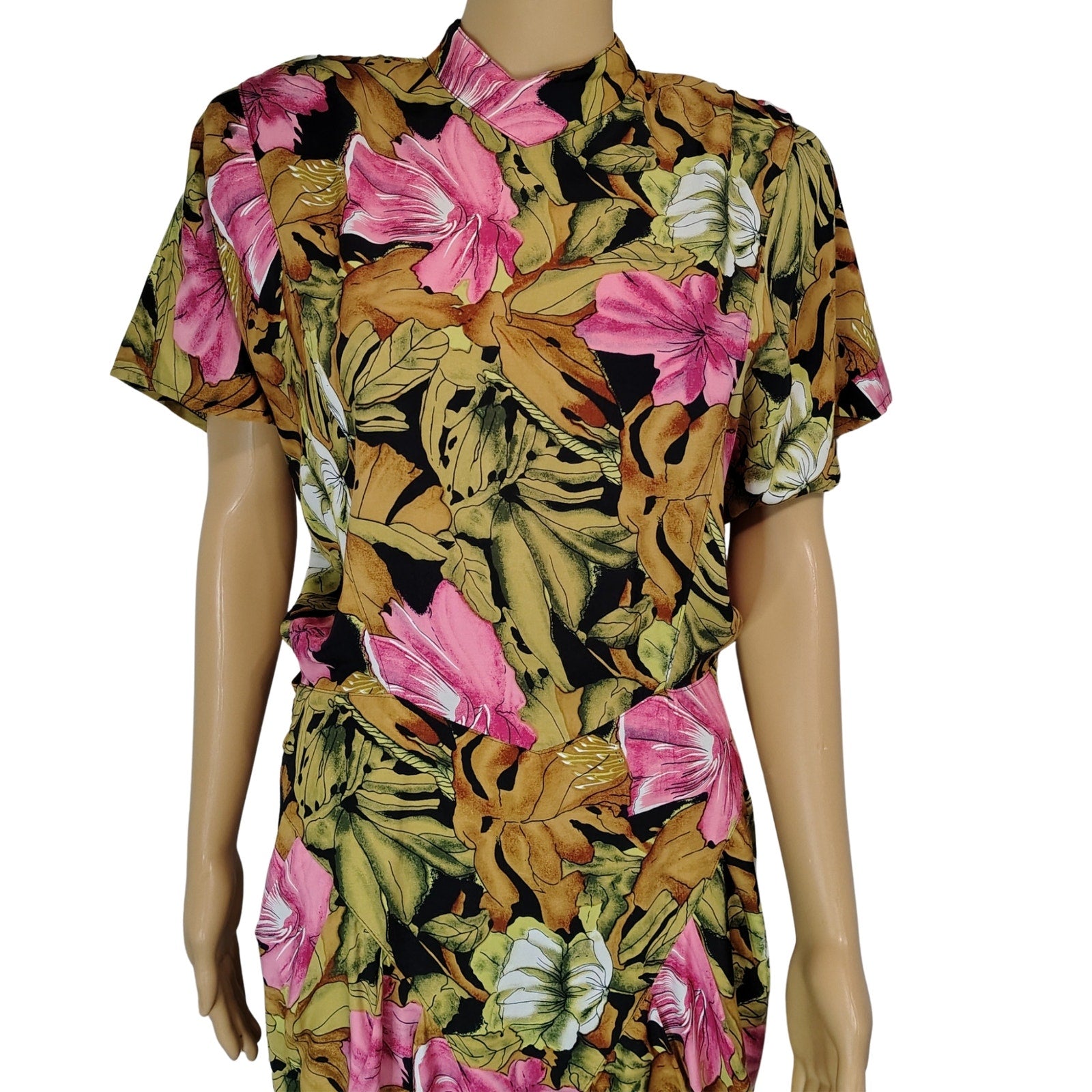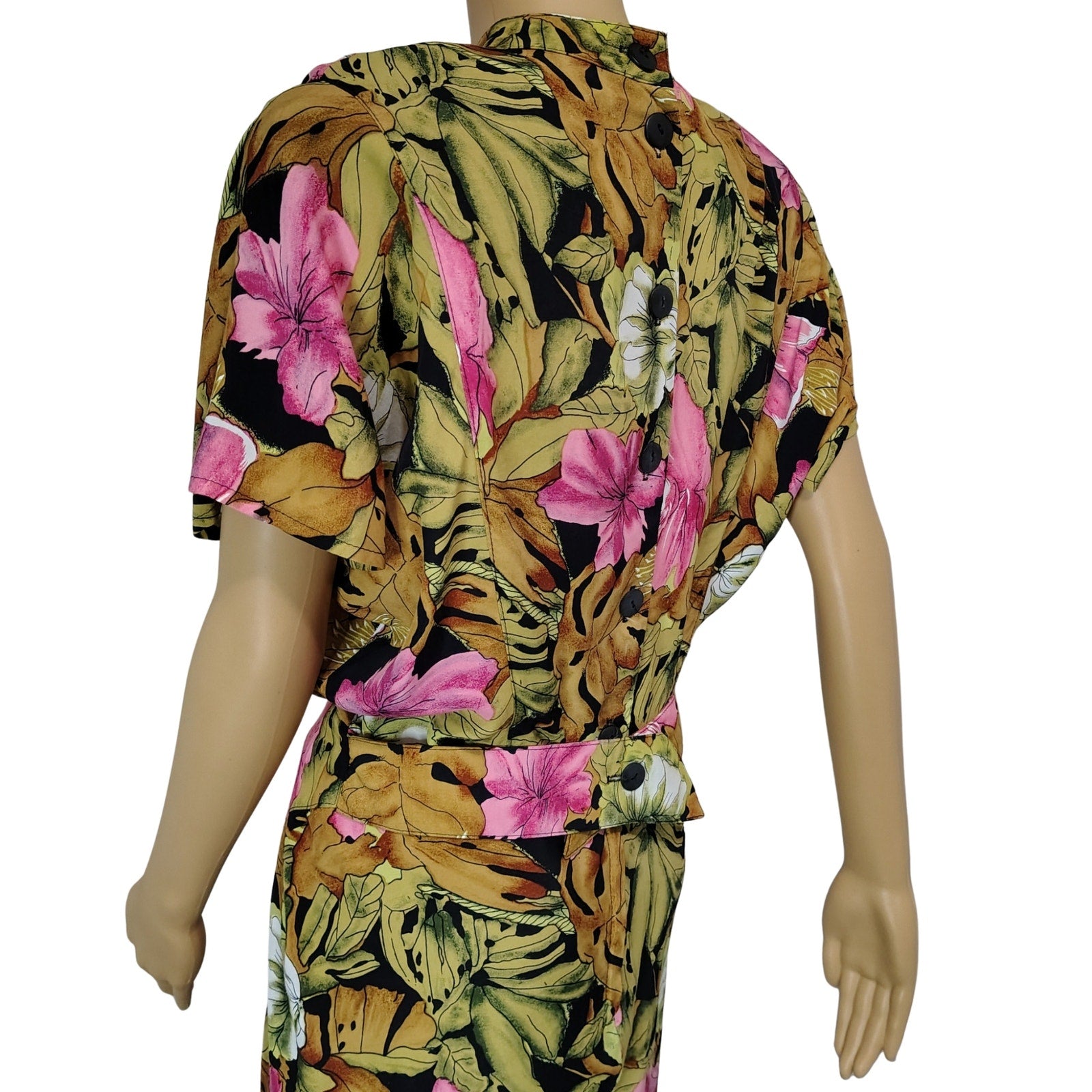 1980s April Rain Tropical Wiggle Dress Shoulder Pads Button Up Back Size Small [Vintage]
