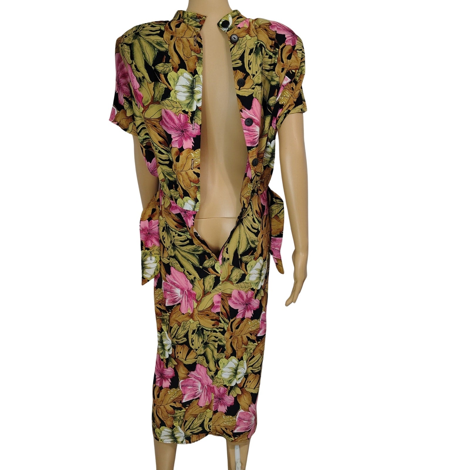 1980s April Rain Tropical Wiggle Dress Detachable Shoulder Pads Button Up Back Size Small