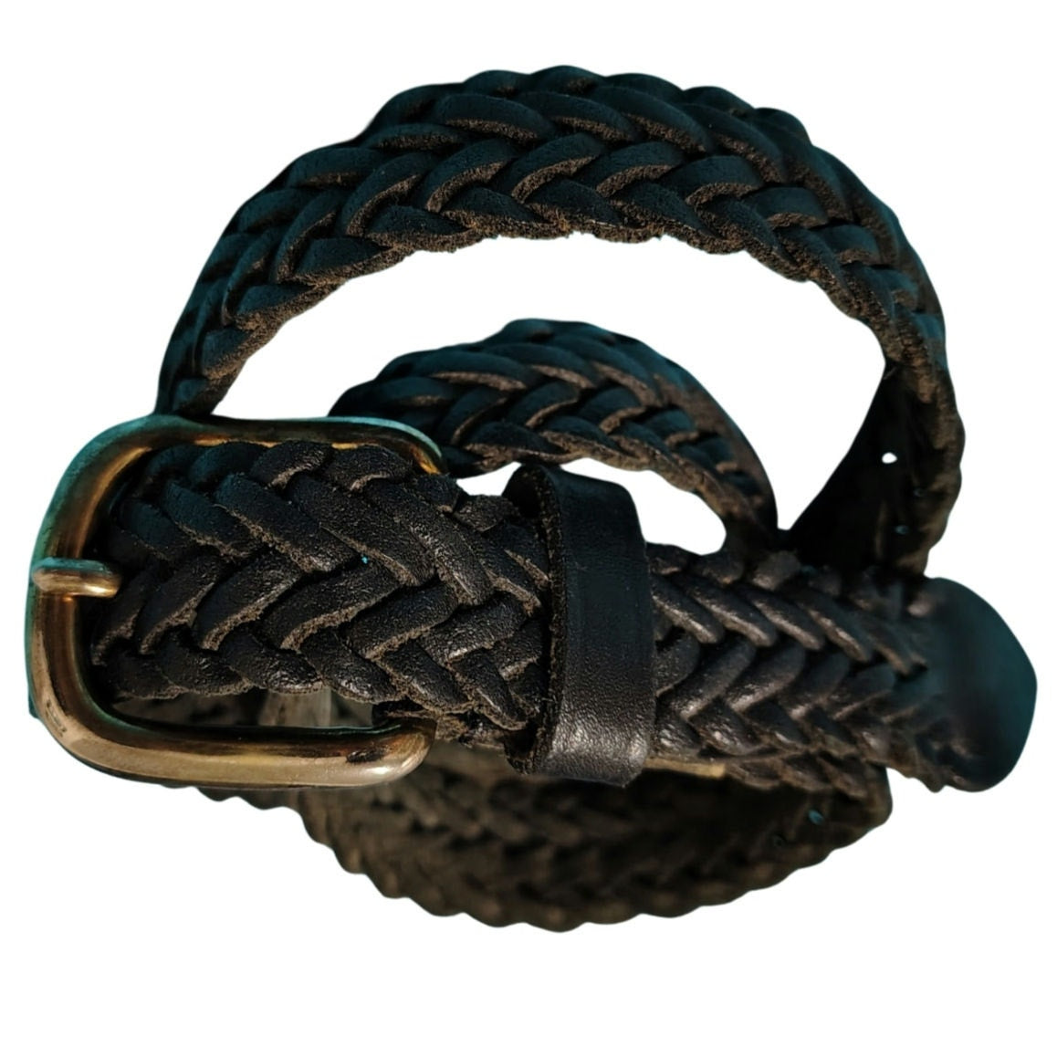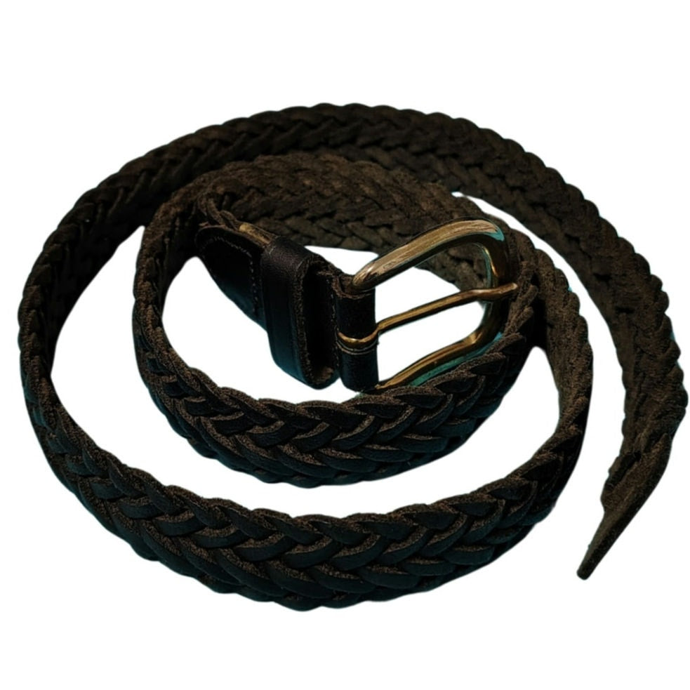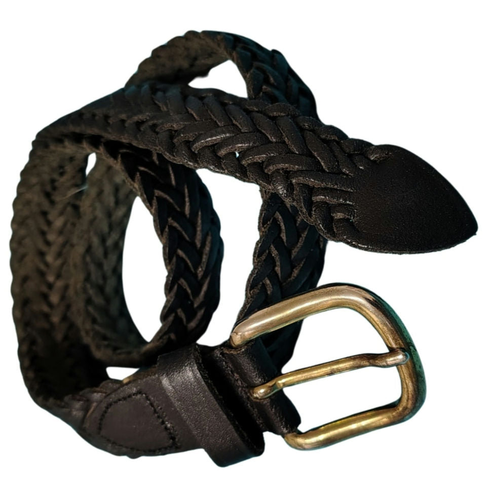 1980s Black Leather Braided Vintage Belt. Narrow 1 Inch width. Rounded metal pull through buckle.