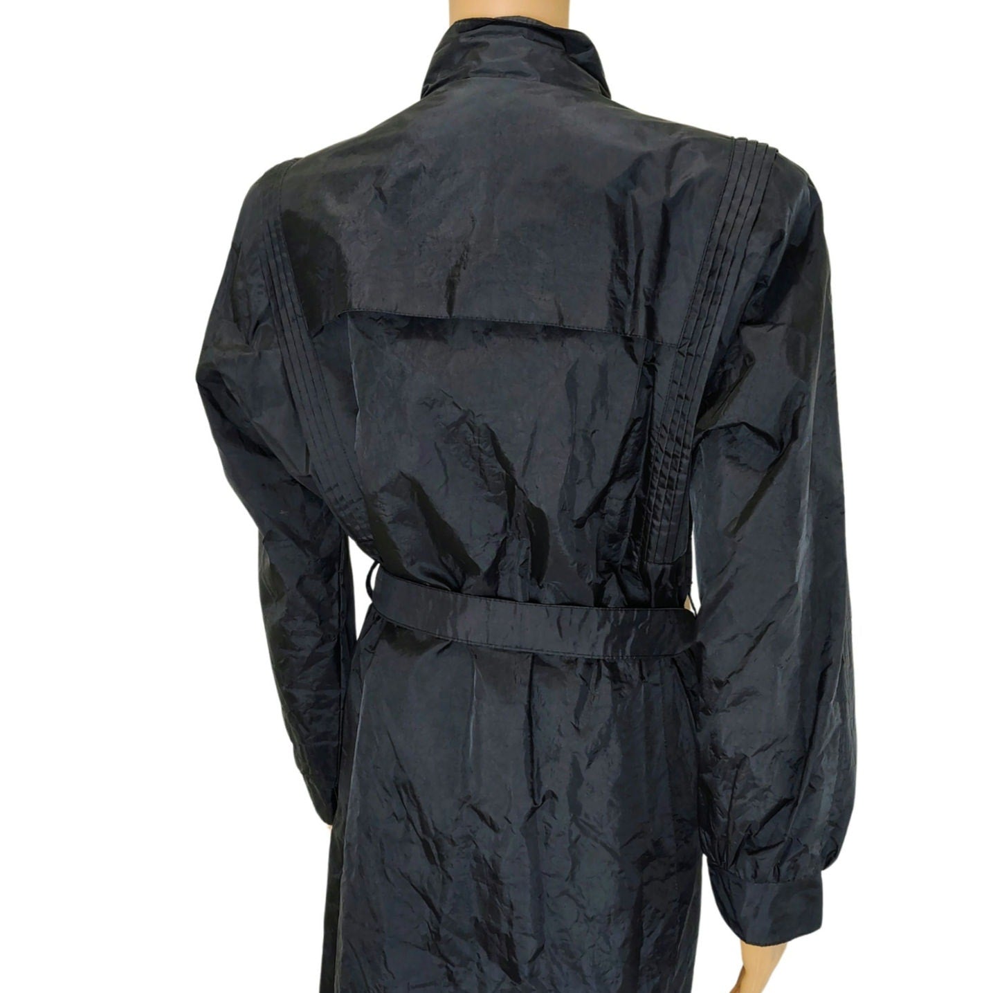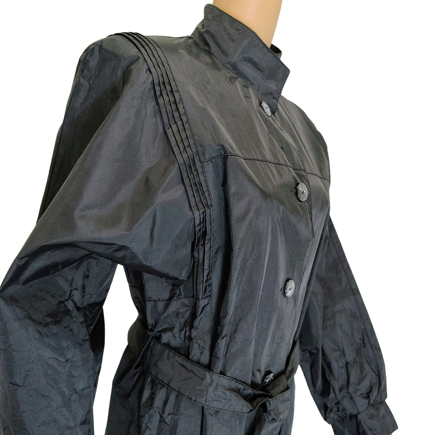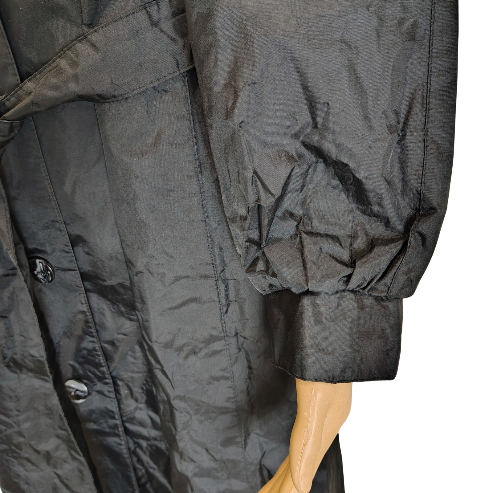1980s 1990s Black Long Rain Jacket Trench Coat Waterproof & Rubberized shell. Shoulder pads and dolman sleeves. Bottom up. Band or collarless 2 inch collar. Back shoulder protector. Fitted with pleated down front and back top parts of the jacket. Six marble designed buttons down down front. 2 inch wrist cuffs. Airholes under each armpit area. Lined. Belted with belt loops on sides.