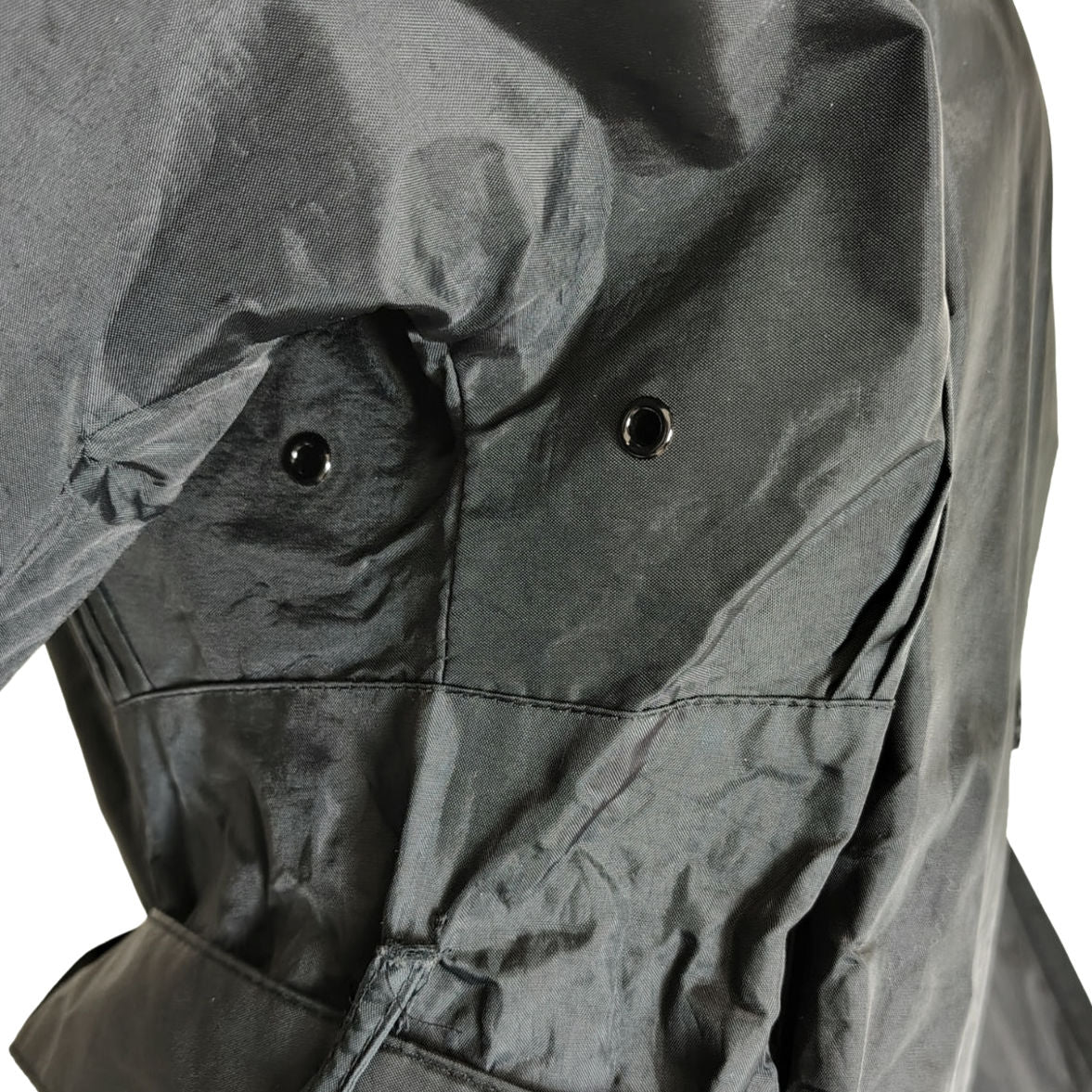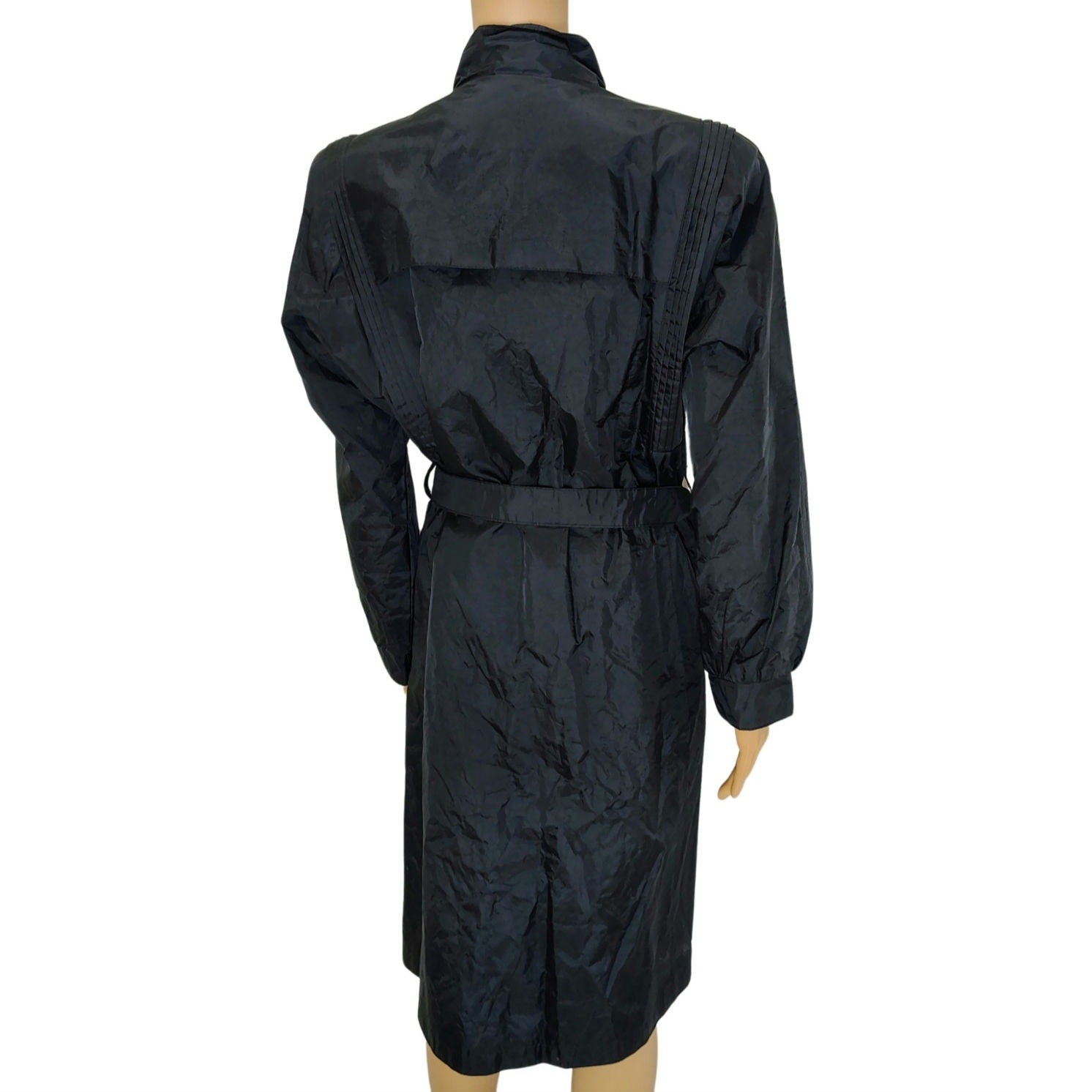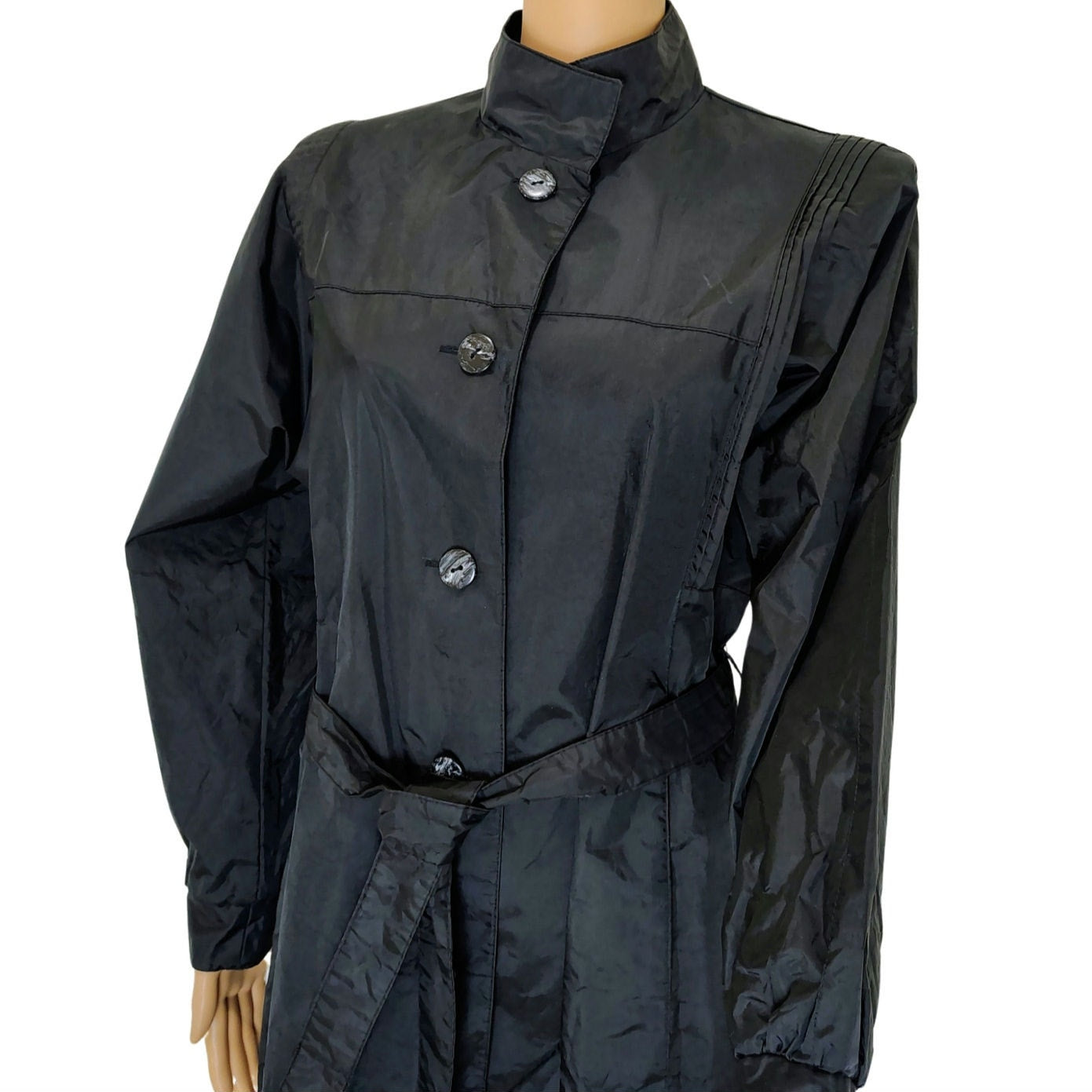 1980s 1990s Black Long Rain Jacket Trench Coat Waterproof & Rubberized shell. Shoulder pads and dolman sleeves. Bottom up. Band or collarless 2 inch collar. Back shoulder protector. Fitted with pleated down front and back top parts of the jacket. Six marble designed buttons down down front. 2 inch wrist cuffs. Airholes under each armpit area. Lined. Belted with belt loops on sides.