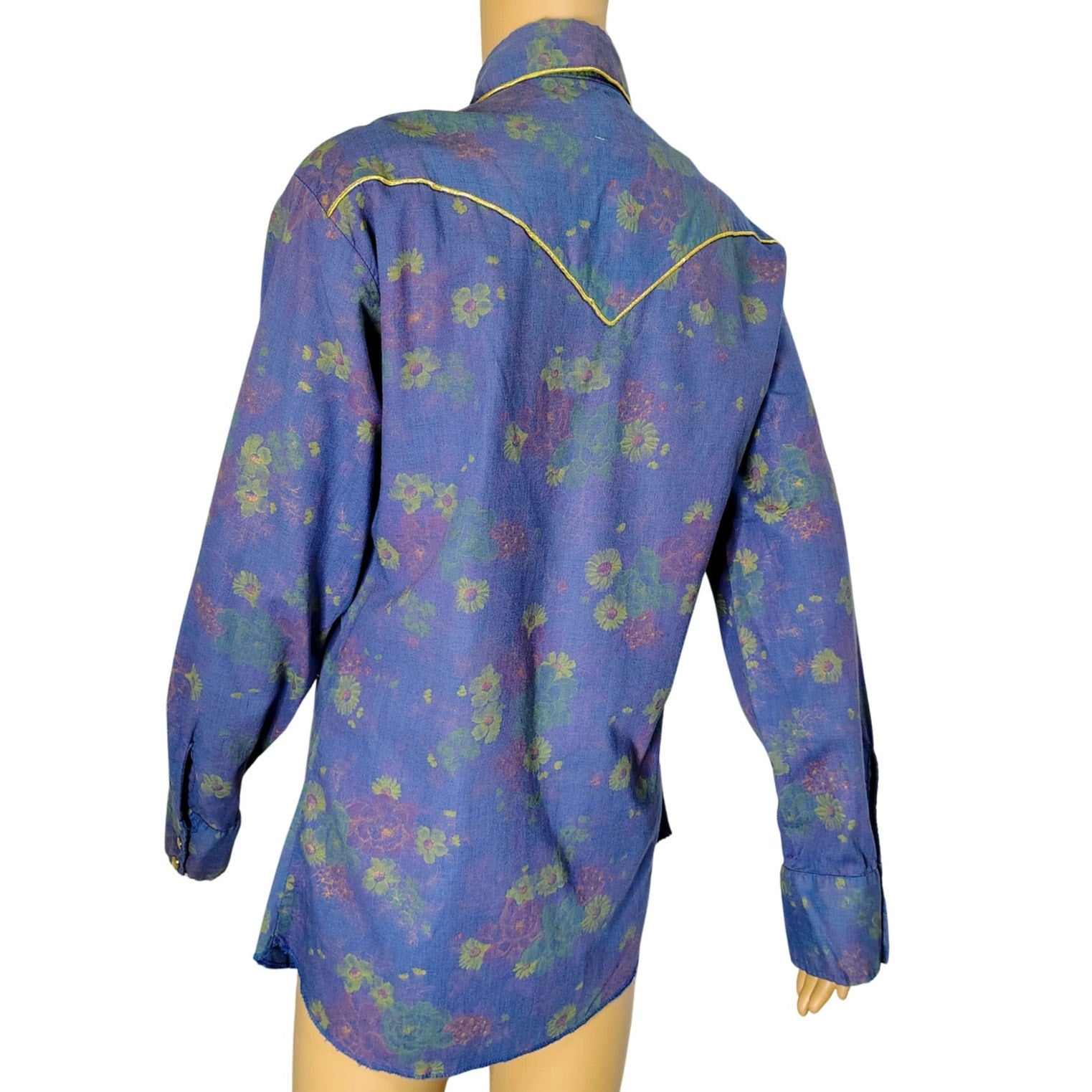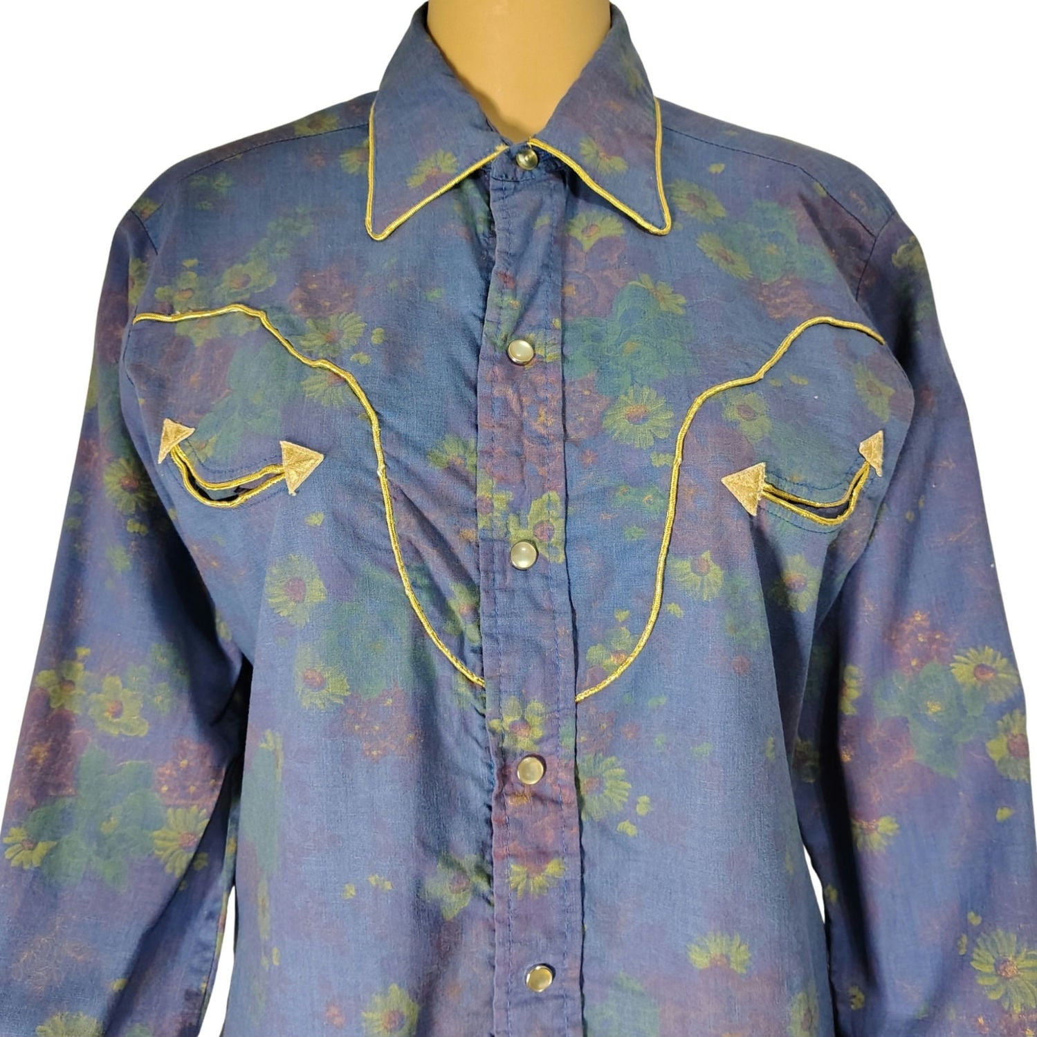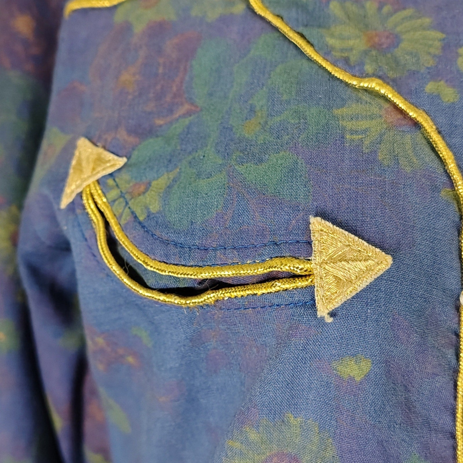 1980s Carson H Bar C Fitted Cowboy Shirt Purple Gold Floral Western Button Up Fold Down Collar. Long sleeves with cuffed buttoned wrists. Gold metallic piping throughout. Double arrow piping design over rounded pockets which are located over each side of the chest. Metallic trimmed yoke. Six pearl snap buttons with one plastic button run down the front. Three pearl snap buttons on each wrist cuff.