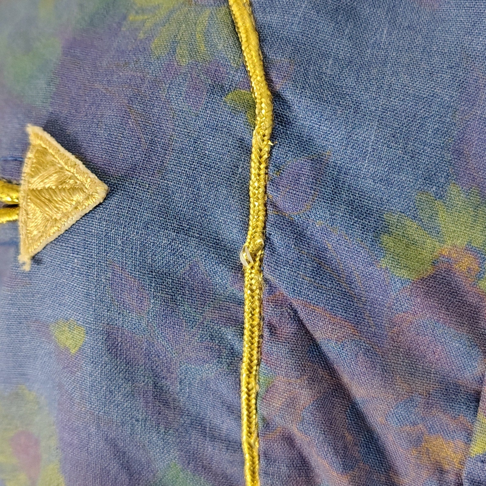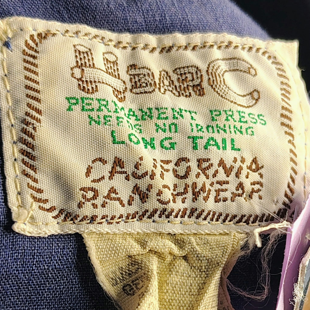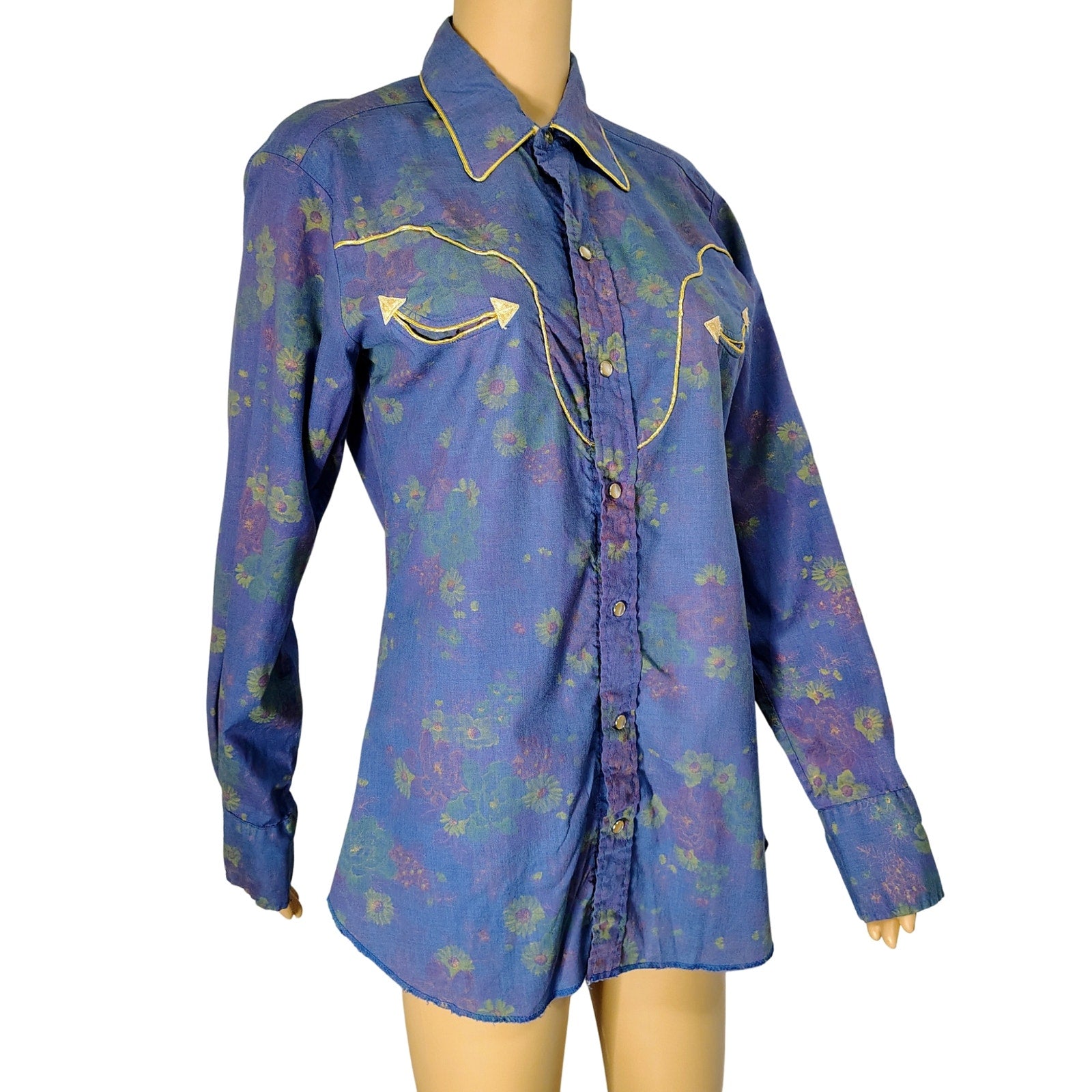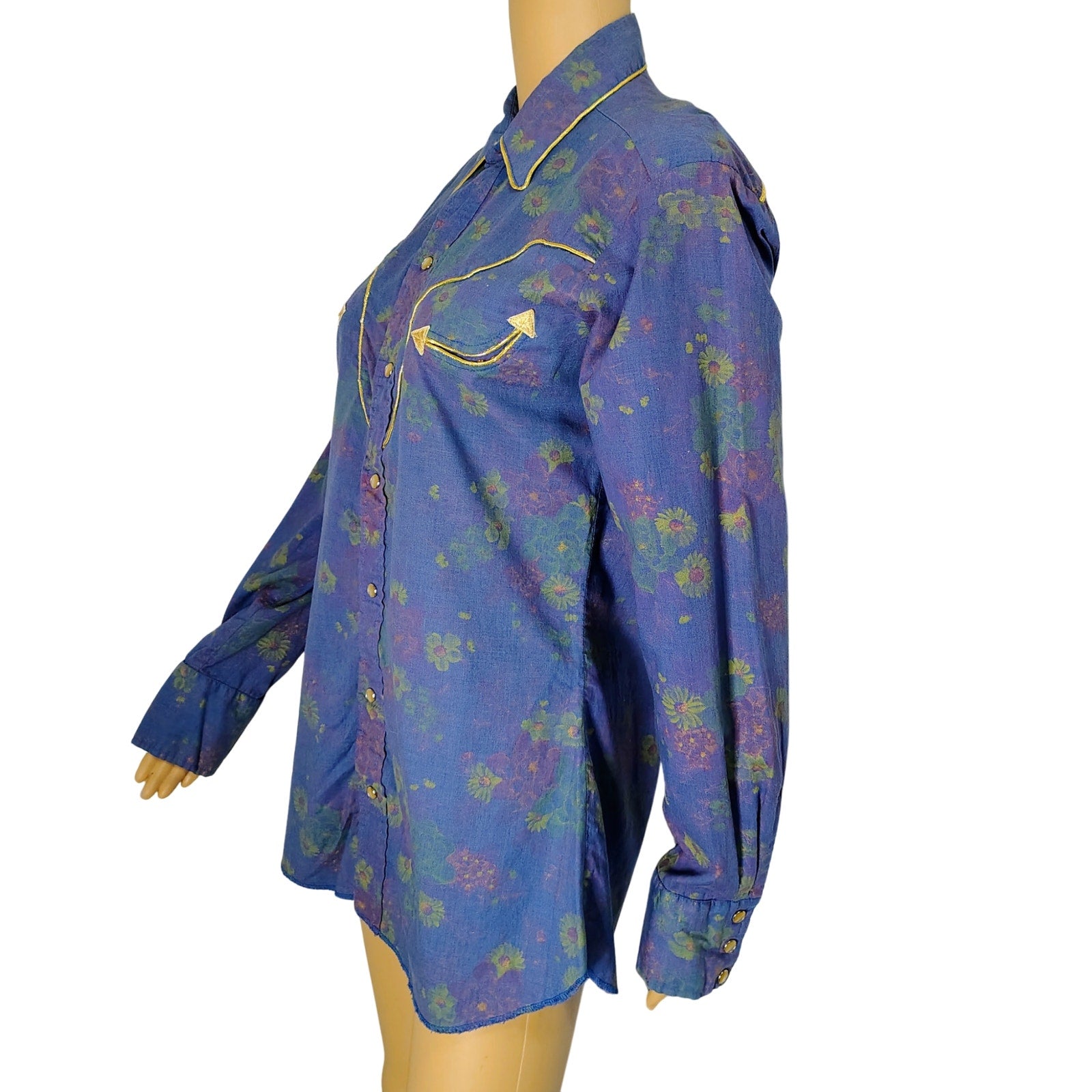1980s Carson H Bar C Fitted Cowboy Shirt Purple Gold Floral Western Button Up Fold Down Collar. Long sleeves with cuffed buttoned wrists. Gold metallic piping throughout. Double arrow piping design over rounded pockets which are located over each side of the chest. Metallic trimmed yoke. Six pearl snap buttons with one plastic button run down the front. Three pearl snap buttons on each wrist cuff.