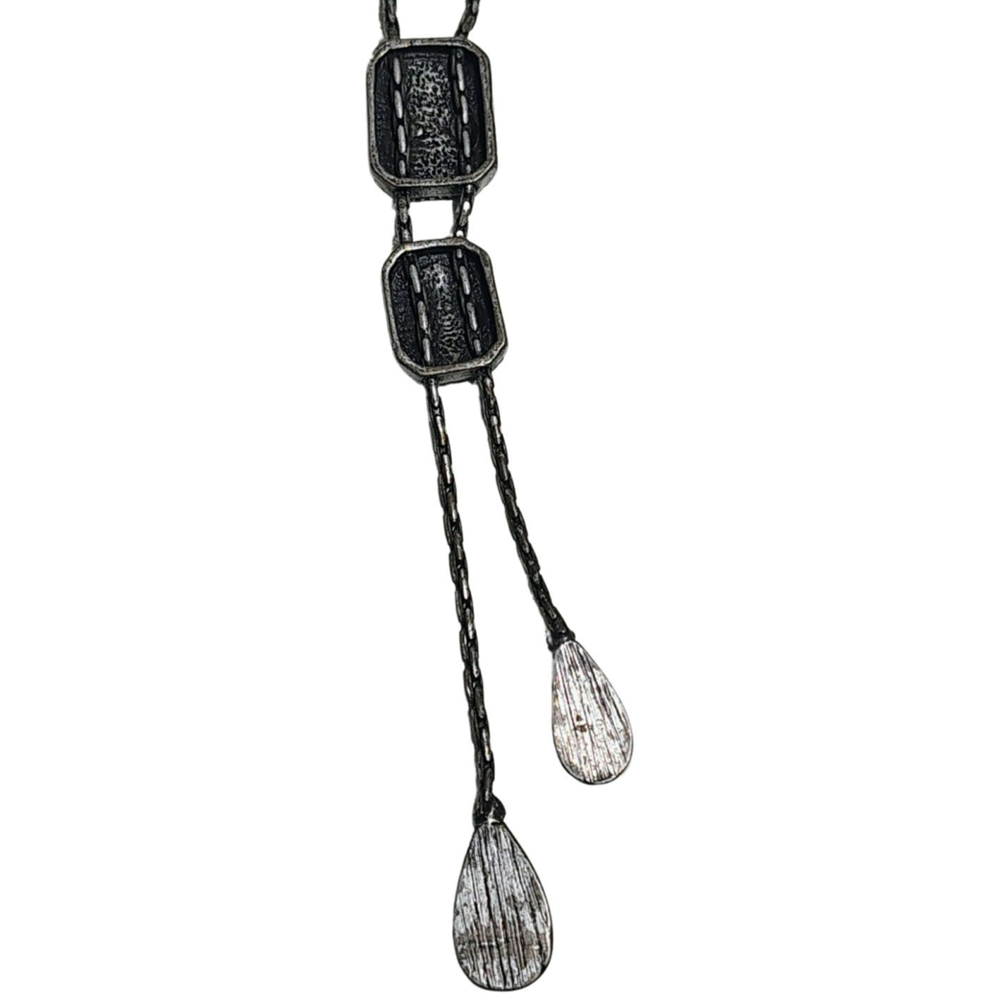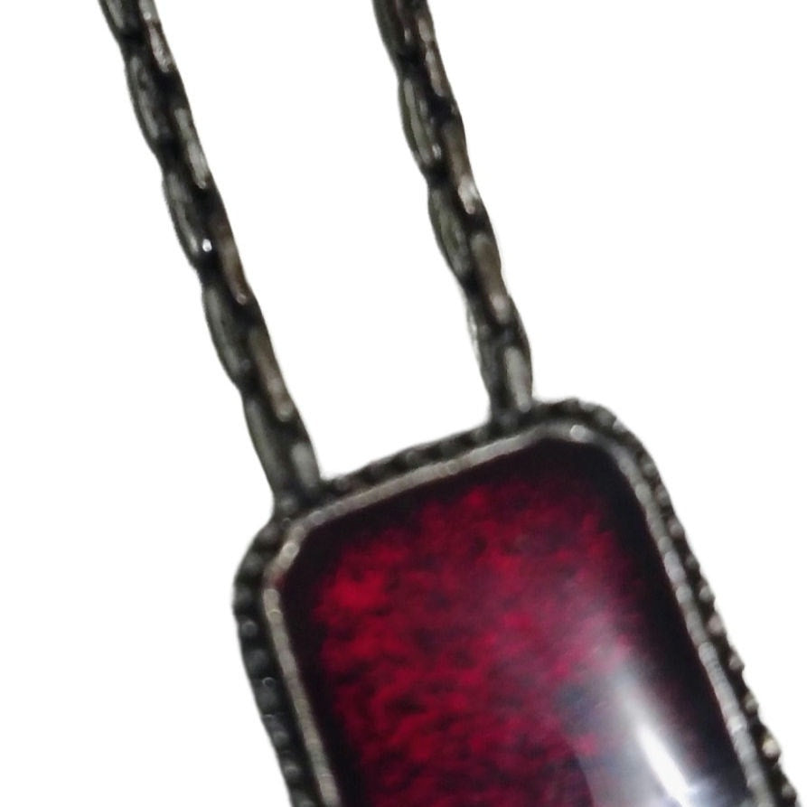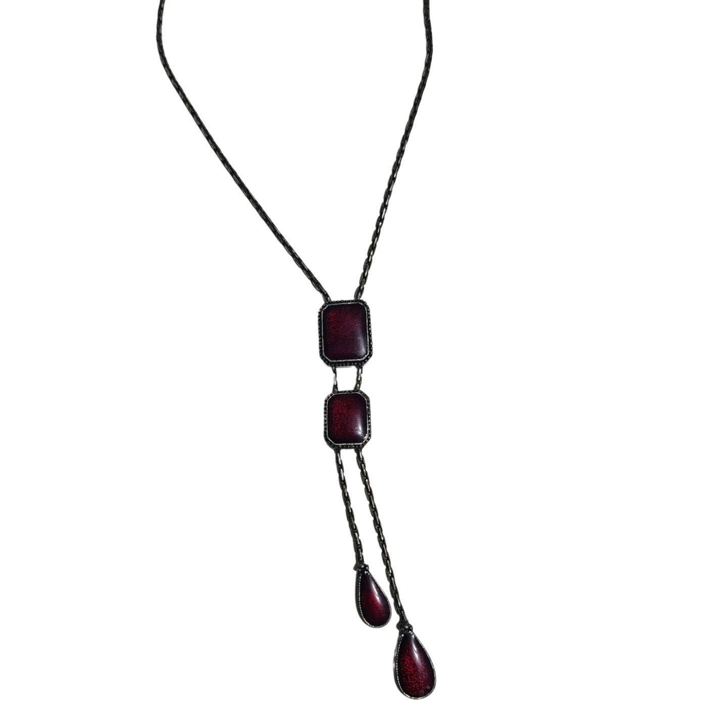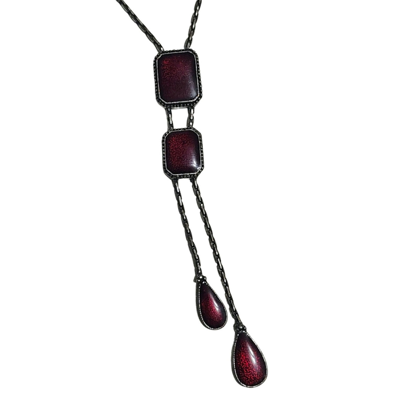 1980s Red Enamel Square Y Style Tear Drop Dangling Statement Silver Necklace