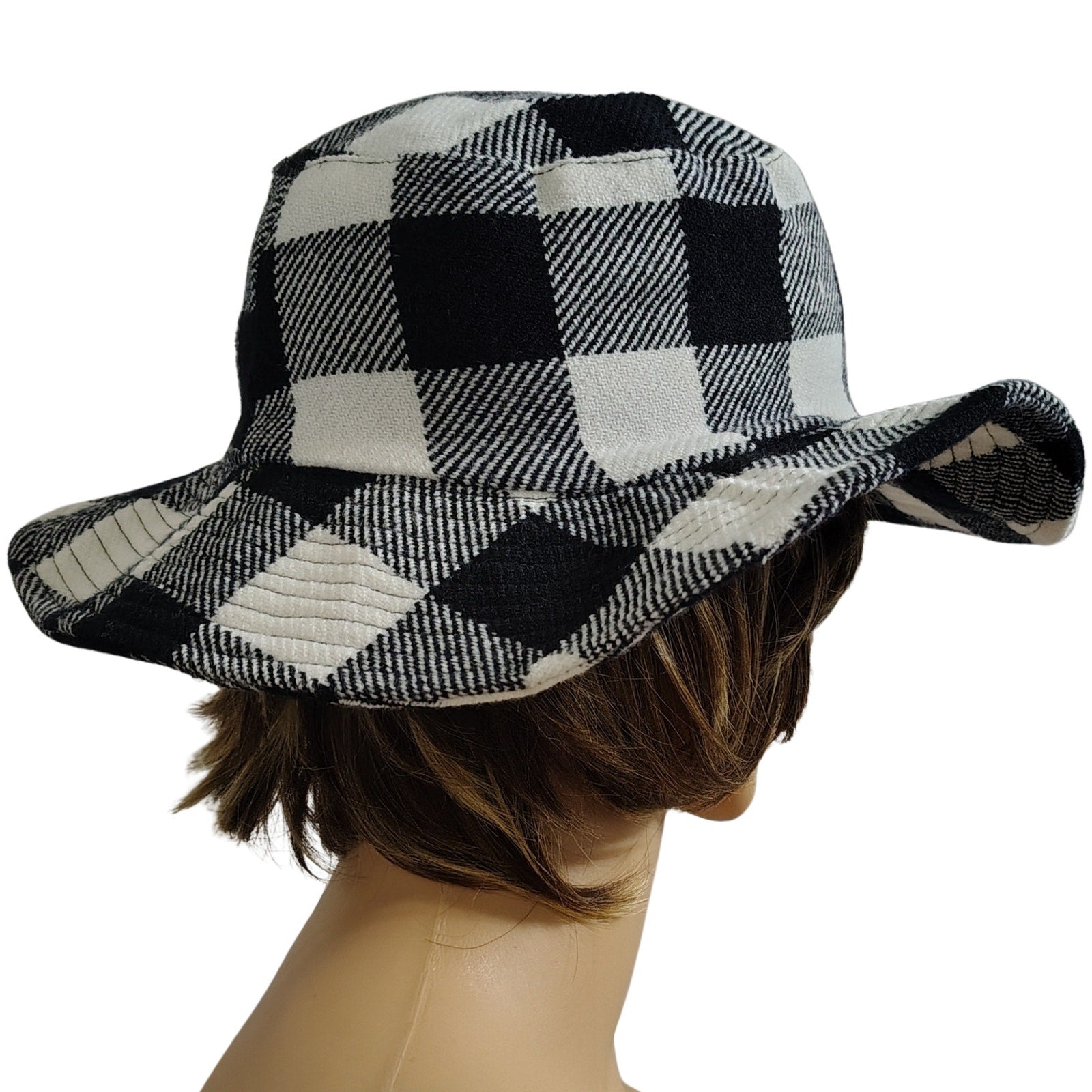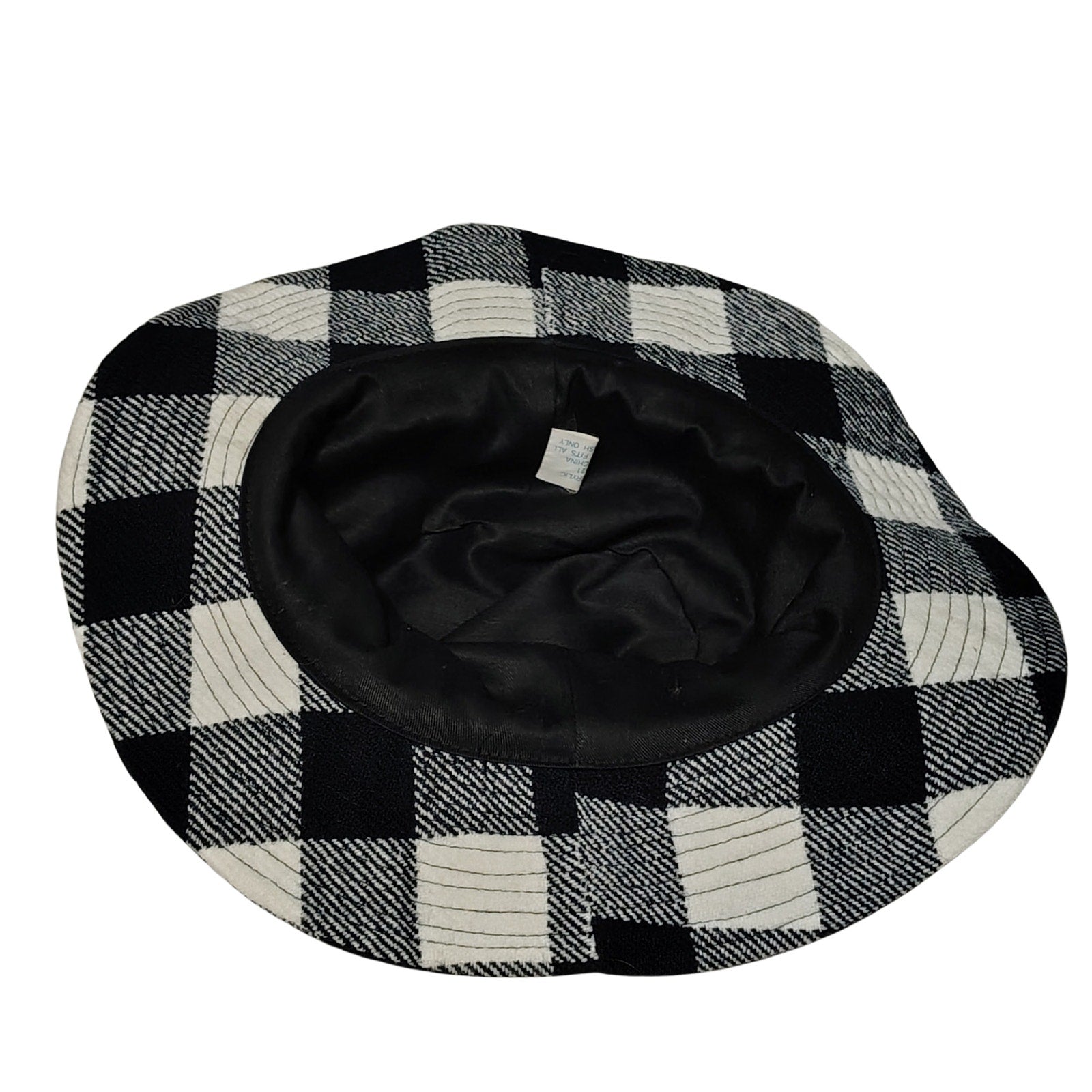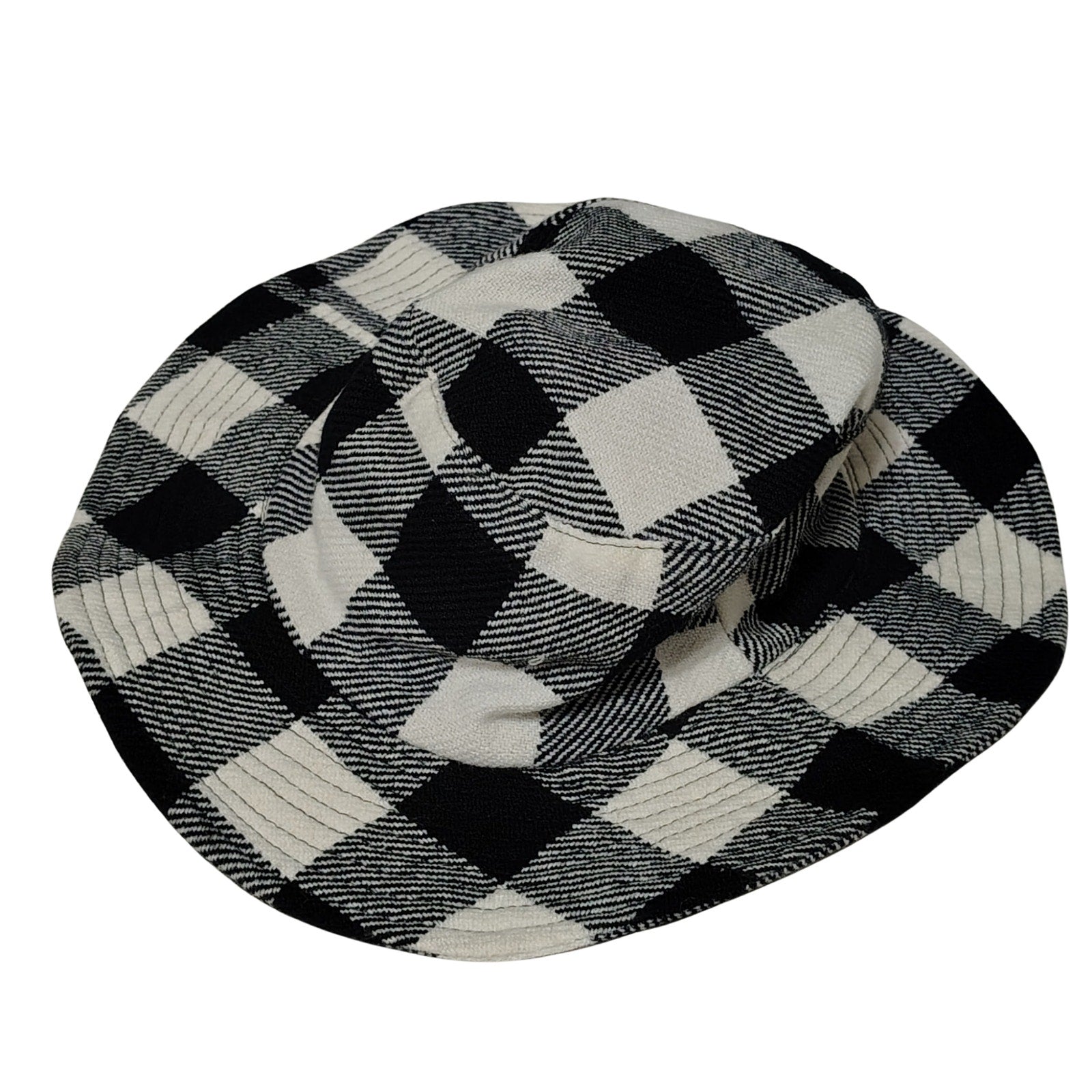 1980s Vintage Black White Plaid Floppy Bucket Hat Wide Brim. Soft feels. Seam designs around the brim. Lined with black fabric.