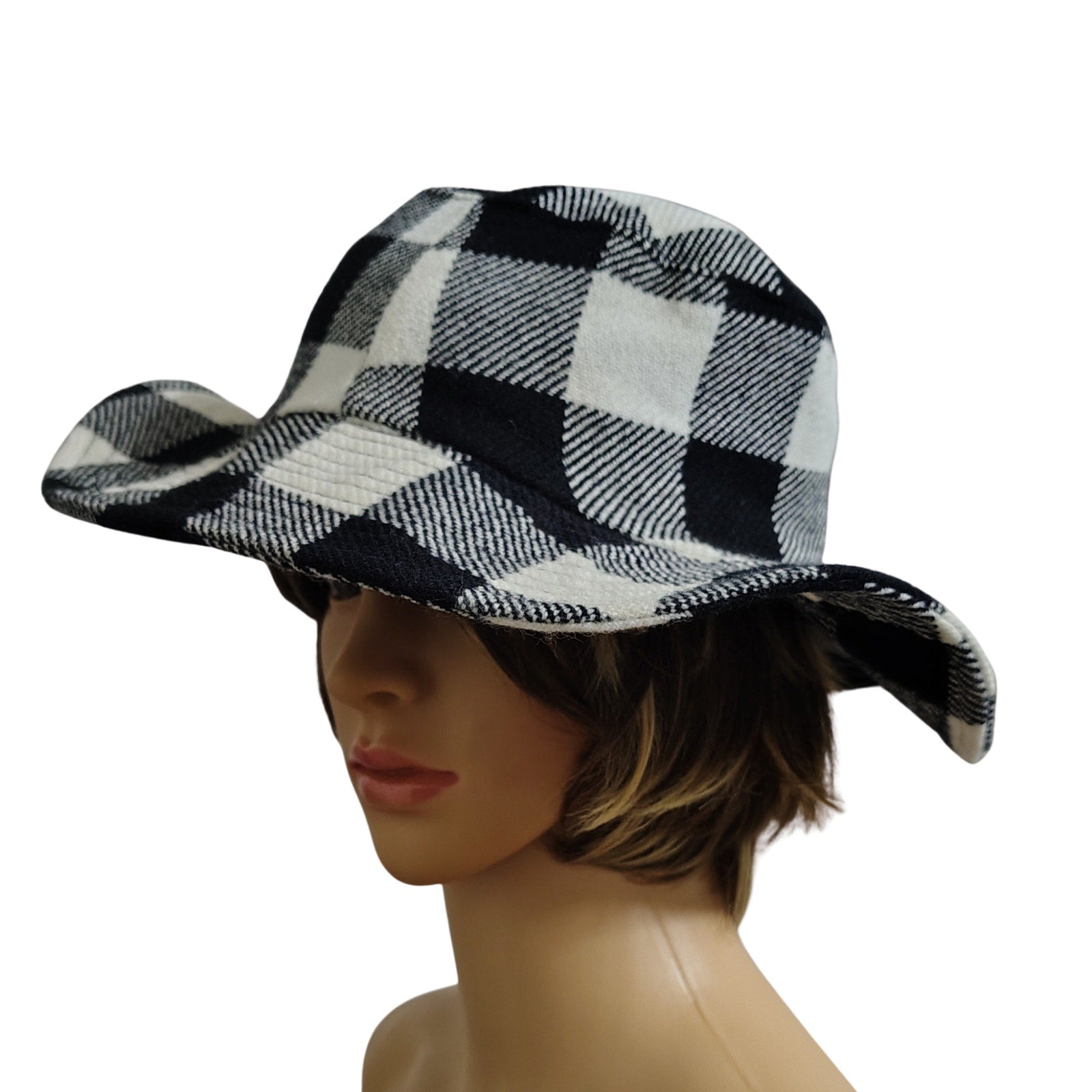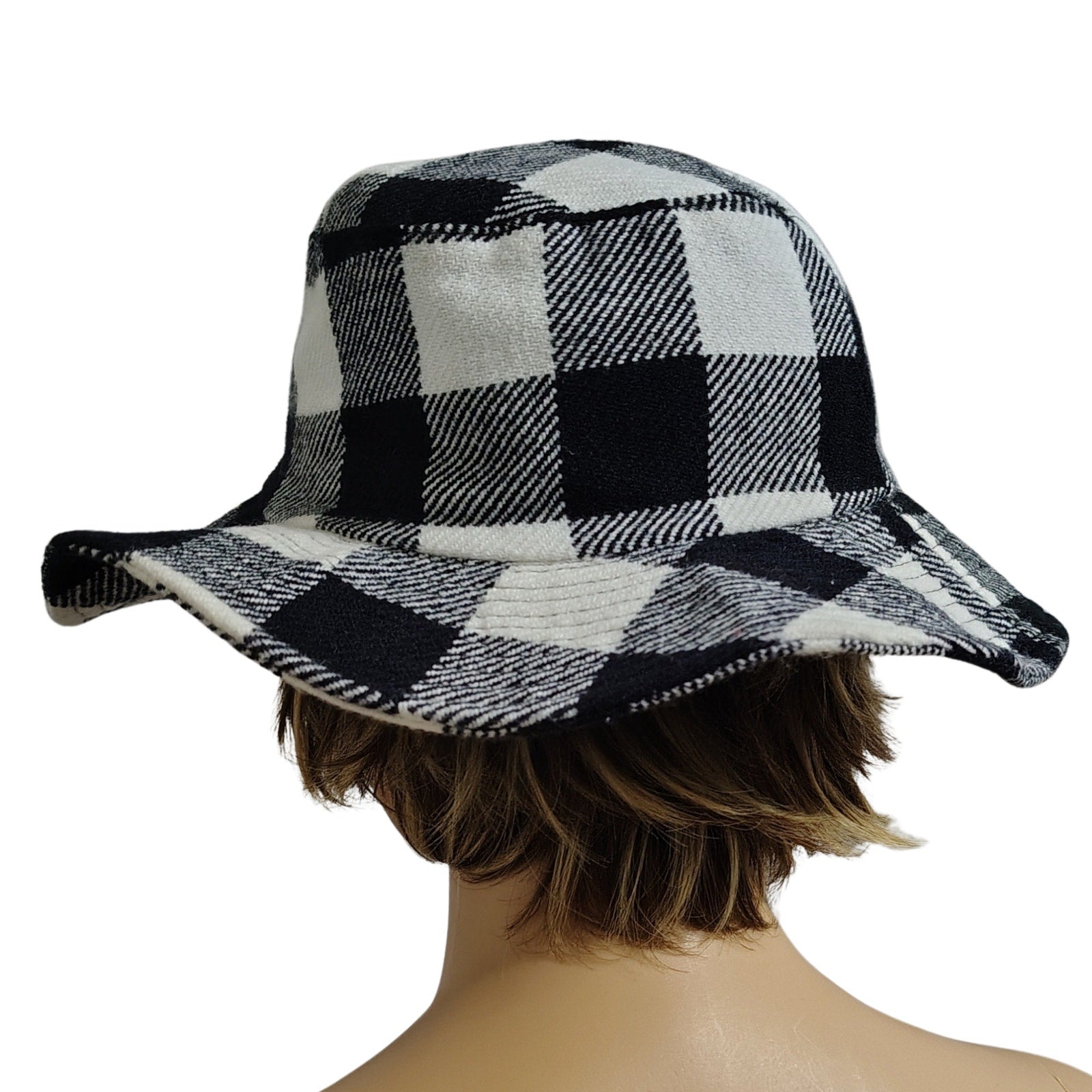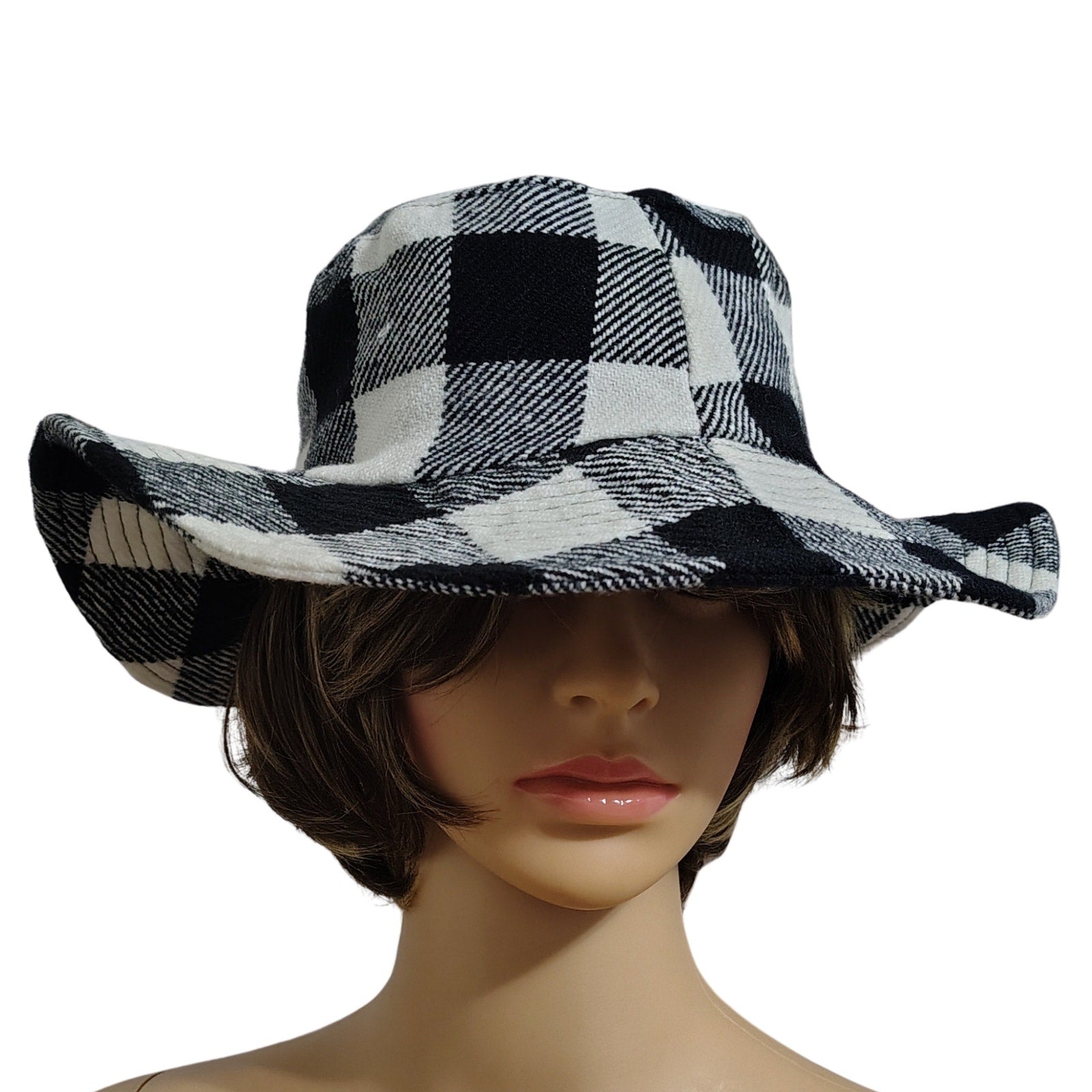 1980s Vintage Black White Plaid Floppy Bucket Hat Wide Brim. Soft feels. Seam designs around the brim. Lined with black fabric.