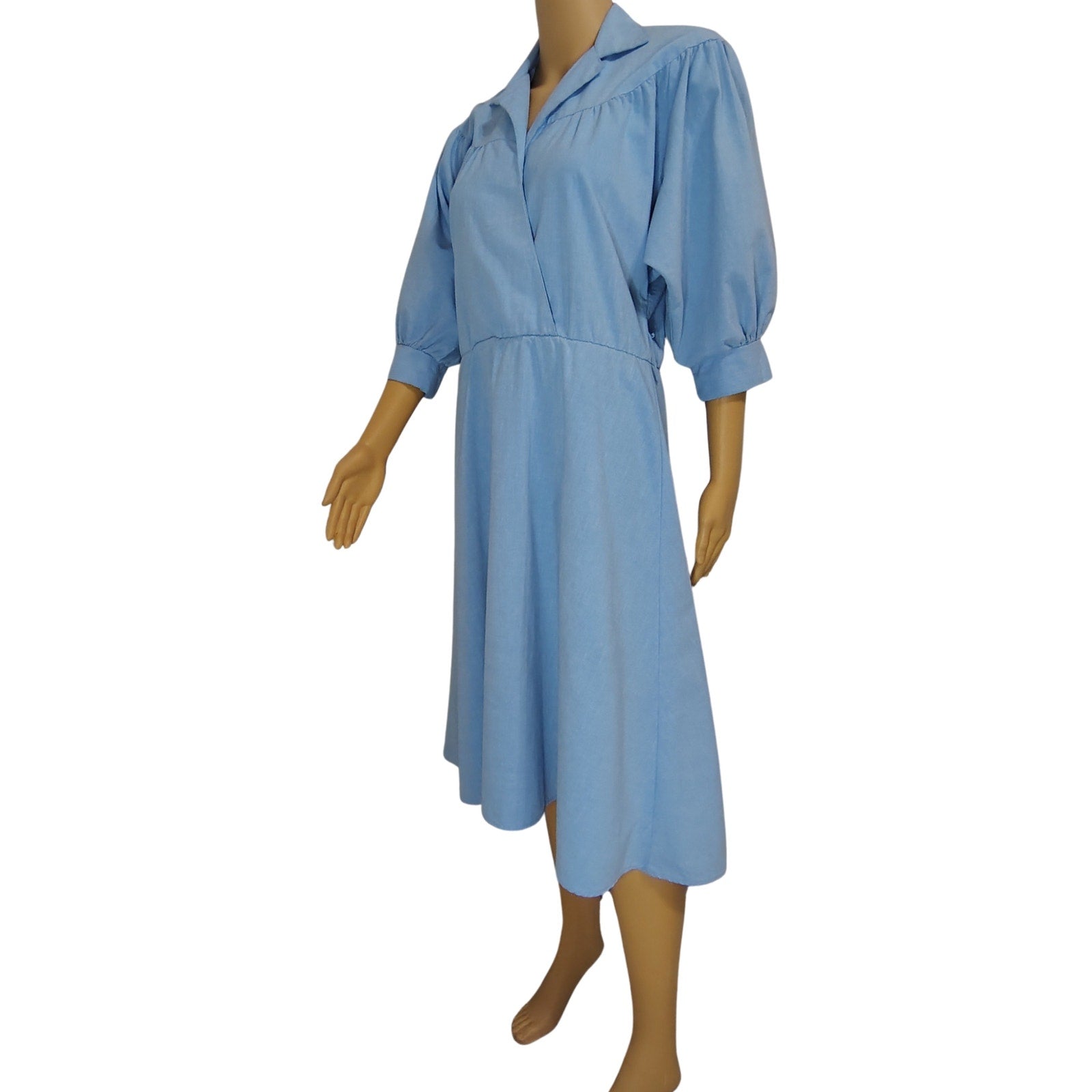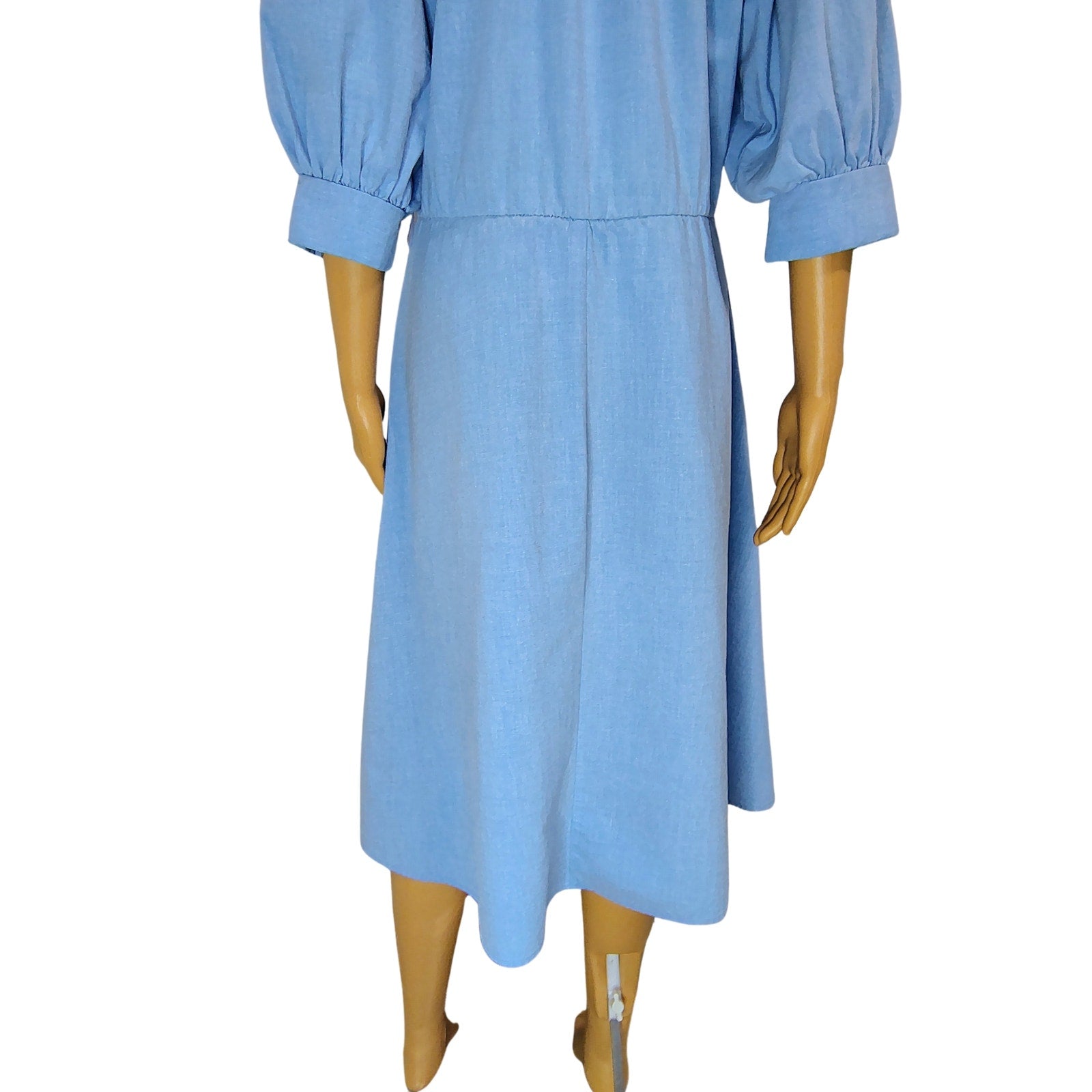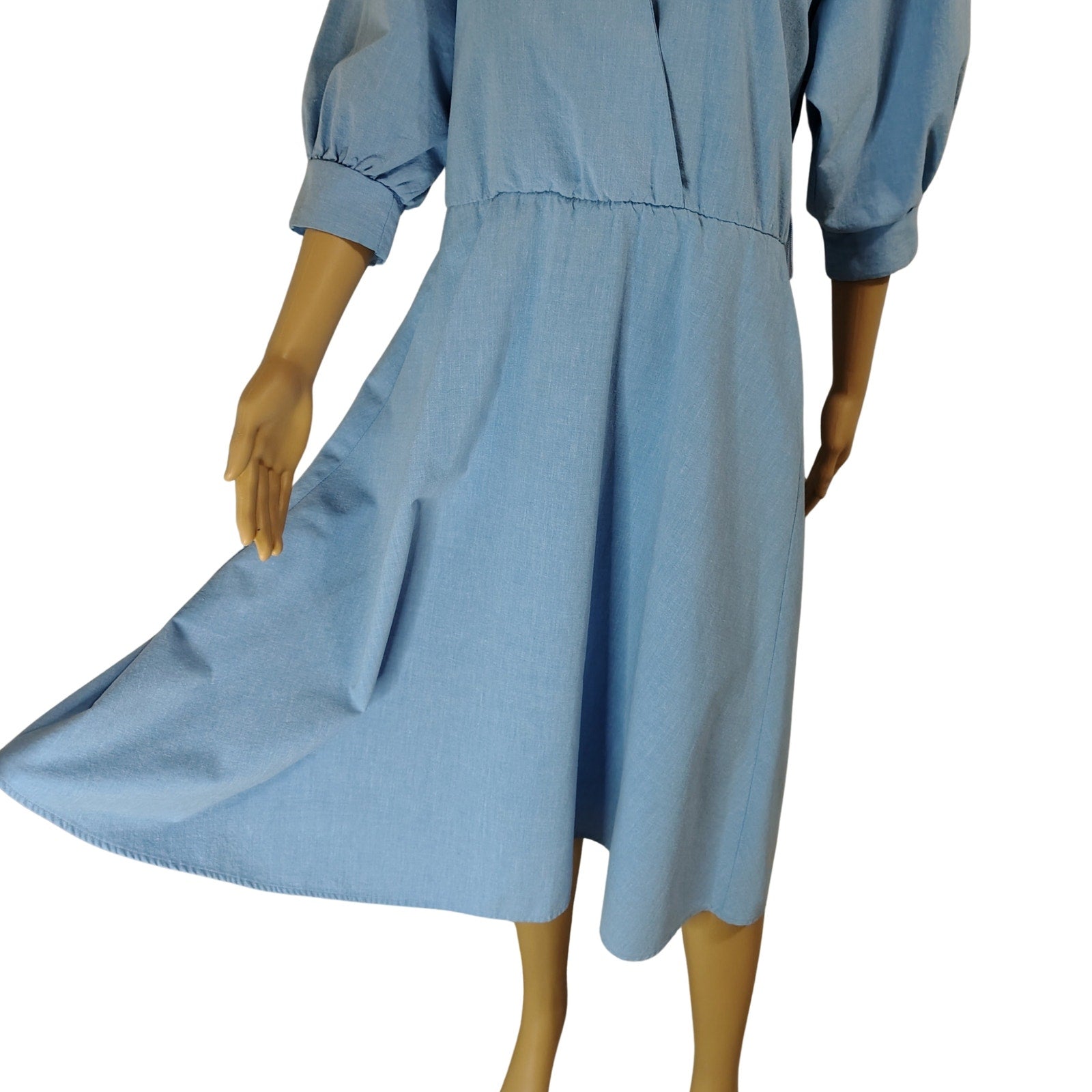 1990s Blondie Me Blue Jean Puffy Sleeve Fit Flare Midi Dress. Y2K Vintage. Fold down collar. Gathered at the yoke. Cuffed 3/4 dolman sleeves. Cross over chest. One thread belt loop on left side of hip. Gathered waist. A line skirt.