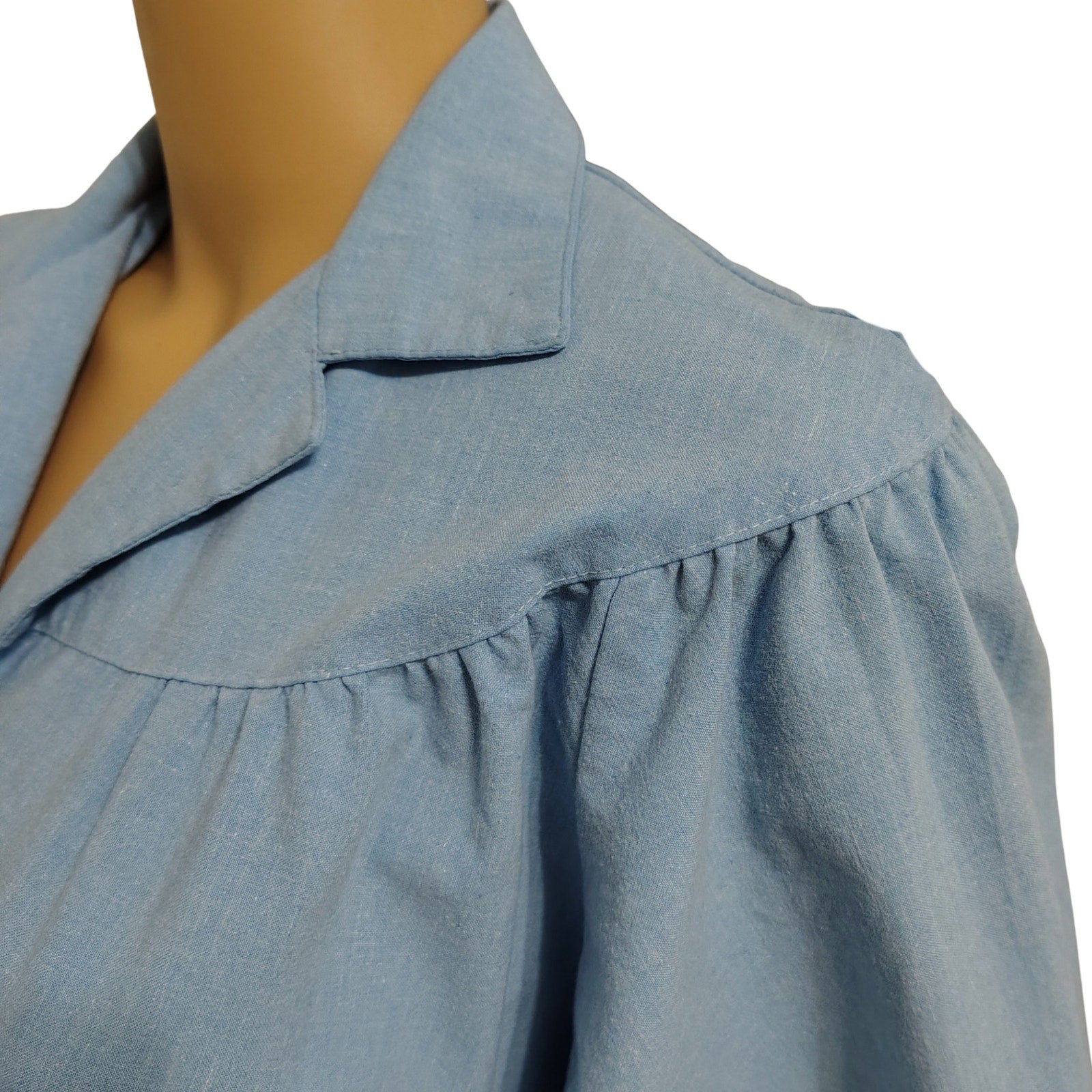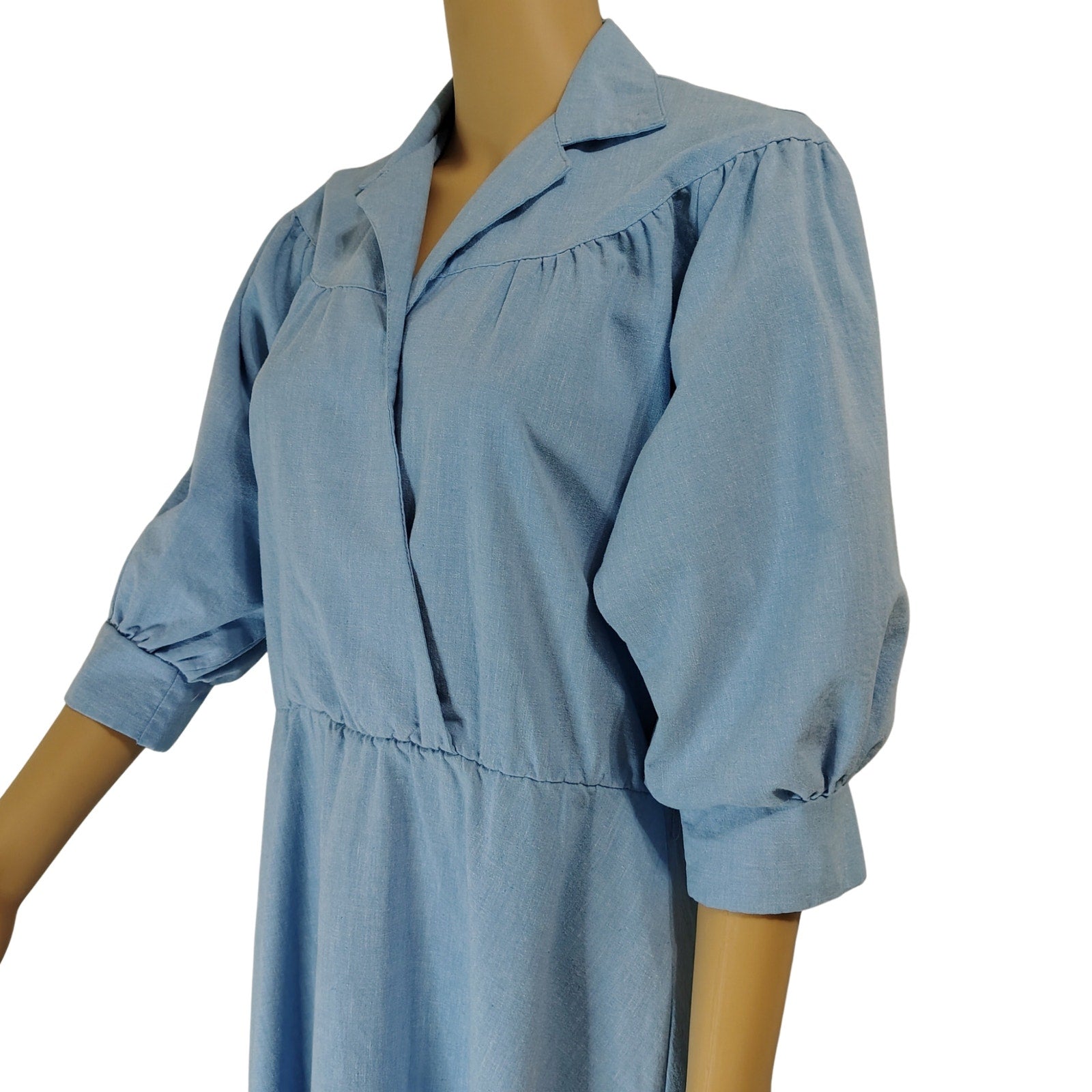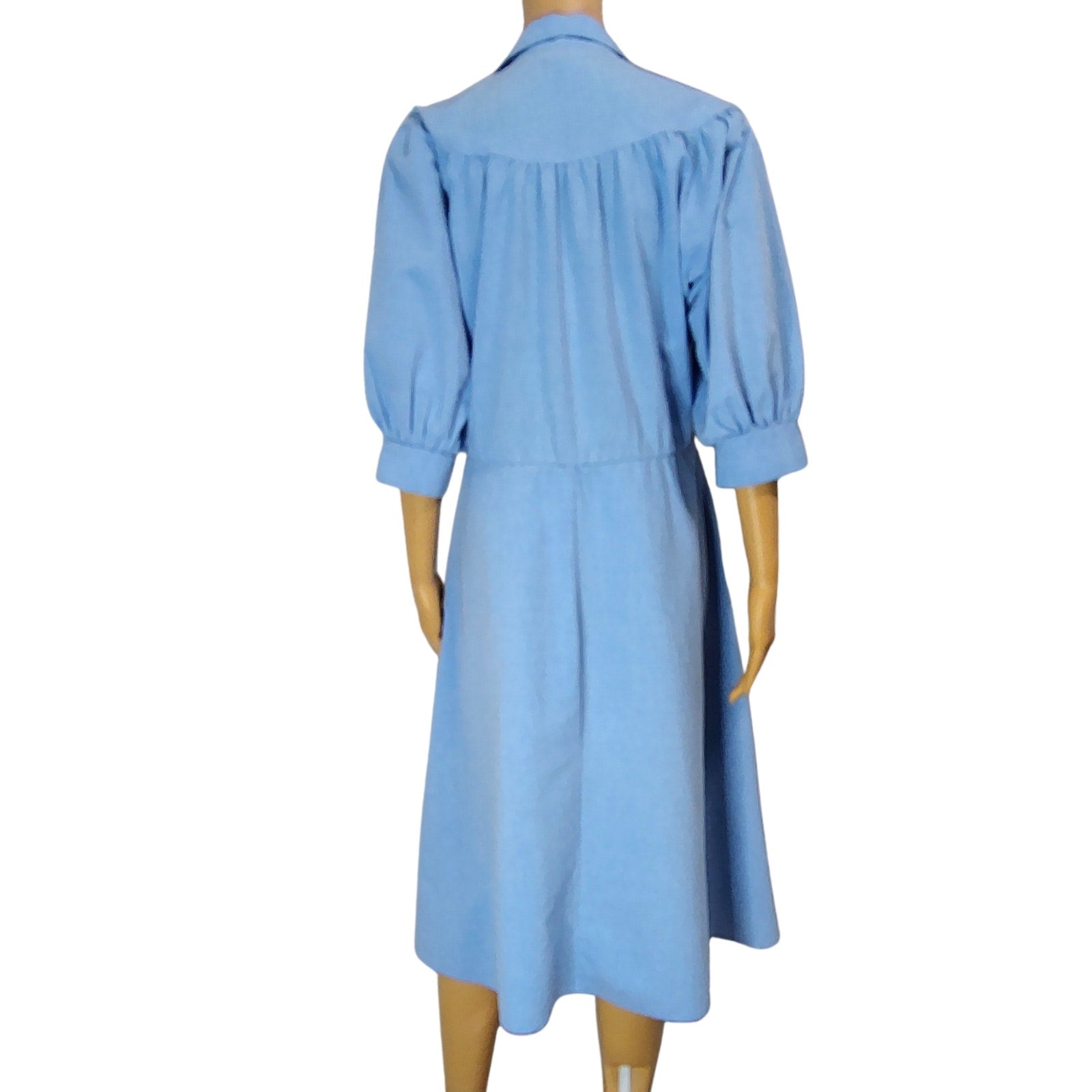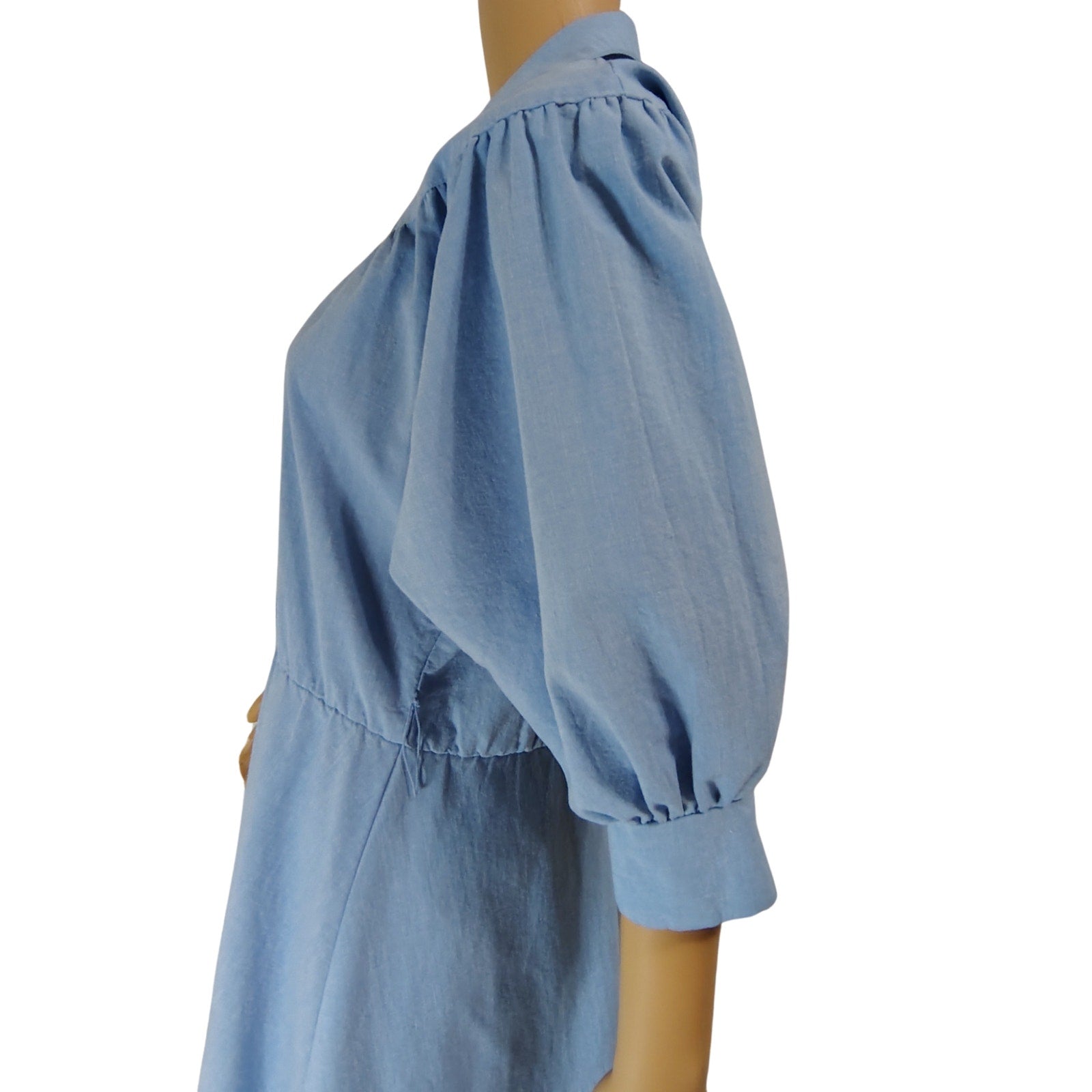 1990s Blondie Me Blue Jean Puffy Sleeve Fit Flare Midi Dress. Y2K Vintage. Fold down collar. Gathered at the yoke. Cuffed 3/4 dolman sleeves. Cross over chest. One thread belt loop on left side of hip. Gathered waist. A line skirt.