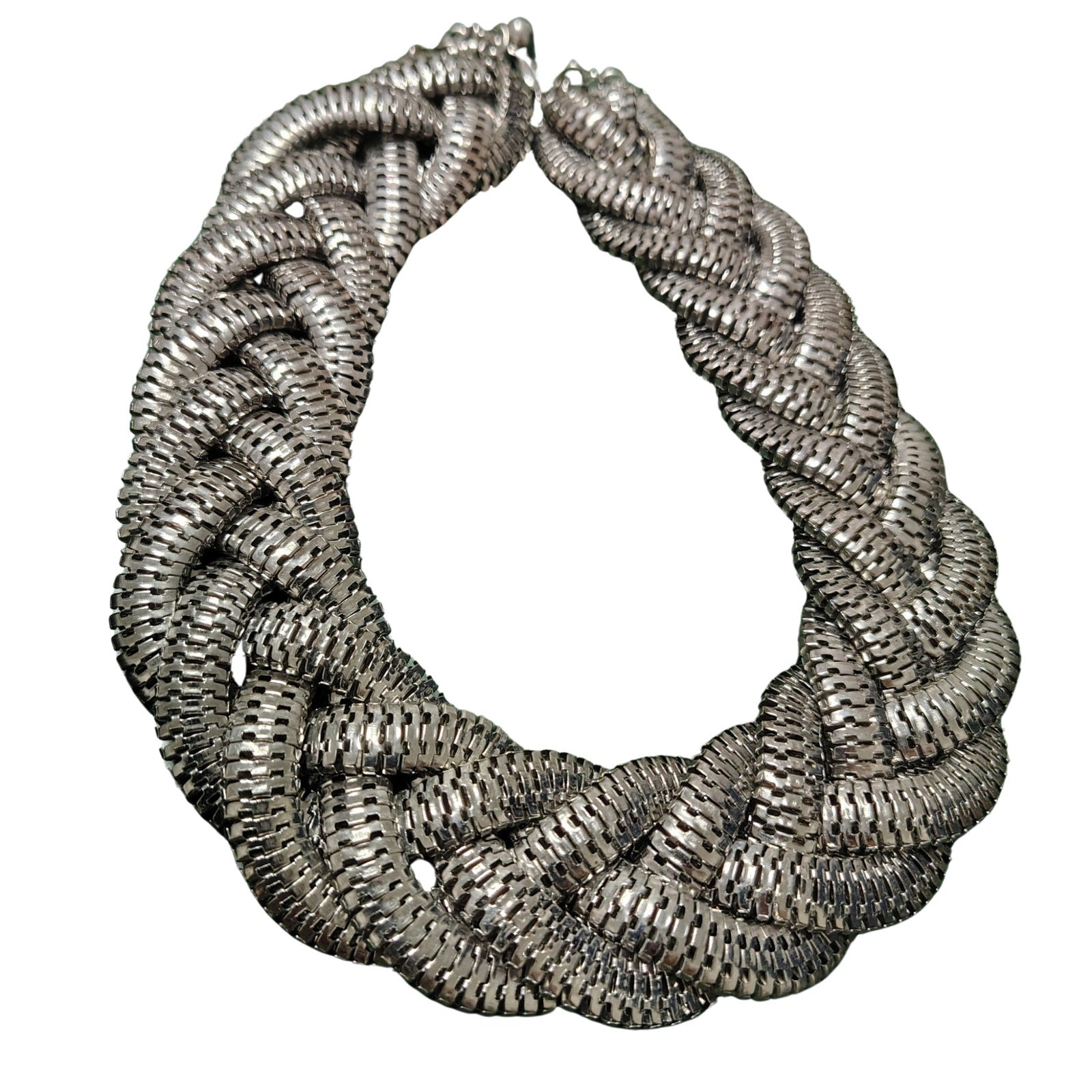90s Chunky Silver Braided Statement Choker Necklace Adjustable Size. The metal serpentine designed cording is woven into a thick braid.