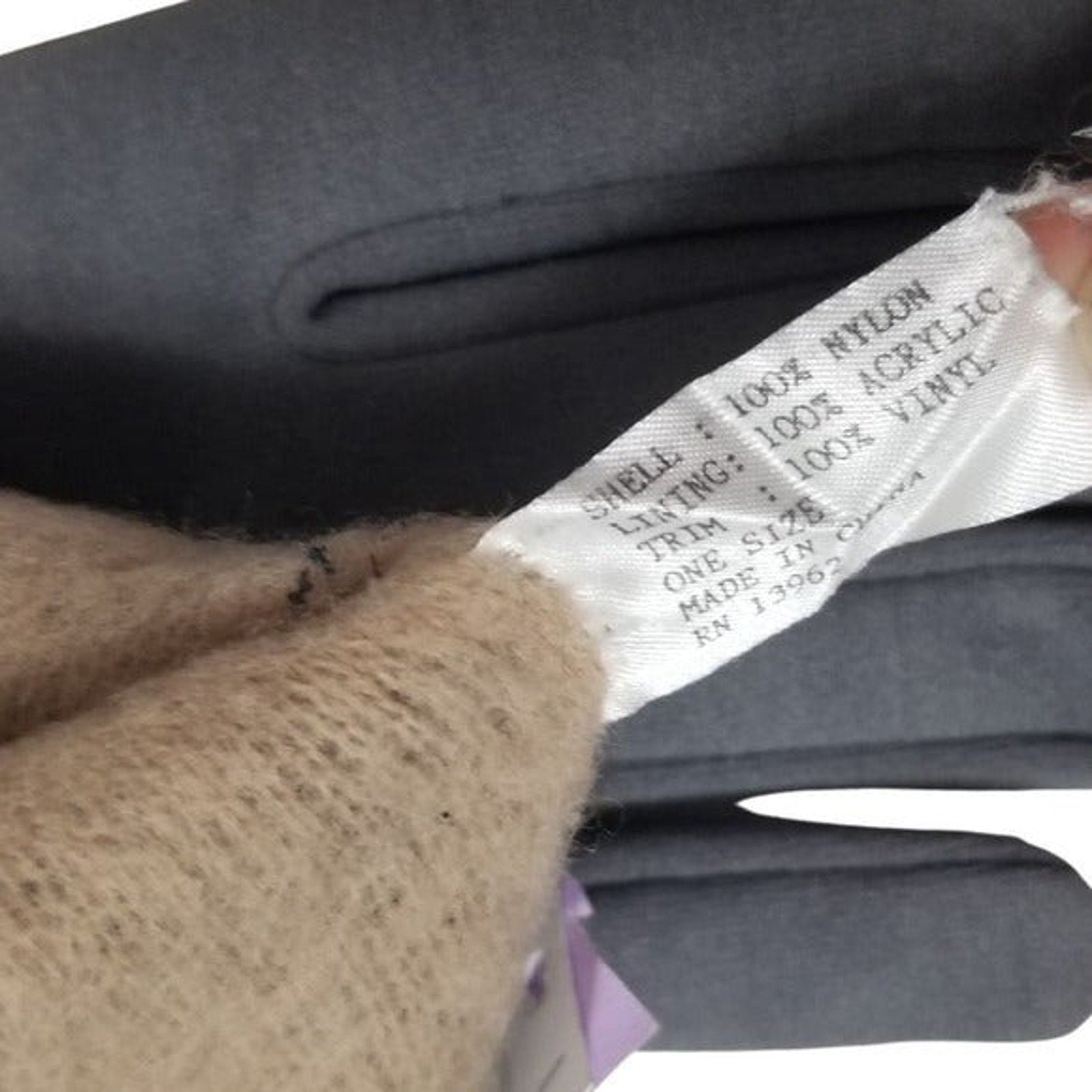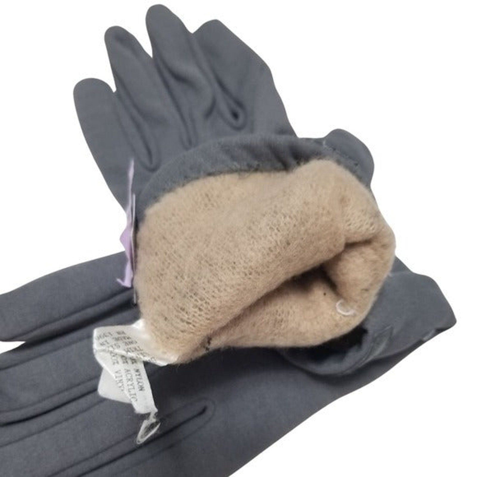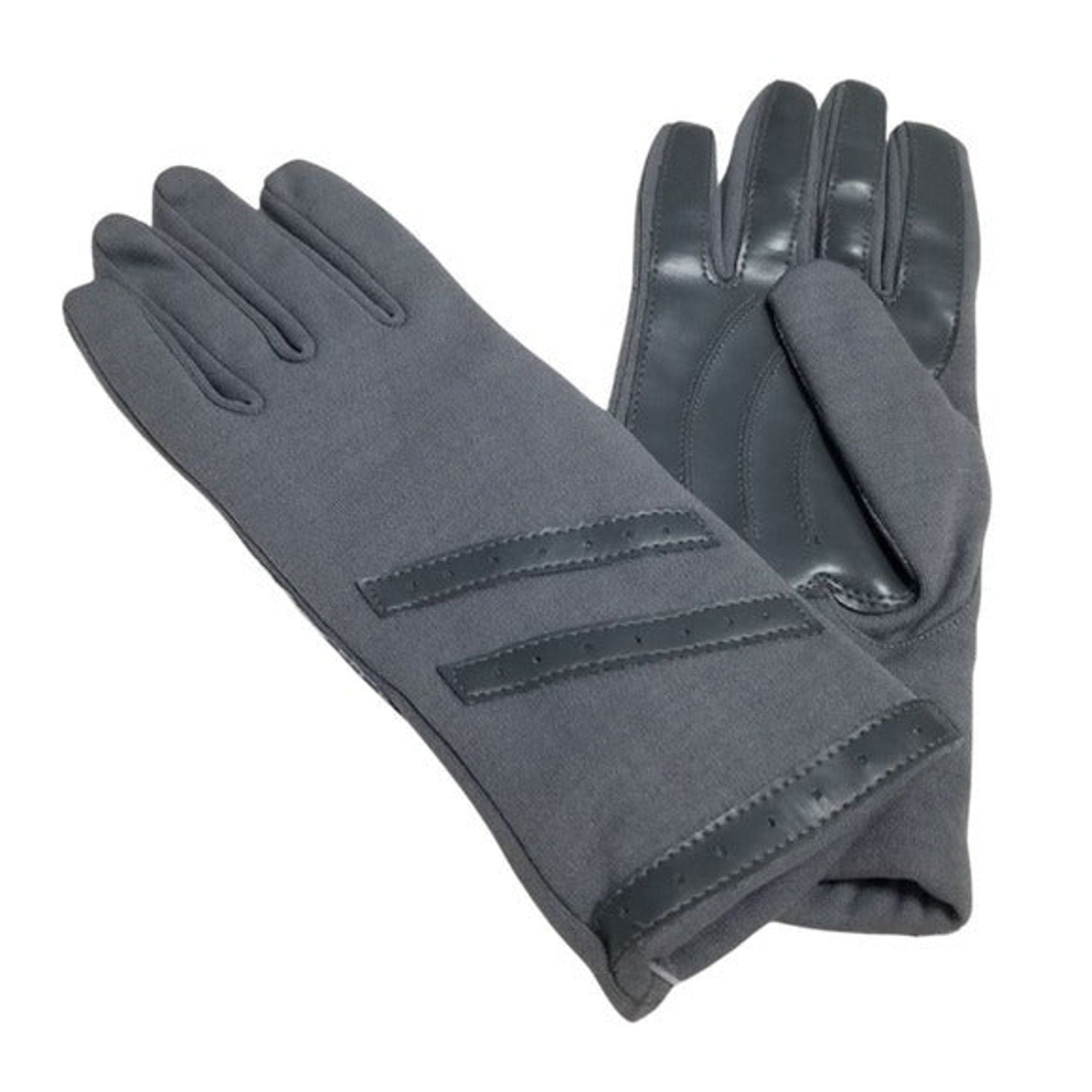 Vintage gray stretchable riding gloves. Faux leather riding stripes on top of the wrist and around cuffs. Non-slip grip faux leather pad on the palm of each hand and each finger. Lined with soft furry Acrylic.