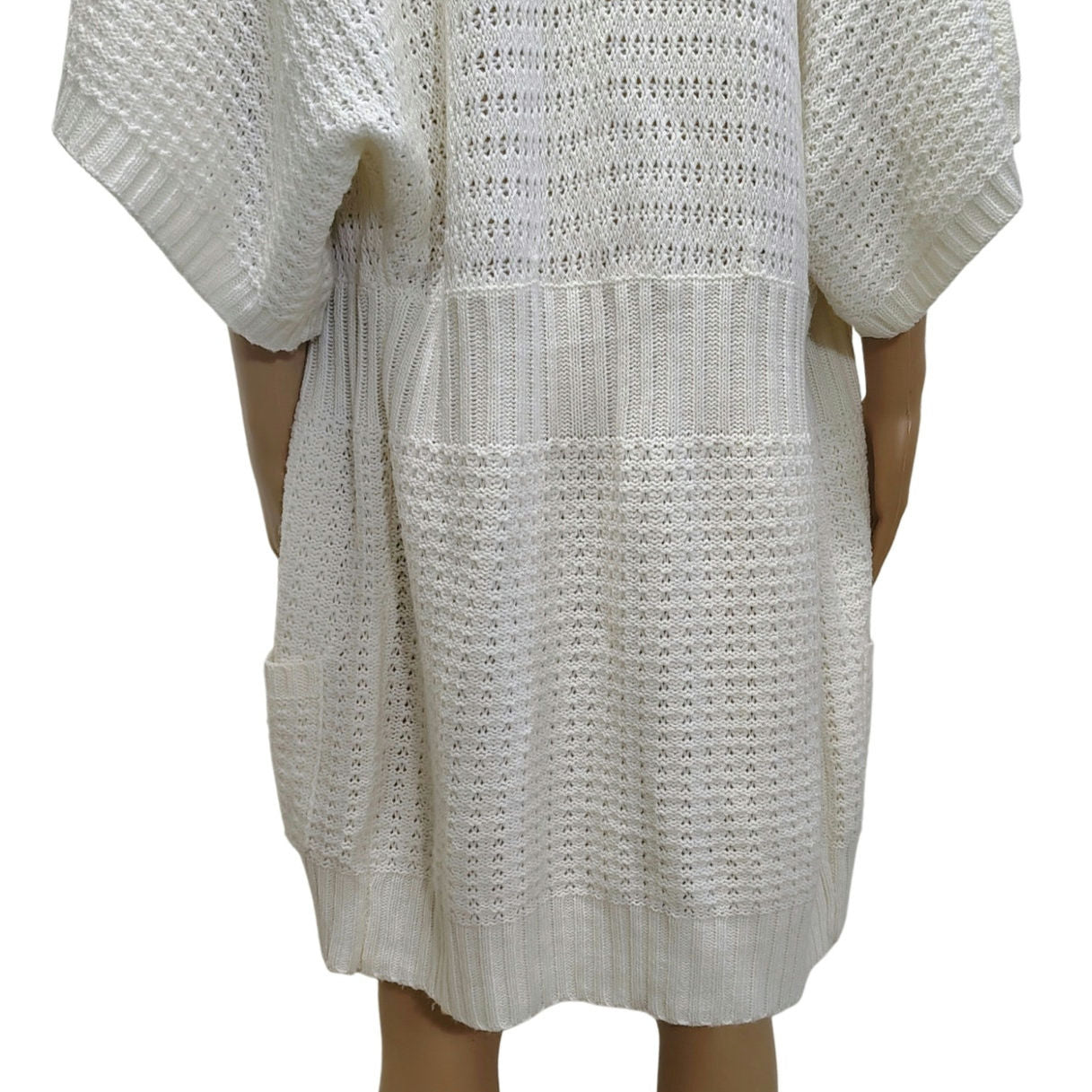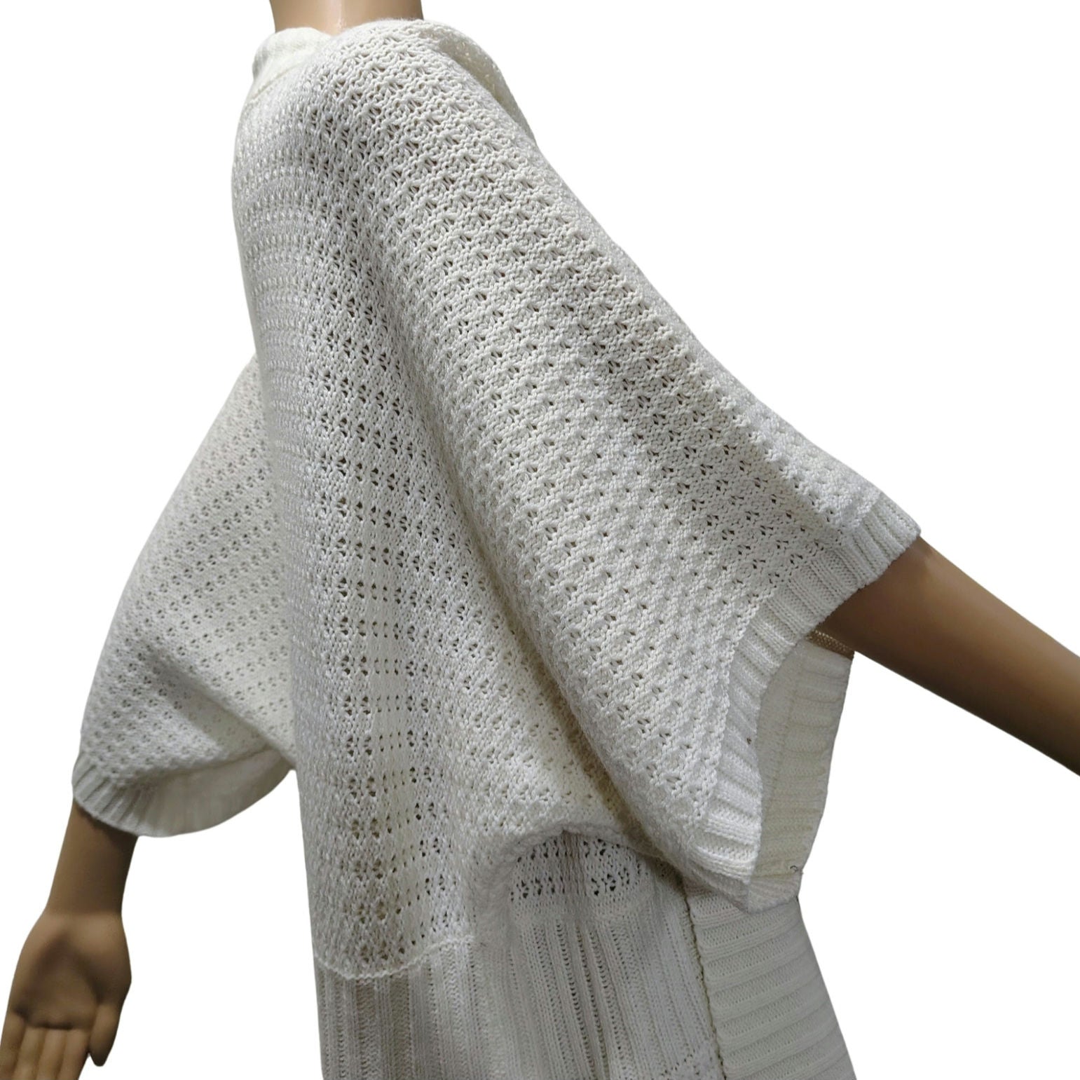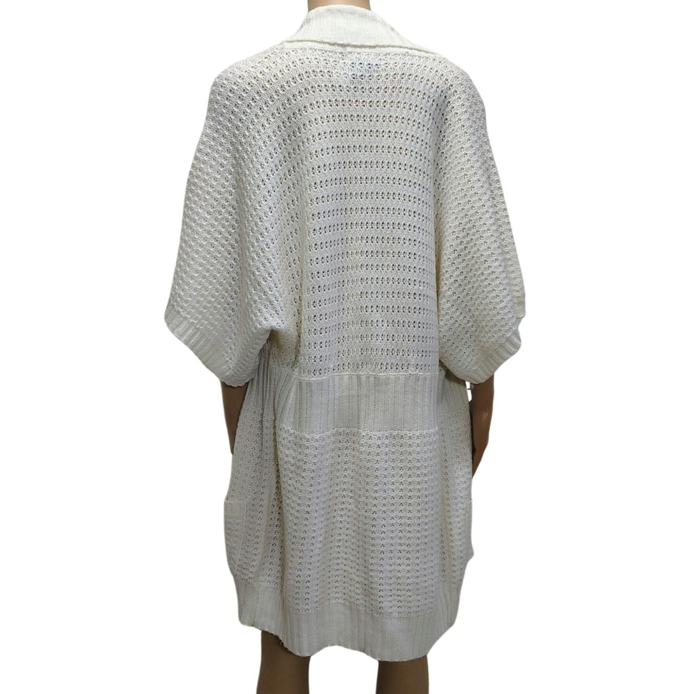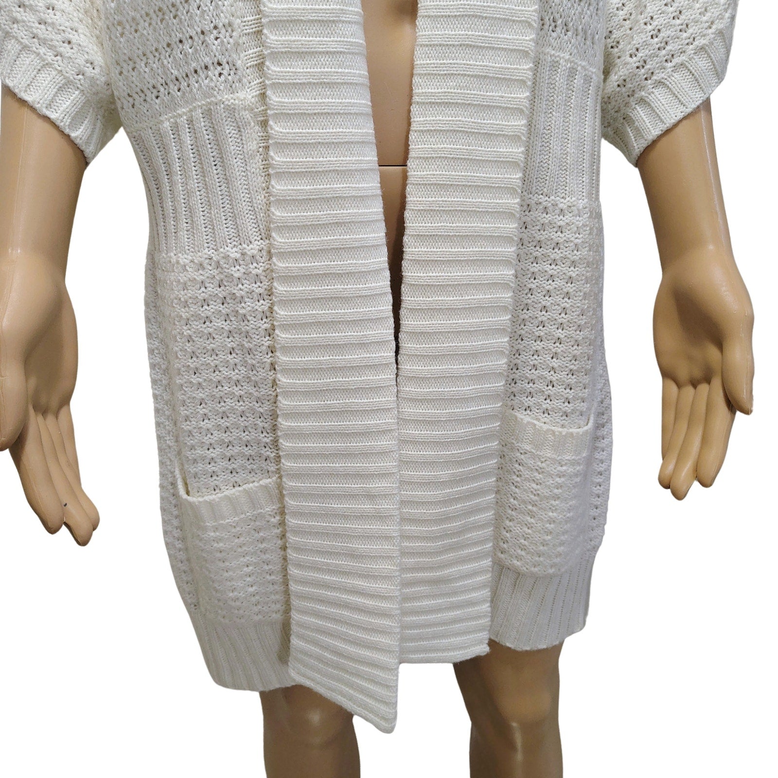 1990s Knit Wool Cardigan Cream Long Boho Open Front Short Sleeve Sweater Size L