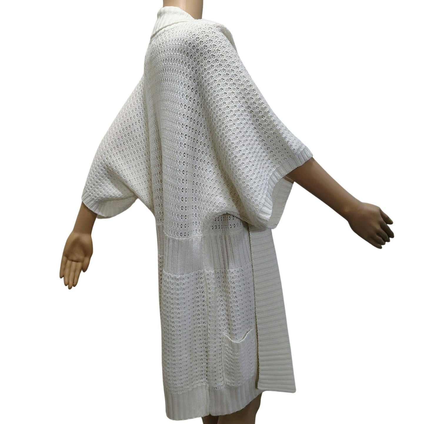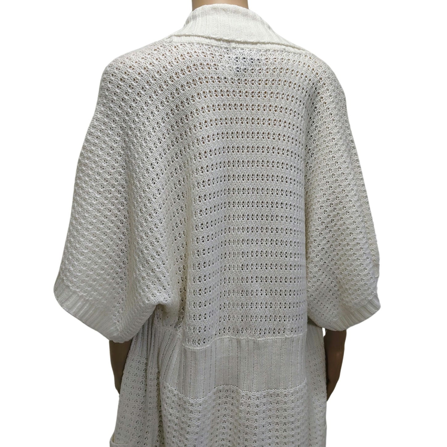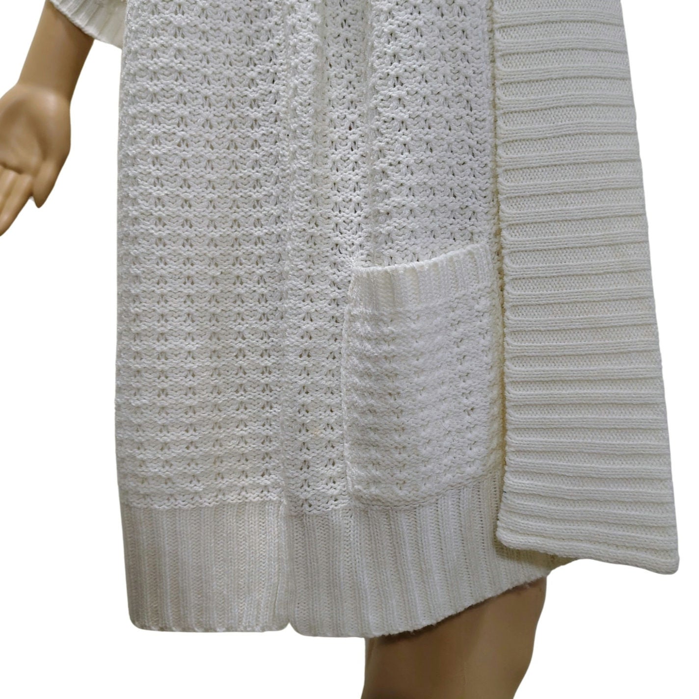 1990s Knit Wool Cardigan Cream Long Boho Open Front Over Sized Sweater. 2 Lower Front Pockets. Ribbed edges and collar. Fills over collar extends down to the edges. Wide sleeves. Ribbed waist.