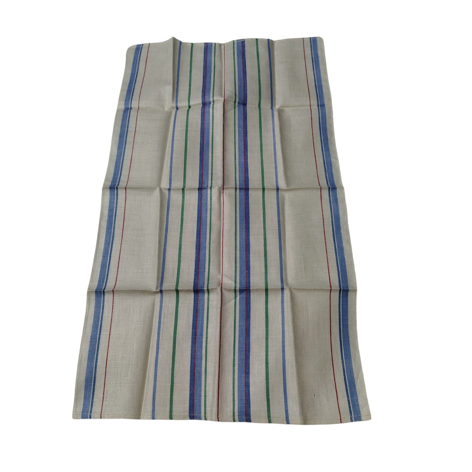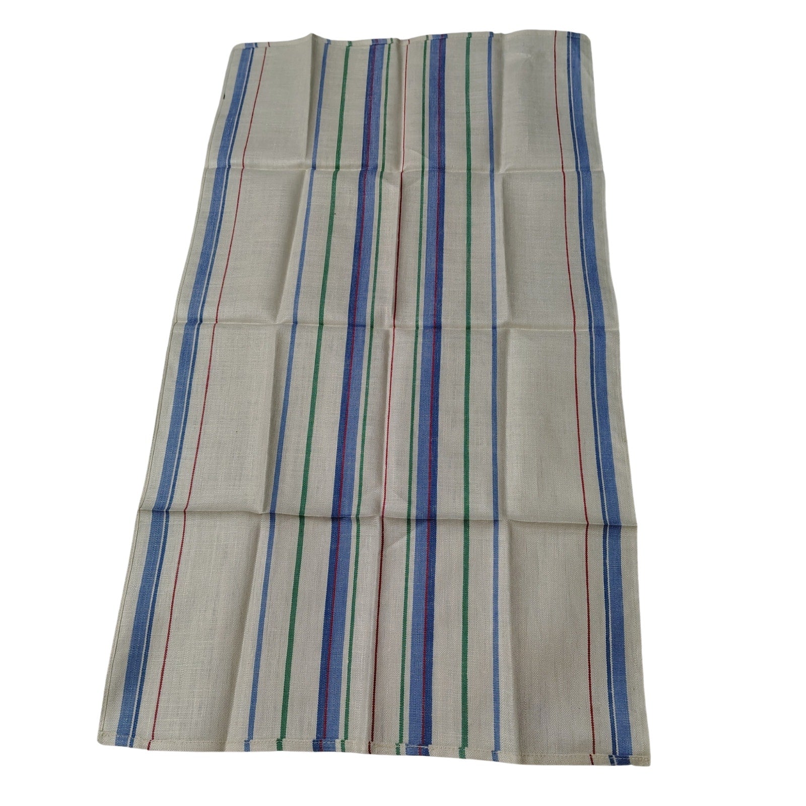 40s 50s Pure Linen Striped Tea Towel Unused French Tea Towel Blue Red Green Stripes on Cream Background