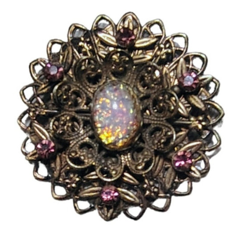 1950s Mid Century Vintage Pink Opalescent Confetti Aurora Borealis Cabochon with Size Purple Rhinestone on Gold Tone Filigree Pin Brooch.