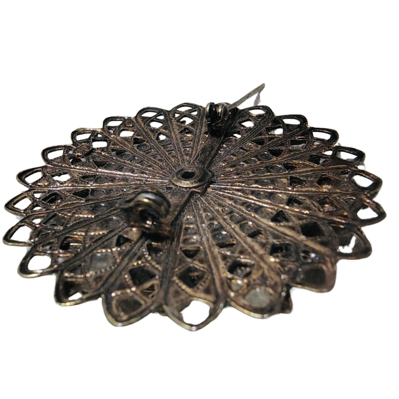 1950s Mid Century Vintage Pink Opalescent Confetti Aurora Borealis Cabochon with Size Purple Rhinestone on Gold Tone Filigree Pin Brooch